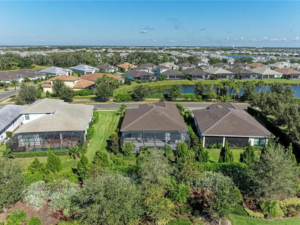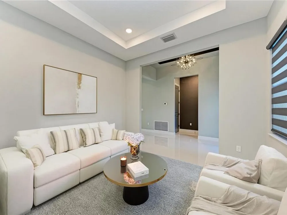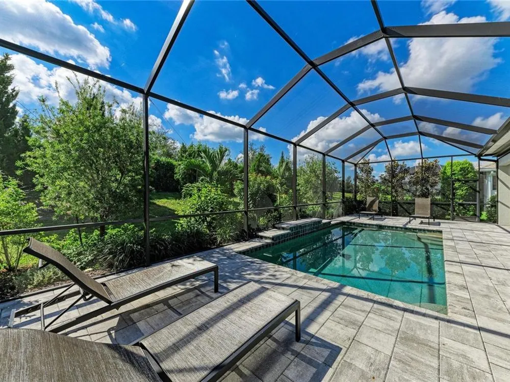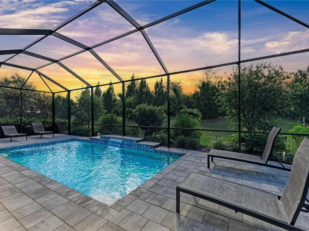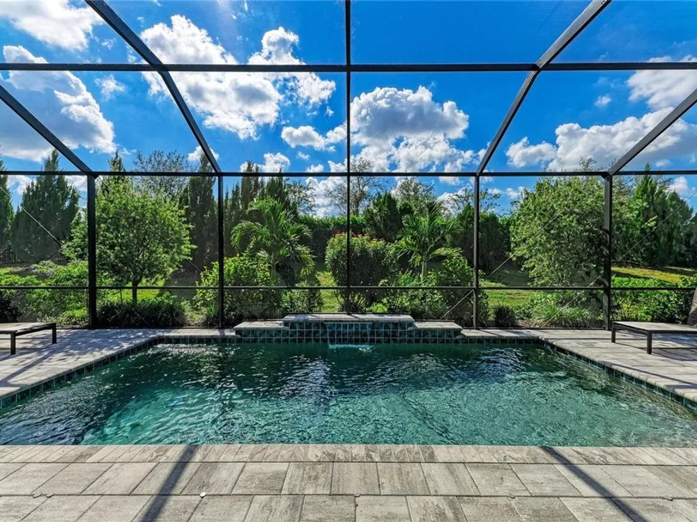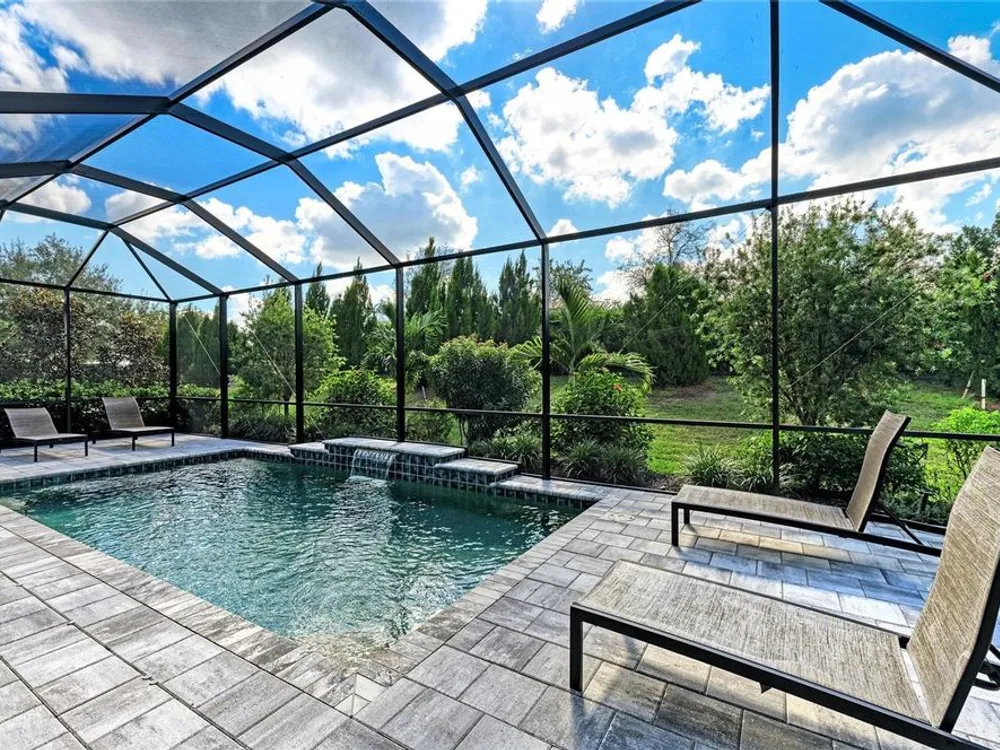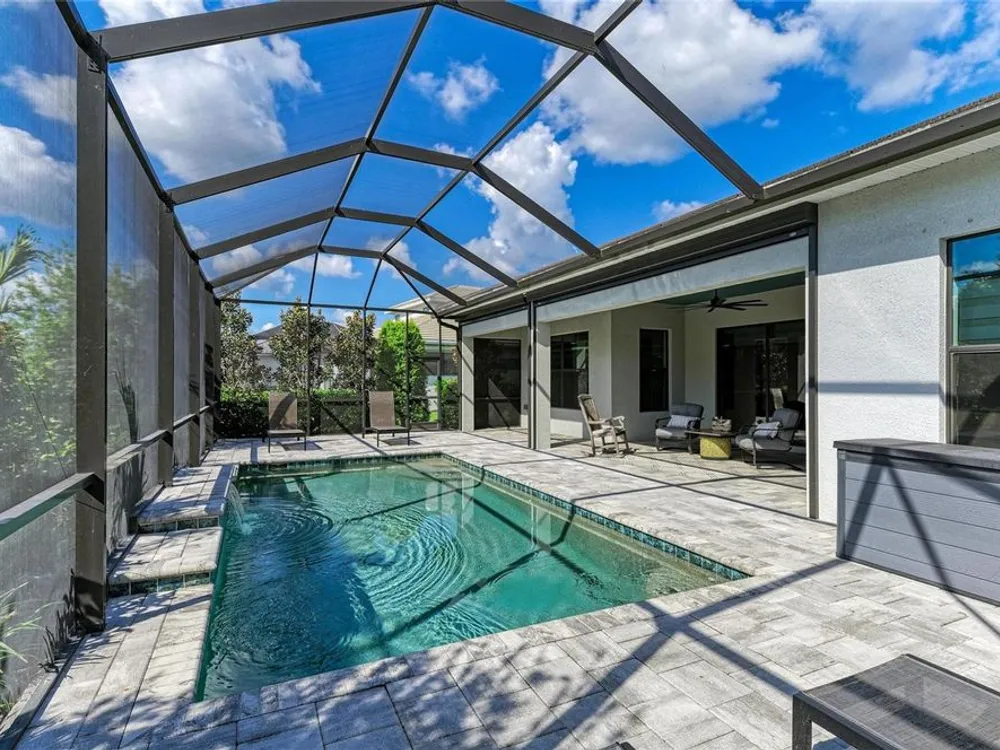 Imagine waking up each morning to the soft sounds of nature — coffee in hand, sitting beneath the covered lanai as sunlight dances off the waterfall spilling into your private pool. The only thing more serene than the view is knowing that everything — from the lawn to the high-speed internet — is already taken care of. This is the effortless Florida lifestyle waiting for you in Cresswind, Lakewood Ranch’s premier 55+ resort community. Step through custom glass entry doors into a light-filled home that strikes the perfect balance between elegant design and everyday comfort. The open-concept great room welcomes you with soaring tray ceilings, designer lighting, and a stunning custom-built entertainment wall featuring a 6-foot linear electric fireplace flanked by dual bookshelves. A wall-mounted TV (included) creates a ready-to-enjoy gathering space that seamlessly connects to the chef-inspired kitchen — complete with quartz countertops, graphite cabinetry, a beverage cooler, upgraded pantry, and built-in appliances. The primary suite offers a tranquil retreat overlooking the pool, with a spa-like bath featuring a walk-in shower with bench, dual raised vanities, and a spacious custom closet. Two additional guest bedrooms and a private den provide flexibility for visiting family, hobbies, or a home office (with a wall-mounted TV included). Every inch of this home is curated with thoughtful detail — from designer fans and window treatments to brass-trim floor outlets and upgraded plumbing fixtures. Outside, your personal oasis awaits. A 12’x24’ heated, lighted pool with waterfall anchors the expanded lanai, where motorized hurricane screens offer instant protection and privacy. The outdoor TV (included) and under-roof living space make it ideal for entertaining year-round. Beyond the lanai, lush 360° landscaping and paver driveway set the tone for timeless curb appeal — all maintained by the HOA. Even the garage impresses with an epoxy floor, insulated door, backup opener, steel storage racks and cabinets — perfect for your Florida lifestyle essentials. As a resident of Cresswind at Lakewood Ranch, you’ll enjoy access to a vibrant active-adult community designed for connection and wellness: resort-style and resistance pools, tennis and pickleball courts, fitness center, walking trails, arts studio, dog parks, food truck nights, and a full-time lifestyle director. All just minutes from the shopping, dining, and beaches that make Lakewood Ranch the #1 multi-generational community in the U.S. Why wait to start living your best Florida life? This home is the perfect blend of sophistication, low-maintenance living, and resort-level amenities — ready for you to move in and start making memories today. Home is virtually staged.