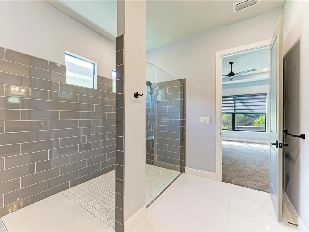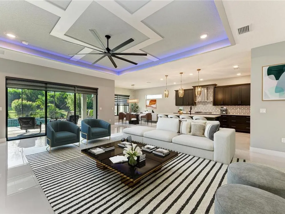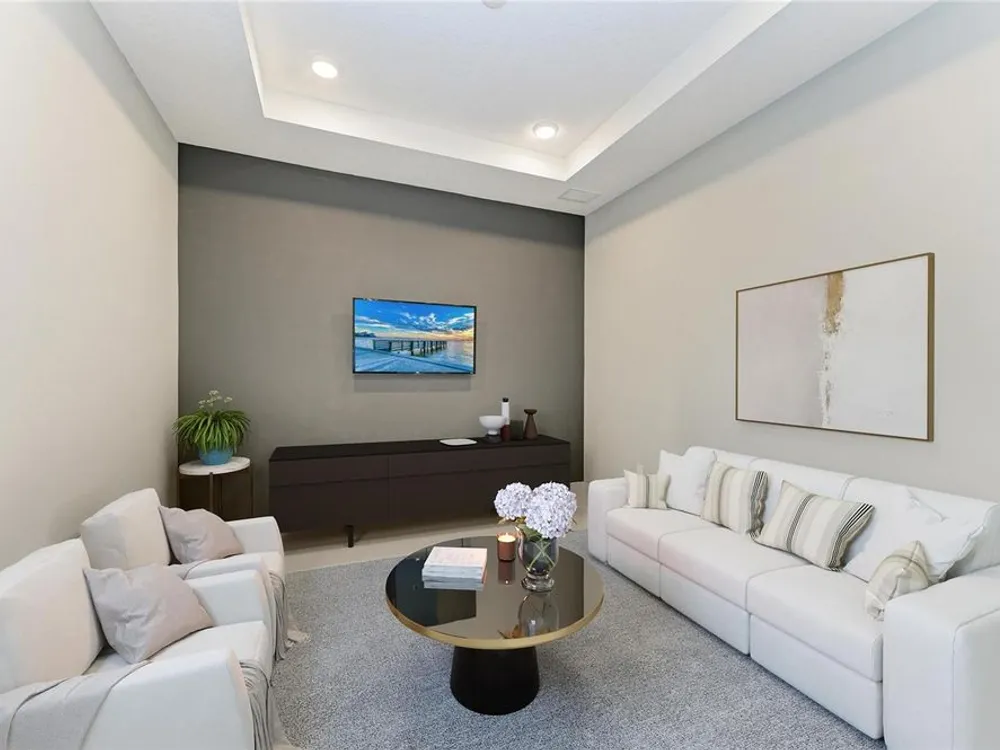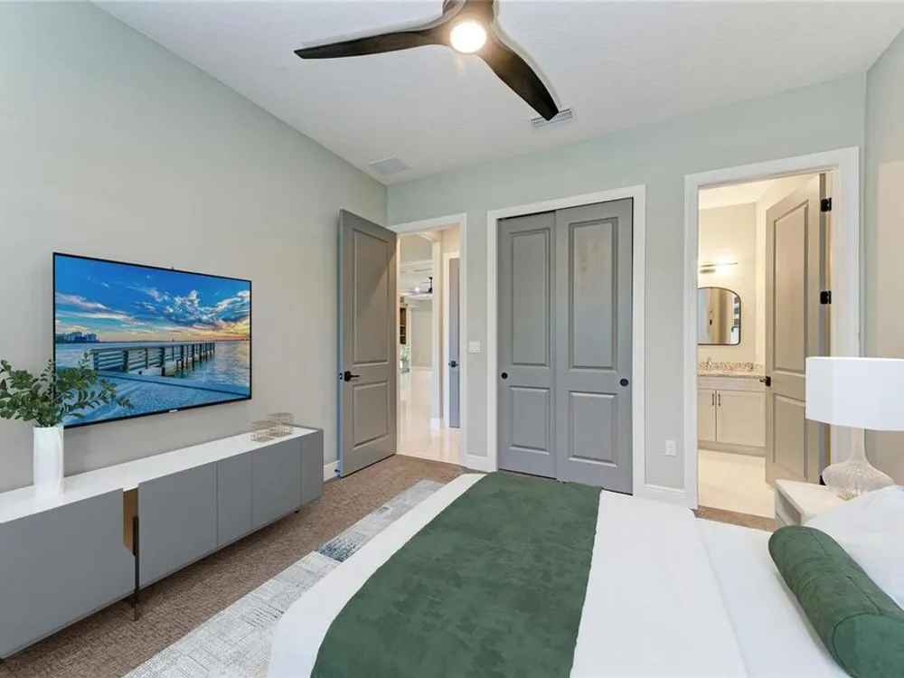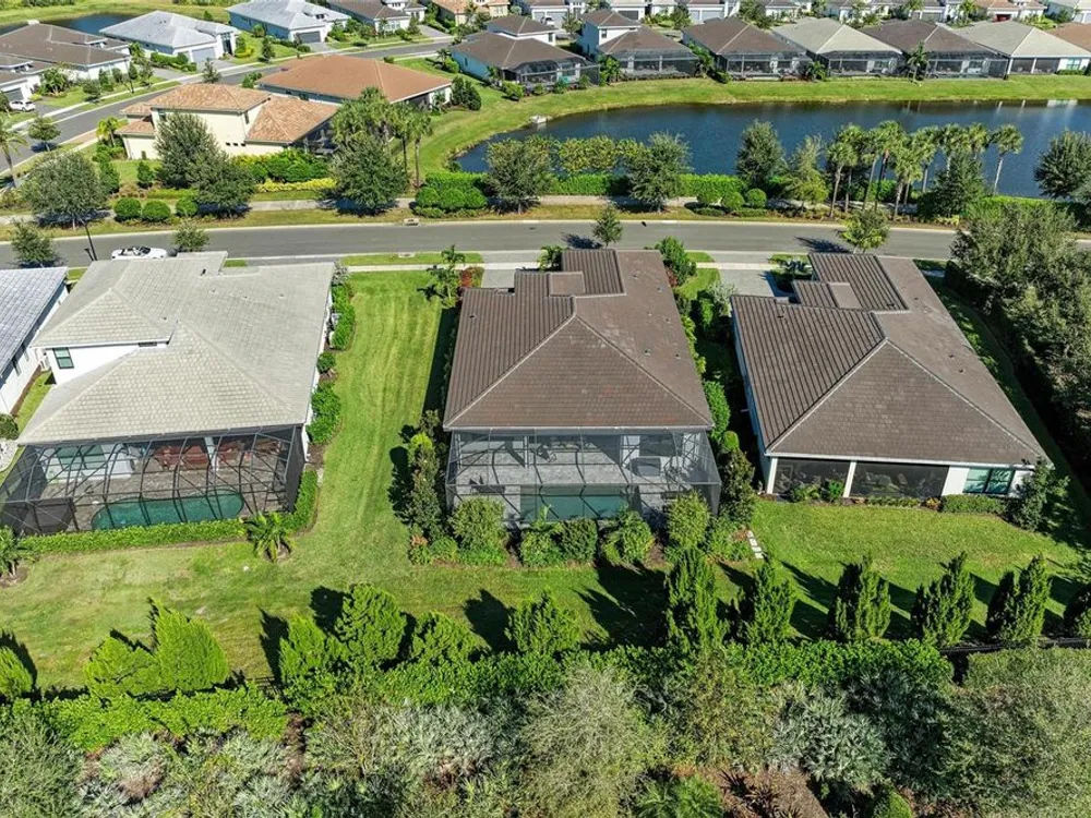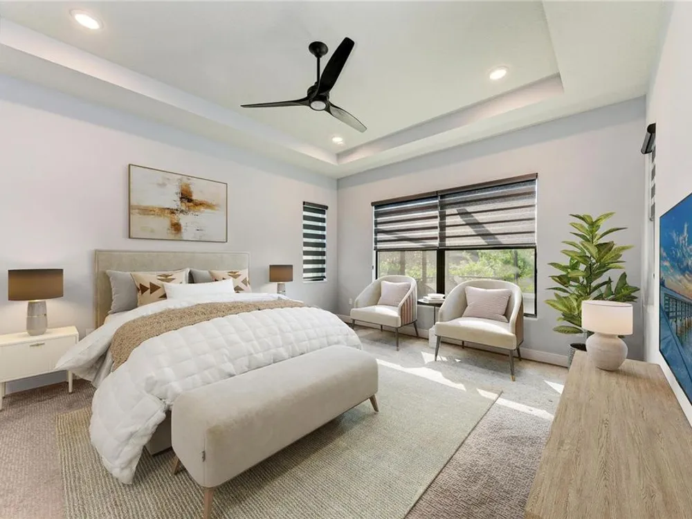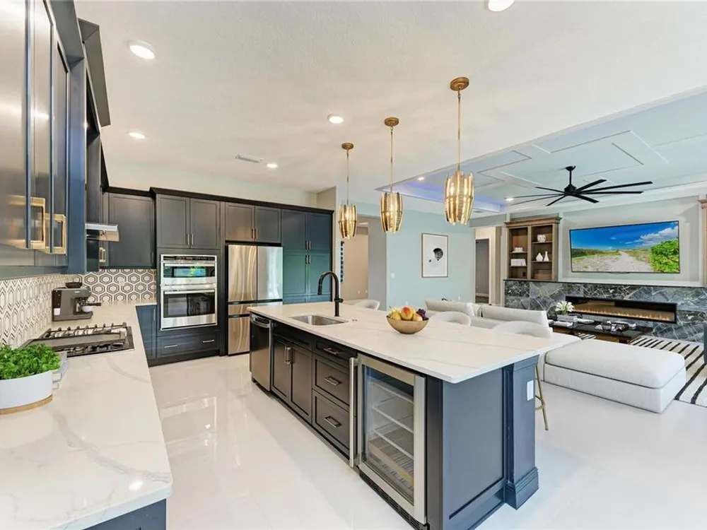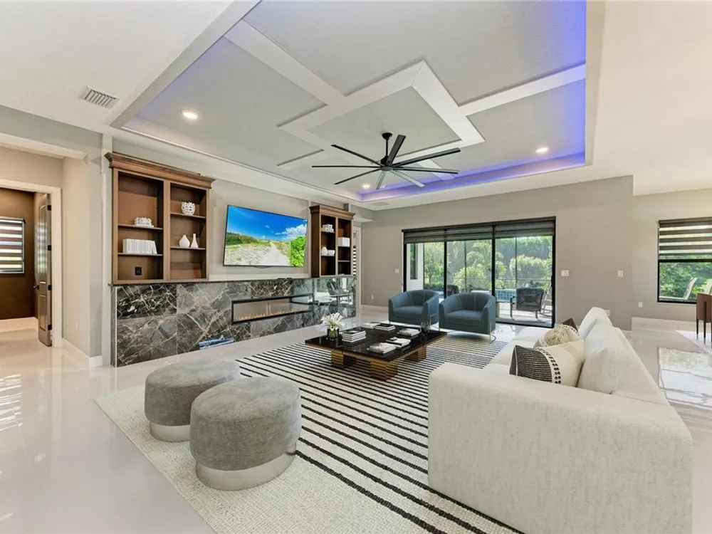 Imagine waking up each morning to the soft sounds of nature — coffee in hand, sitting beneath the covered lanai as sunlight dances off the waterfall spilling into your private pool. The only thing more serene than the view is knowing that everything — from the lawn to the high-speed internet — is already taken care of. This is the effortless Florida lifestyle waiting for you in Cresswind, Lakewood Ranch’s premier 55+ resort community. Step through custom glass entry doors into a light-filled home that strikes the perfect balance between elegant design and everyday comfort. The open-concept great room welcomes you with soaring tray ceilings, designer lighting, and a stunning custom-built entertainment wall featuring a 6-foot linear electric fireplace flanked by dual bookshelves. A wall-mounted TV (included) creates a ready-to-enjoy gathering space that seamlessly connects to the chef-inspired kitchen — complete with quartz countertops, graphite cabinetry, a beverage cooler, upgraded pantry, and built-in appliances. The primary suite offers a tranquil retreat overlooking the pool, with a spa-like bath featuring a walk-in shower with bench, dual raised vanities, and a spacious custom closet. Two additional guest bedrooms and a private den provide flexibility for visiting family, hobbies, or a home office (with a wall-mounted TV included). Every inch of this home is curated with thoughtful detail — from designer fans and window treatments to brass-trim floor outlets and upgraded plumbing fixtures. Outside, your personal oasis awaits. A 12’x24’ heated, lighted pool with waterfall anchors the expanded lanai, where motorized hurricane screens offer instant protection and privacy. The outdoor TV (included) and under-roof living space make it ideal for entertaining year-round. Beyond the lanai, lush 360° landscaping and paver driveway set the tone for timeless curb appeal — all maintained by the HOA. Even the garage impresses with an epoxy floor, insulated door, backup opener, steel storage racks and cabinets — perfect for your Florida lifestyle essentials. As a resident of Cresswind at Lakewood Ranch, you’ll enjoy access to a vibrant active-adult community designed for connection and wellness: resort-style and resistance pools, tennis and pickleball courts, fitness center, walking trails, arts studio, dog parks, food truck nights, and a full-time lifestyle director. All just minutes from the shopping, dining, and beaches that make Lakewood Ranch the #1 multi-generational community in the U.S. Why wait to start living your best Florida life? This home is the perfect blend of sophistication, low-maintenance living, and resort-level amenities — ready for you to move in and start making memories today. Home is virtually staged.