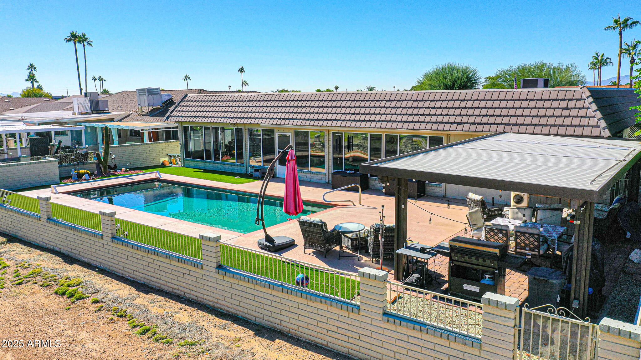 Don't Miss This Castillo Model Home On The Golf Course With A Pool, In Sun City! From The Moment You Enter The Private Front Courtyard, You'll Feel The Charm Of This Property. Step Inside And You're Greeted With A Bright, Open-Concept Living Space, Walls Have Been Removed To Create An Expansive Flow, And You Can See Straight Through The Home To The Stunning Golf Course View. This Desirable Split Floor Plan Places The Primary Suite On One Side Of The Home And The 2 Guest Bedrooms And Bath On The Other, Offering Privacy For Everyone. The Primary Bedroom Is Spacious And Features Two Walk-In Closets And Doors To The AZ Room. The Kitchen Is A Galley Layout, And Has Been Updated With Appliances Cabinets And Countertops, And Excellent Workspace. Just Of The Living Room You'll Find A Dining Area Plus Two Bonus Rooms. Adaptable For Hobbies, An Office, Or Additional Lounging. At The Back Of The Home, You'll Love The Massive Arizona Room With Panoramic Views Of The Pool And Golf Course. This Space Is Heated And Cooled With A Mini-Split System, Making It Comfortable Year-Round. Step Outside To Your Personal Retreat: A Sparkling Pool, Surrounded By Patio Space, Plus A Large Gazebo Offering Shade And Relaxation. There Is So Much To Enjoy Here, Views, Privacy, Entertaining Space, And A Fantastic Layout. Be Sure To Stop By And See This One Soon!