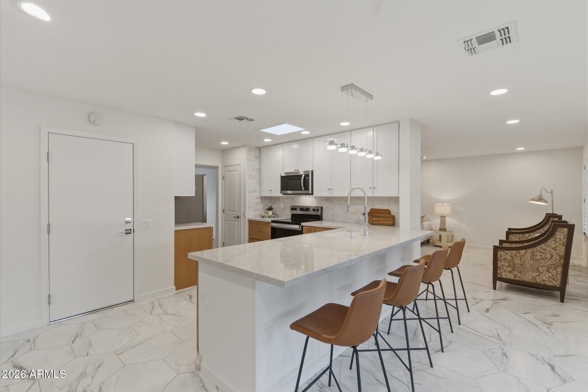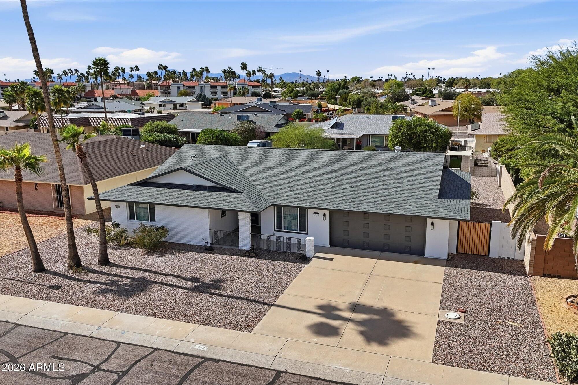 Extensively remodeled 2025-2026 in PH 3 of Sun City, this move-in ready 2-bed, 2-bath home delivers quality, comfort, and carefree 55+ living. New roof, skylight, heat pump, with warranties, dual-pane windows, added insulation, updated plumbing and lighting throughout. Quartz kitchen with custom cabinetry, new stainless appliances, and beverage bar. Marble bath counters, comfort-height vanities, custom step-in tile showers with rainfall heads and handhelds. Porcelain tile floors-no carpet, no popcorn, no shortcuts. Walk-in closets, screened patio, block-enclosed yard, flexible laundry/den, and 2-car garage. Close to golf, recreation centers, and amenities that make Sun City one of AZ's premier 55+ communities. Just unpack and enjoy the lifestyle you've earned. Owner/Agent IMPROVEMENTS Oct 2025 - Feb 2026: - New roof, underlayment, skylight - New Heat Pump Pkg (AC and heat) 4 ton, 14 SEER, partial ductwork - New dual pane windows, sliders with integral blinds, fire rated garage door. - New attic insulation - New outlets, switches, USB ports, lighting - All new porcelain tile flooring - New baseboards, door casing - New interior doors, hinges and hardware - New kitchen cabinets, quartz counters, sink, faucet, disposal - New toilets, sinks, faucets, interior water lines -All new appliances including stackable laundry center and utility sink. - New paint inside and out - Permitted block wall add for fully enclosed backyard - Home warranty included This nearly new home is ready for you!