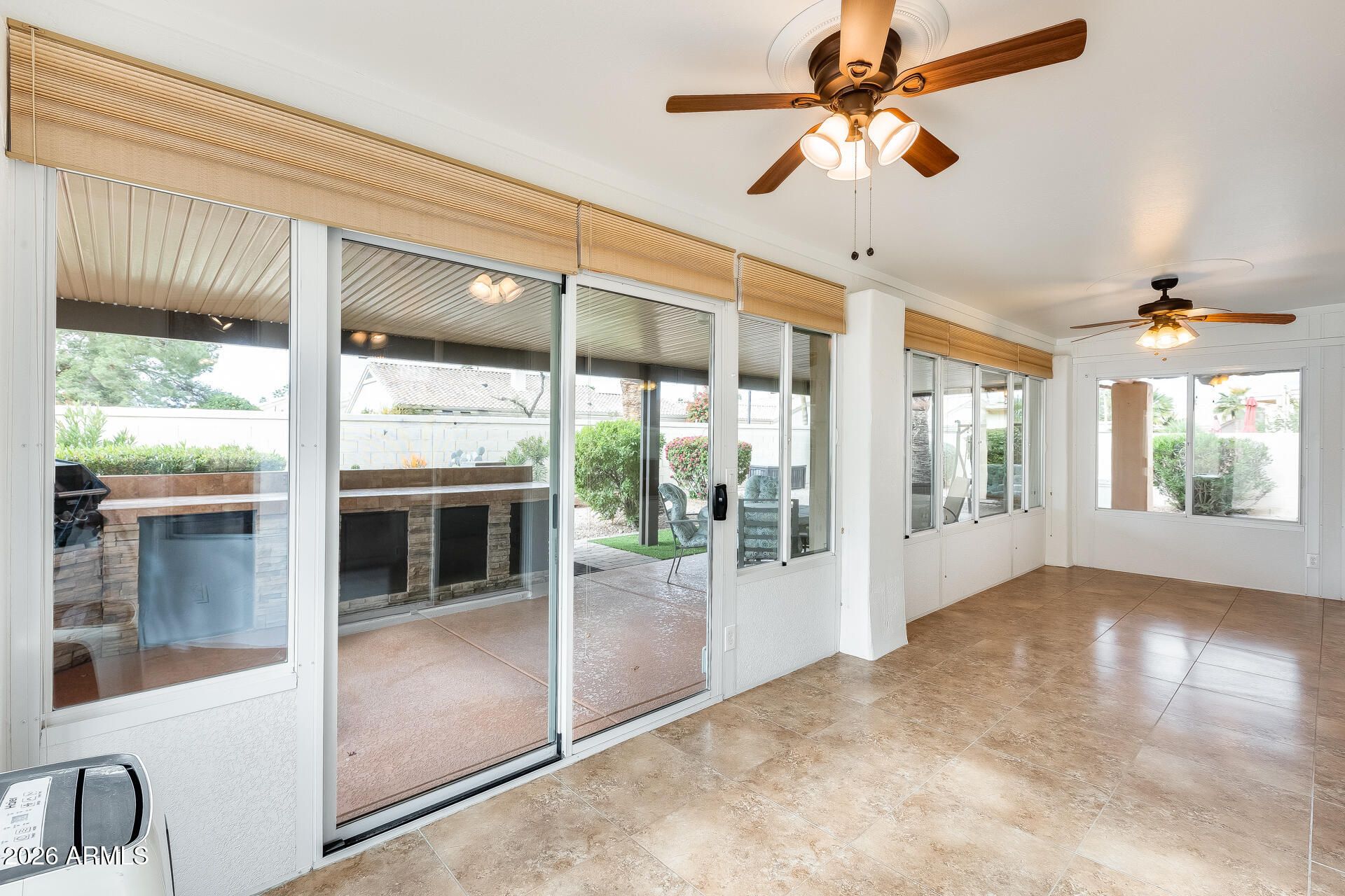 Square footage includes enclosed House (1287) sun room (327)and Casita (296). Great home with casita and PAID FOR SOLAR. Many upgrades to this home! Over the last approximate 6 year upgrades include - Roof underlayment, HVAC Tile and laminate flooring, kitchen cabinets, enclosed patio, Patio extension cover & house interior paint to name a few! Awesome built-in Grilling station, mister system, Rain gutters too. Coated garage floor and plenty of cabinets. This is truly a gem you will not want to miss in Gated Sun Village Resort Community.