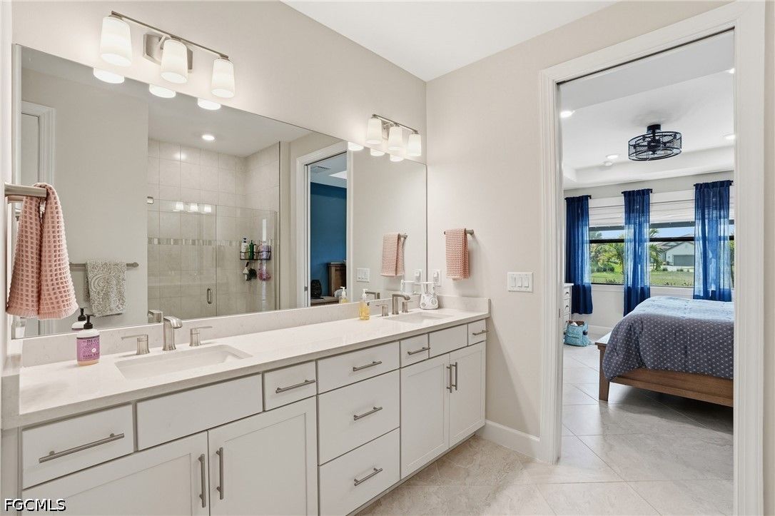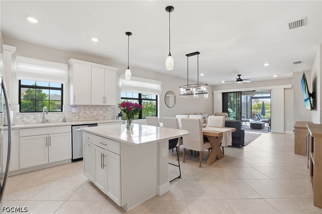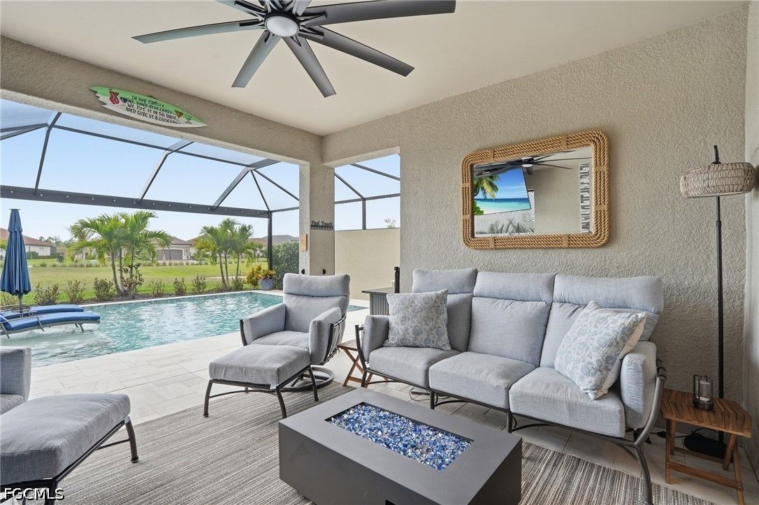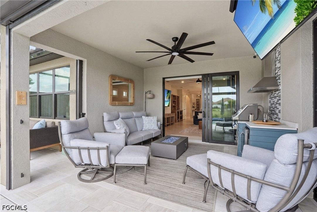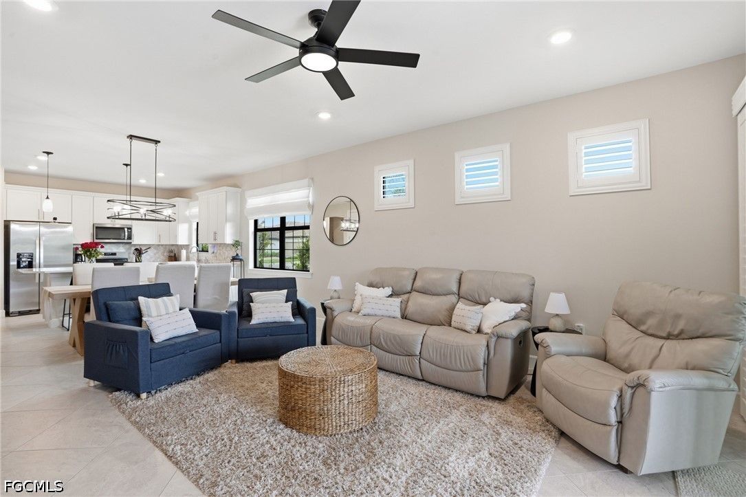 This Esplanade Lake Club villa is loaded with upgrades and offers a functional layout with 2 bedrooms, a den, 2 bathrooms, and 1,579 sq ft of living space, all with tile flooring throughout. The open-concept kitchen and living areas flow directly to the outdoor space, featuring an 18’ x 22’ saltwater pool with a sun shelf and gas heater, covered lanai, outdoor kitchen with natural gas, and a fire pit—set up for both everyday use and entertaining. The covered lanai is also equipped with Storm Smart shutters, providing added protection and shade when needed. With western rear exposure, the backyard gets strong afternoon sun and sunset views. The home also includes a whole-house Generac 10kW generator and hurricane shutters along the rear for additional protection. Situated on a corner lot, it offers additional privacy and usable outdoor space. Inside, the home is equipped with natural gas for cooking, and the garage includes four 8’ x 4’ overhead hanging storage racks for added organization. Esplanade Lake Club is centered around Lake Como and features a lakeside clubhouse, resort-style pool and spa, fitness center, tennis, pickleball, and bocce courts, plus waterfront dining and a full-service bar. Residents also enjoy walking and biking trails, kayaking, and a full calendar of community events. Located approximately 25 minutes to Southwest Florida’s Gulf beaches and just minutes from RSW Airport, Florida Gulf Coast University, and Gulf Coast Town Center, this location provides convenient access to shopping, dining, and entertainment.