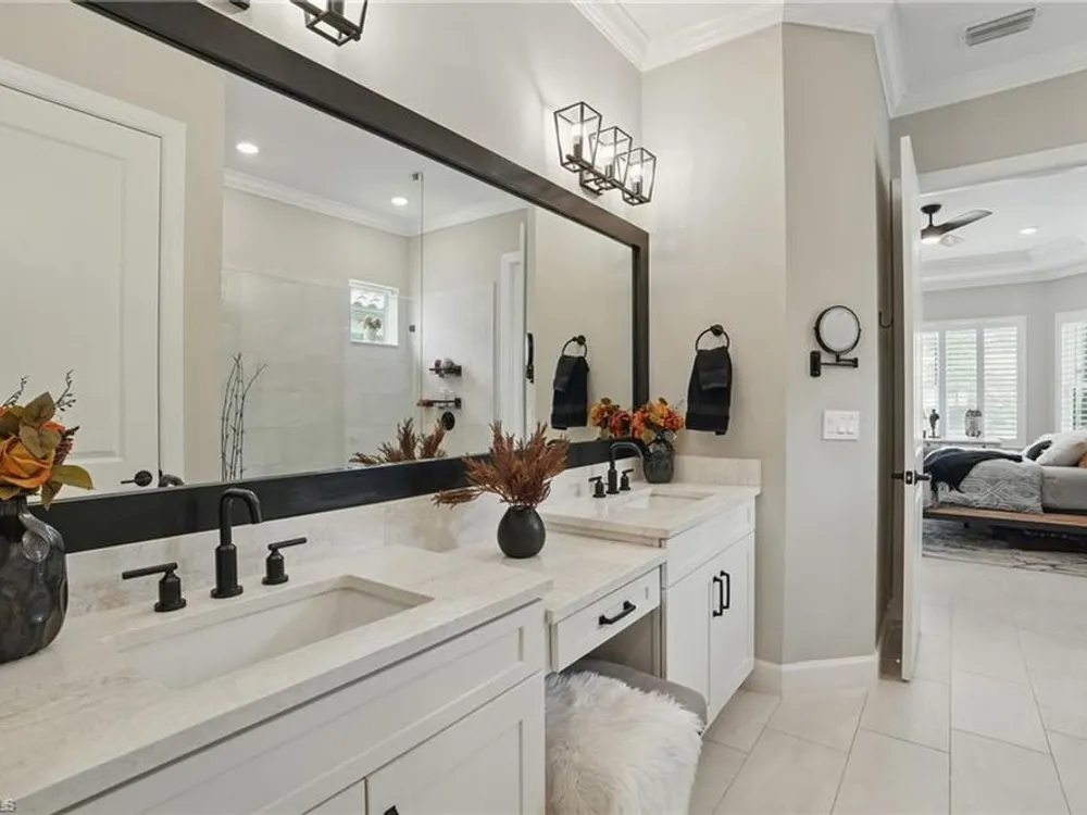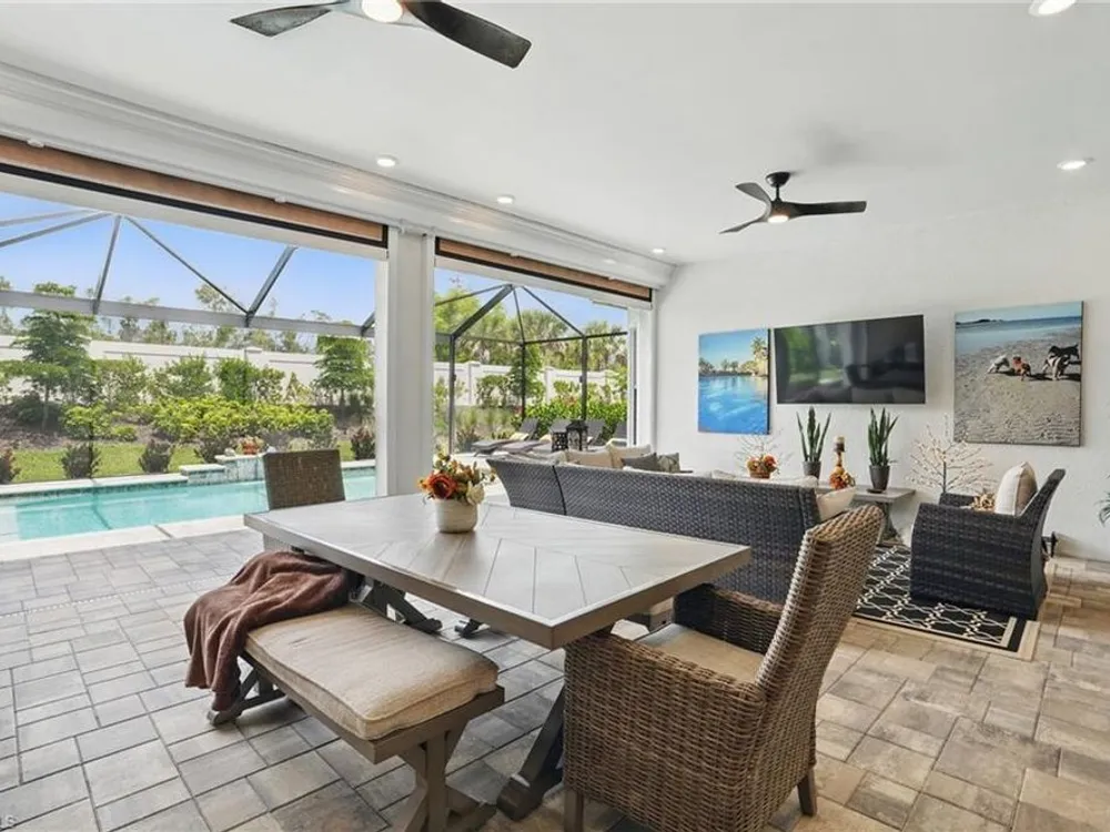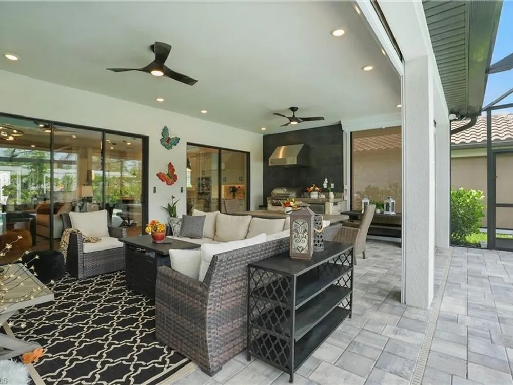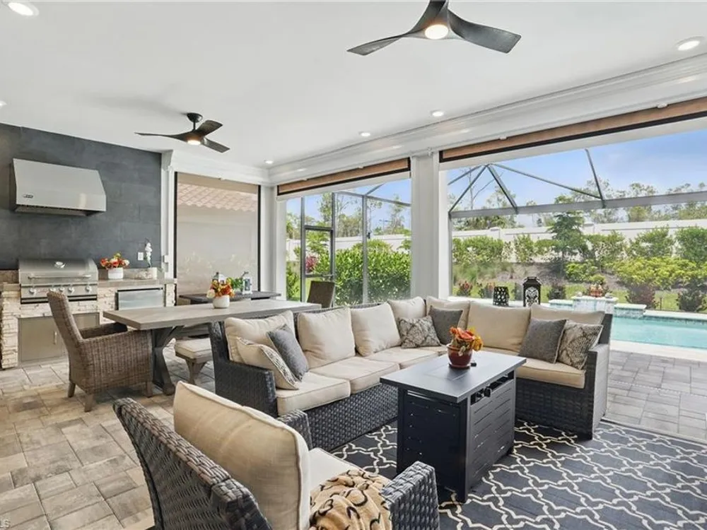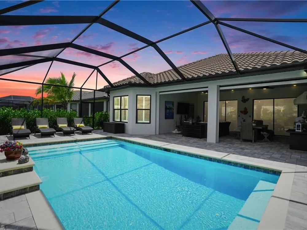 Welcome to 17467 Caravita Lane—where refined elegance meets resort-style living in the prestigious Esplanade Lake Club. This exceptional Lazio floor plan offers 3 bedrooms, a spacious den, 3 full bathrooms, and a 2-car garage, all perfectly positioned on a desirable eastern exposure homesite with tranquil sunrise views over your private pool oasis. Every inch of this residence has been thoughtfully curated with luxury in mind. Designer upgrades include plantation shutters, custom closet systems in every bedroom, high-end fixtures, and detailed trim work that exude sophistication. The chef’s kitchen flows effortlessly to an expansive living area and out to the fully equipped outdoor kitchen, ideal for entertaining. The lanai is a true retreat, featuring ambient pool lighting and hurricane-rated roll-down shutters for added peace of mind. Modern comforts include a whole-home water softener and reverse osmosis system, UV air purification integrated into the HVAC, and a whole-home generator—ensuring safety, comfort, and well-being. Located in one of Southwest Florida’s most coveted communities, Esplanade Lake Club offers an unparalleled lifestyle. Enjoy a world-class amenity center featuring a resort-style pool and spa, cabana bar & grill, spa treatment room, tennis, pickleball, bocce, two dog parks, concierge services, and a full social calendar designed to elevate everyday living. Just moments from RSW Airport, I-75, and premier shopping and dining, this property is more than a home—it’s a destination.