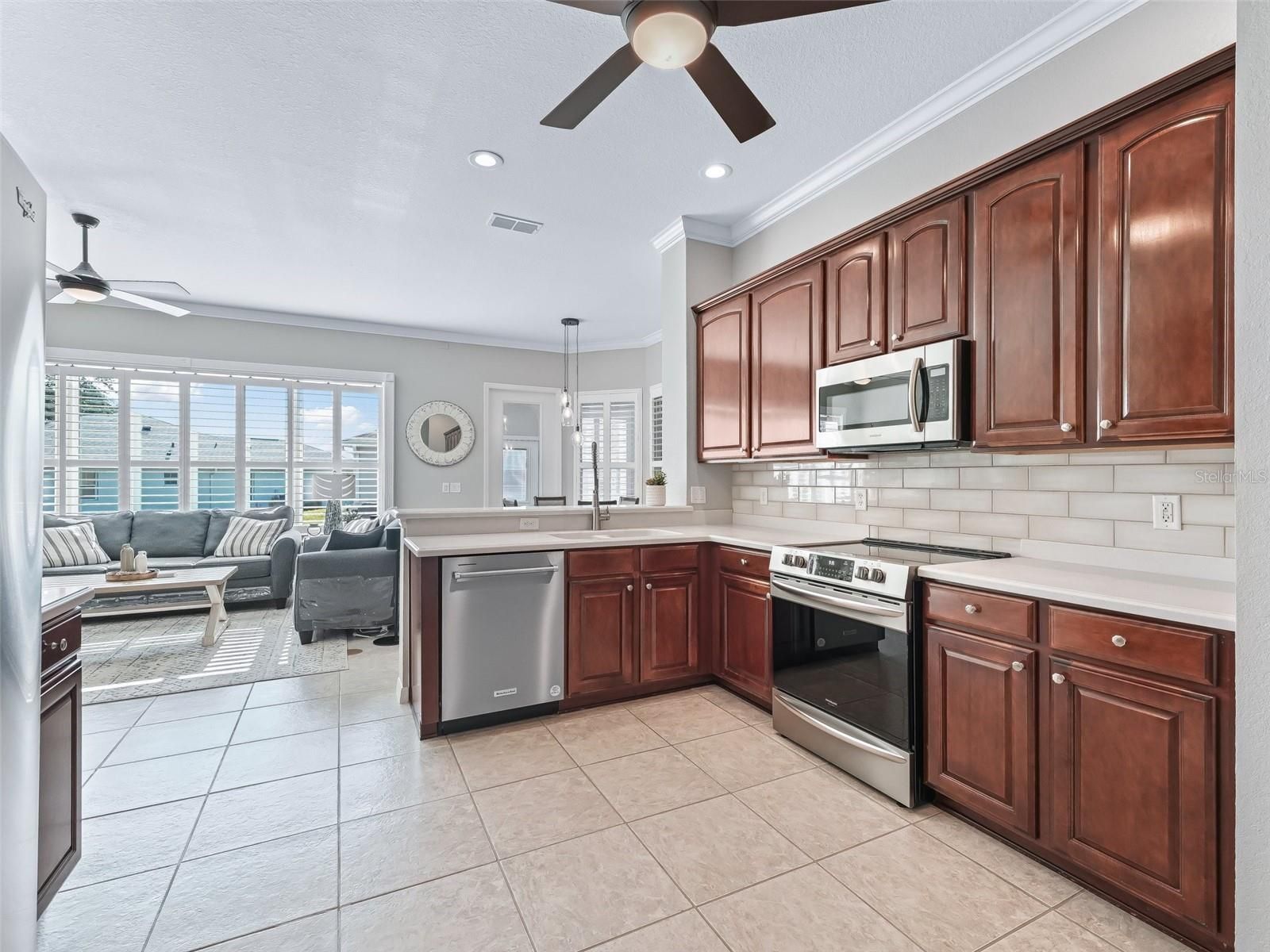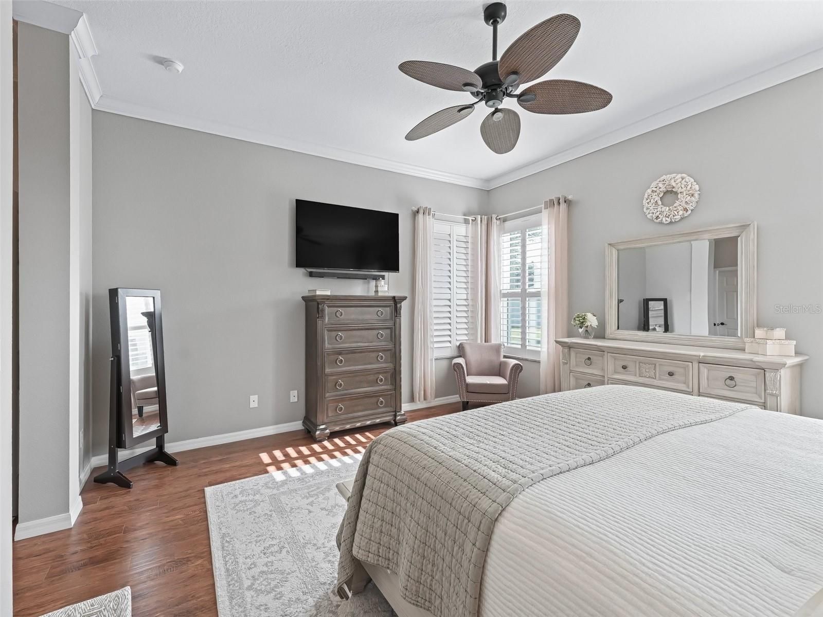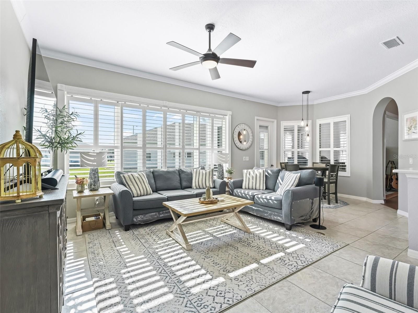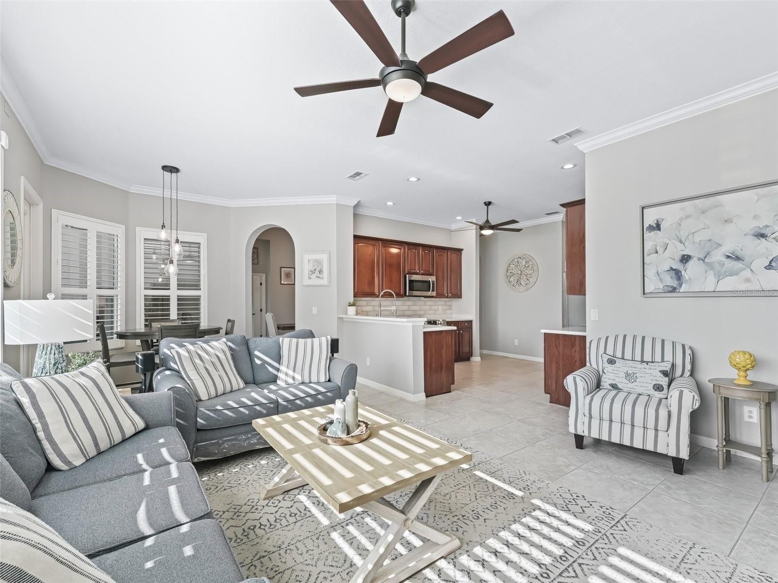 - Ceiling Fan(s), Crown Molding, Eat-in Kitchen, High Ceilings, Kitchen/Family Room Combo, Living/Dining Room, Open Floorplan, Solid Surface Counters, Solid-Wood Cabinets, Split Bedrooms, Thermostat, Walk-In Closet(s), Window Treatments