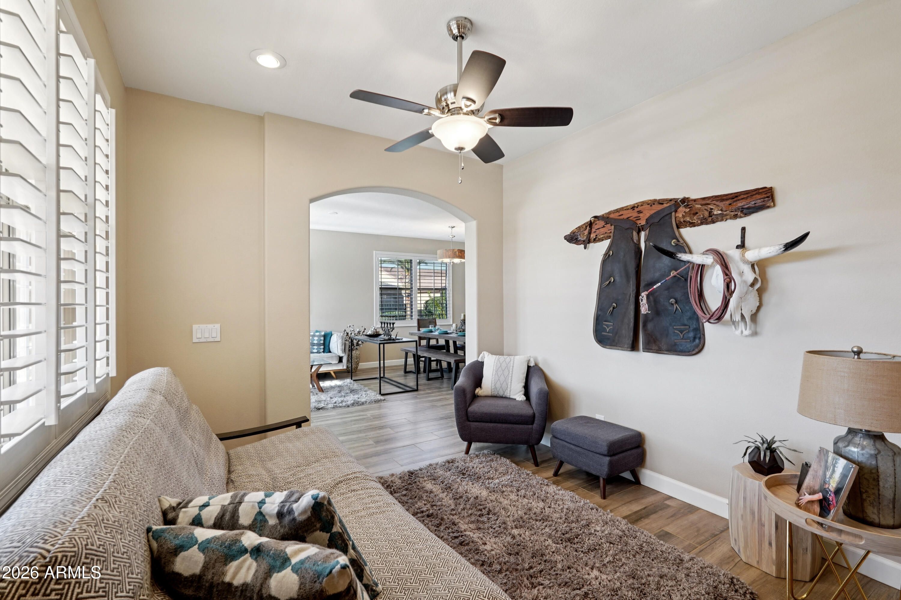 Located in the guard-gated 55+ Arizona Traditions community, this corner-lot 2 bed + den, 2 bath home offers 1,800 sq ft of comfortable, resort-style living. Enjoy access to a championship golf course, clubhouse, heated pools, fitness center, pickleball, tennis, and an active social lifestyle. Inside, the home features a cozy front porch, spacious living area with room for dining, and a custom-built-in with accent lighting. The den/office is conveniently located off the living room. The kitchen includes granite countertops, white cabinetry with crown molding, stainless Whirlpool appliances, breakfast bar, and breakfast nook, opening to the family room with a gas fireplace. The large owner's suite offers dual sinks, a walk-in shower, and a private water closet. A generous second bedroom and bath, oversized laundry room with extra space, and a garage with built-in storage cabinets add to the home's appeal. Affordable solar lease helps keep energy costs low.