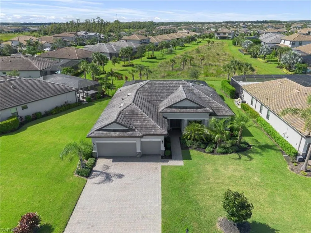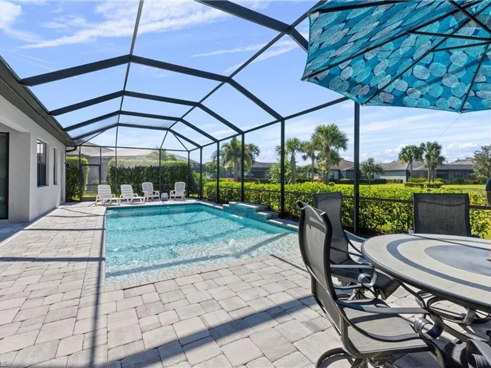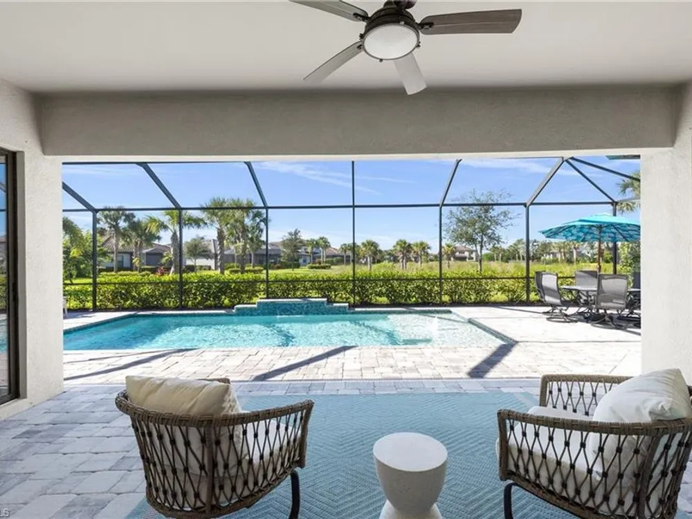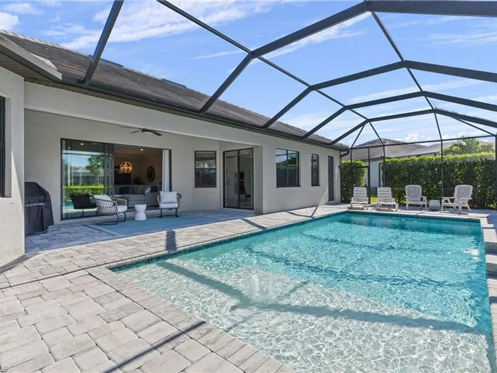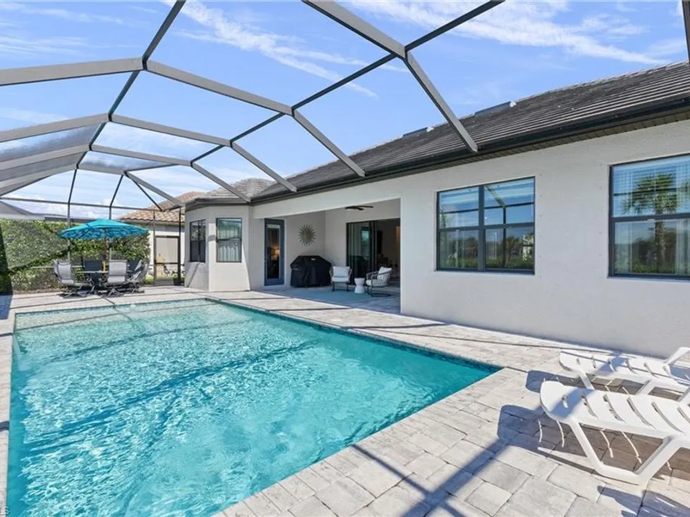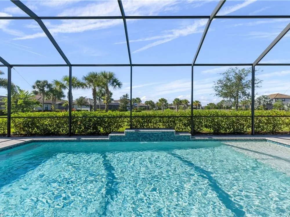 Live like you are on vacation all year round! Resort style amenities here at the gated community of THE PLACE AT CORKSCREW. The sliding glass doors intermingle the indoor/outdoor for your entertainment needs opening to an outdoor oasis. Screened-in, covered lanai showcases the cascading waterfall into the CUSTOM POOL with bubblers & enhanced lighting. LONG & WIDE driveway leads to the 3 CAR GARAGE. The open floor plan welcomes you to the 3-4 bedrooms, den/office, 2 ½ baths (inc a newly remodeled pool bath!). Designed for flexibility, the 4th bedroom with French doors can easily transform into a home office or media room. 2 of the bedrooms have connected bathrooms perfect for the mother in law or teen. The spacious primary retreat offers direct pool/patio access, plus en-suite bath offering dual vanities, sep tub & shower. Large walk-in closet. Gourmet white kitchen with plenty of storage & features an oversized island with granite counters, formal dining + informal (with doors to pool for easy grilling). This 2019 'smart home' has top of the line high-tech appliances including the refrigerator with coffee maker, glass top stove & oven with air fryer. Top notch upgrades: crown molding, trayed ceilings & neutral hues throughout. Amenities at The Place include Resort Pool With 100ft Waterslide, Indoor Restaurant, Bourbon Bar, Cafe, Outdoor Bar, Fitness Center, Movement Studio, Fitness Classes, Tennis, Pickleball, Bocce, Basketball, Playground, Dog Park, Child Care, Spa Services. Shopping (Publix) & dining less than 2 miles away.