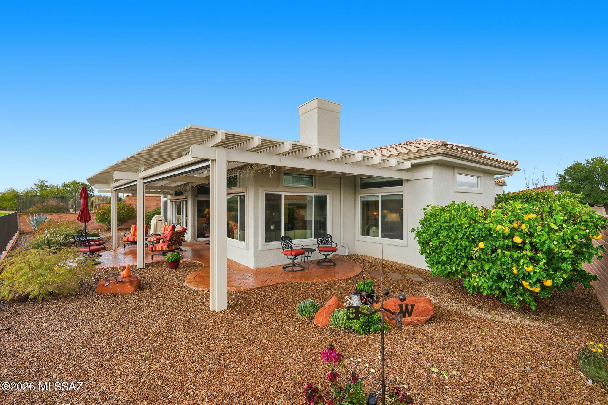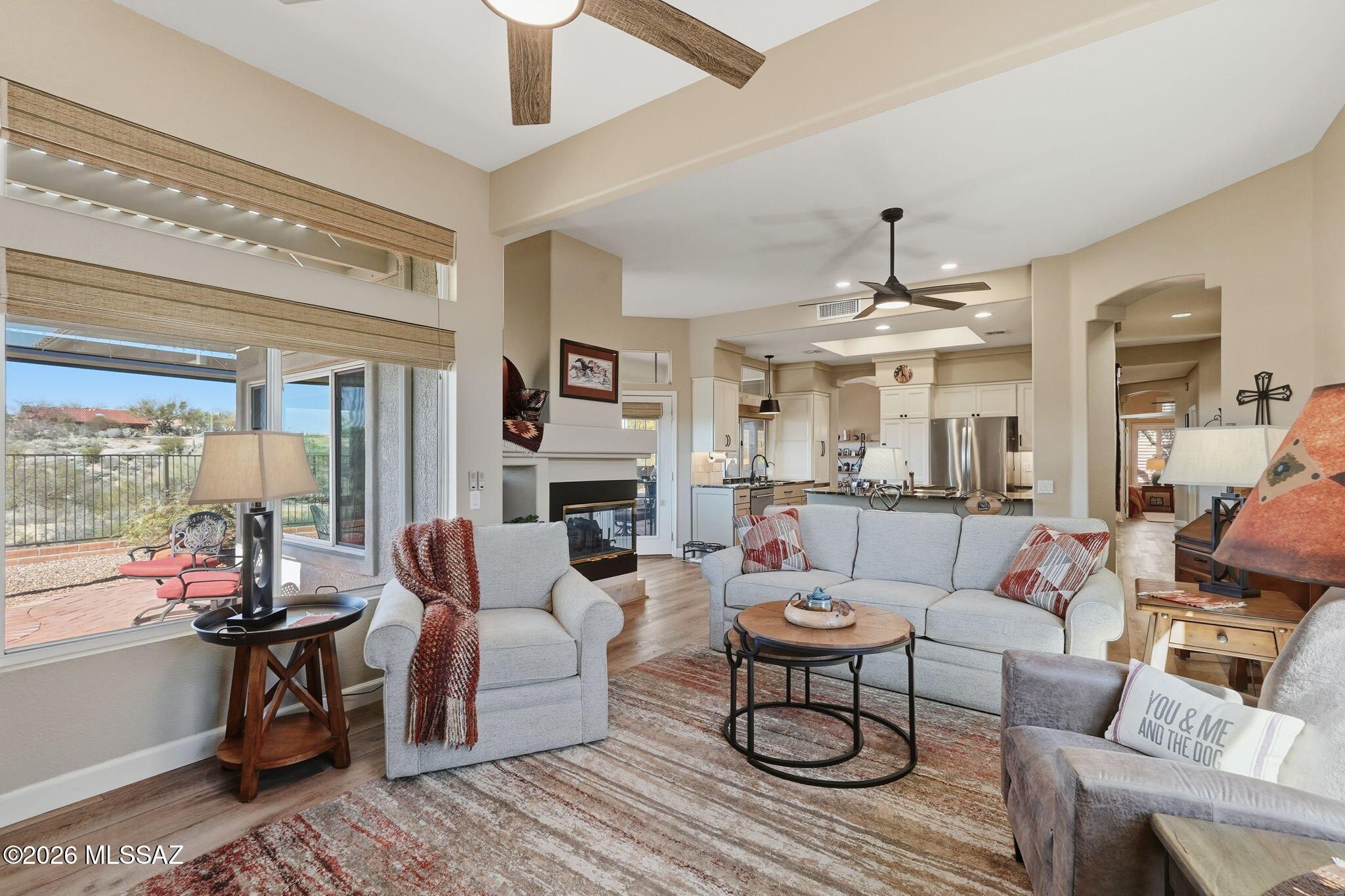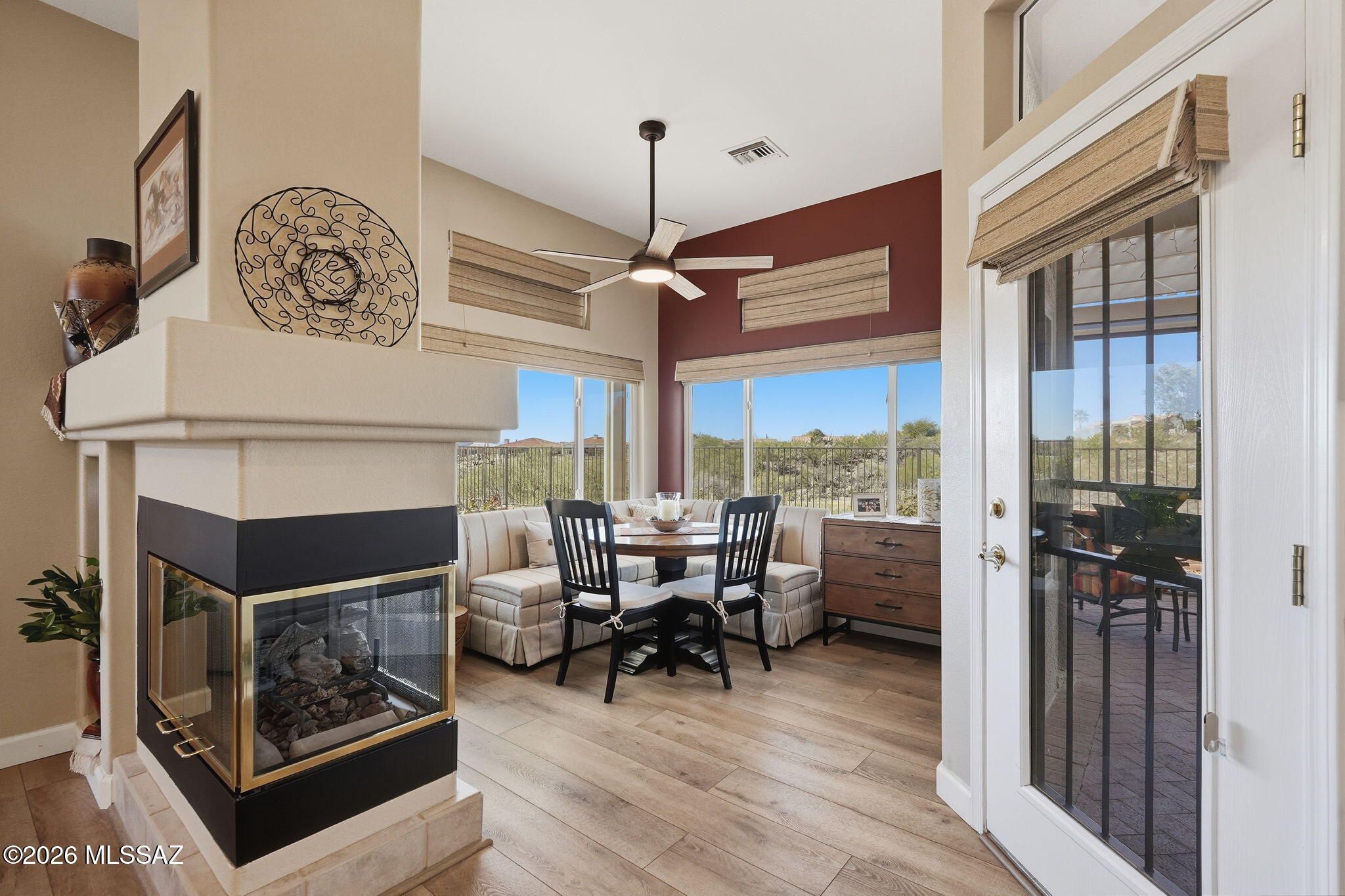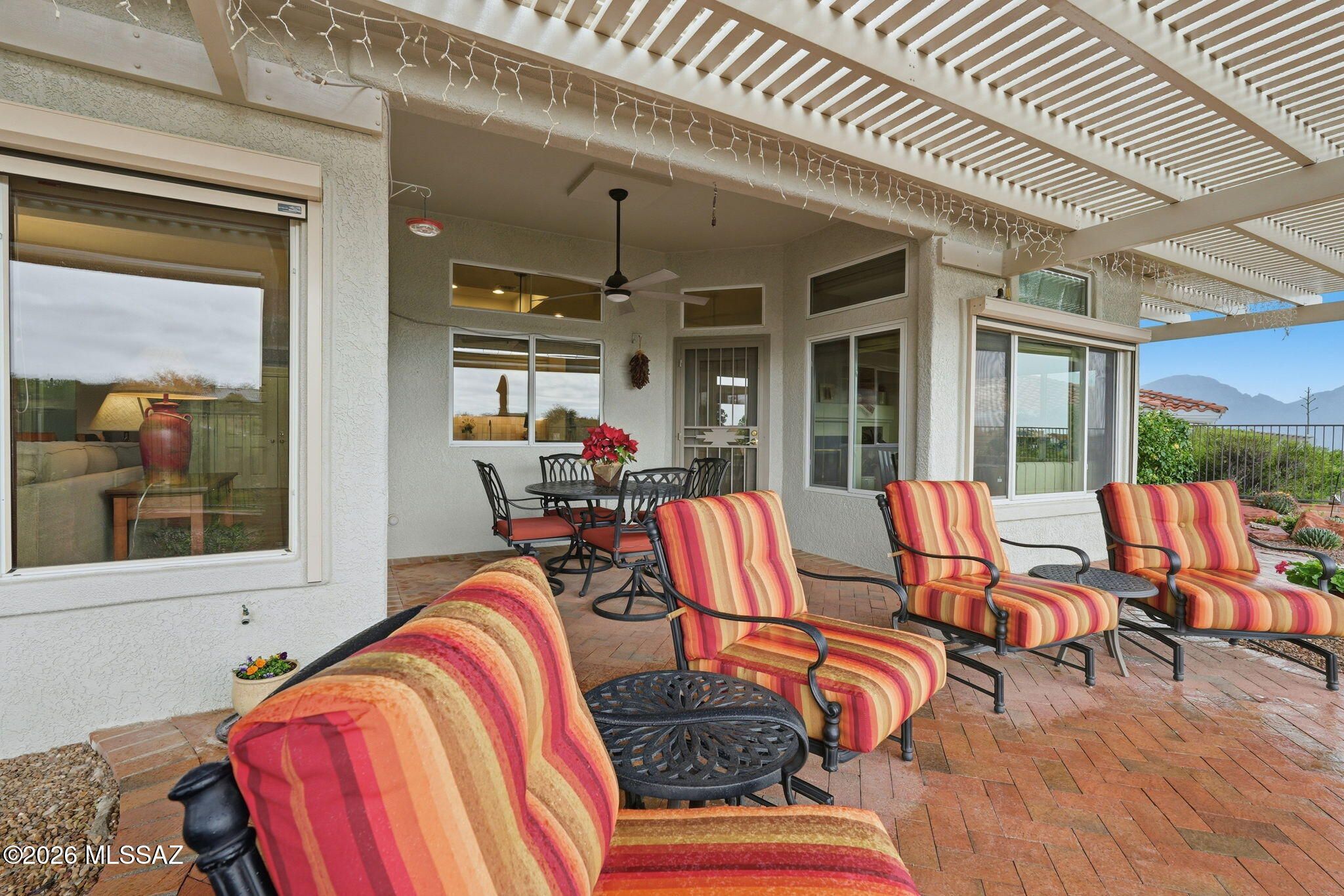 Extended Mountainview floor plan with 2,186 sq ft featuring two private suites, a den, and a half bath off the kitchen. Completely updated and elevated above the Sun City Oro Valley golf course with breathtaking mountain and sunset views from both front and back patios. Outdoor living includes a pergola with drop-down sunscreens for year-round comfort. A double-sided gas fireplace adds warmth and ambiance. The updated kitchen offers shaker cabinets, KitchenAid gas range, marble backsplash, and opens to an extended sitting area with views. New Summit Series stone composite flooring throughout. Remodeled baths with quartzite counters, new vanities, and a marble shower in the primary suite. Hunter Douglas window coverings and shutters. Replaced roof underlayment, owned solar, and HVAC (2020)