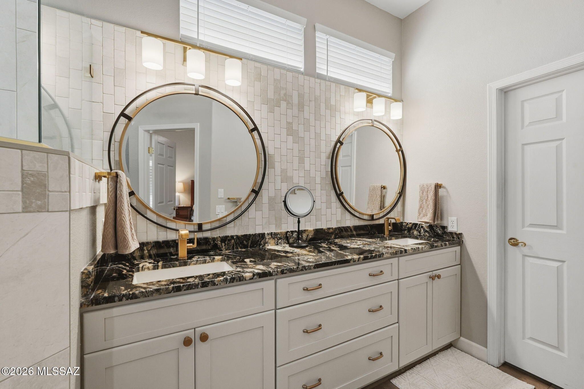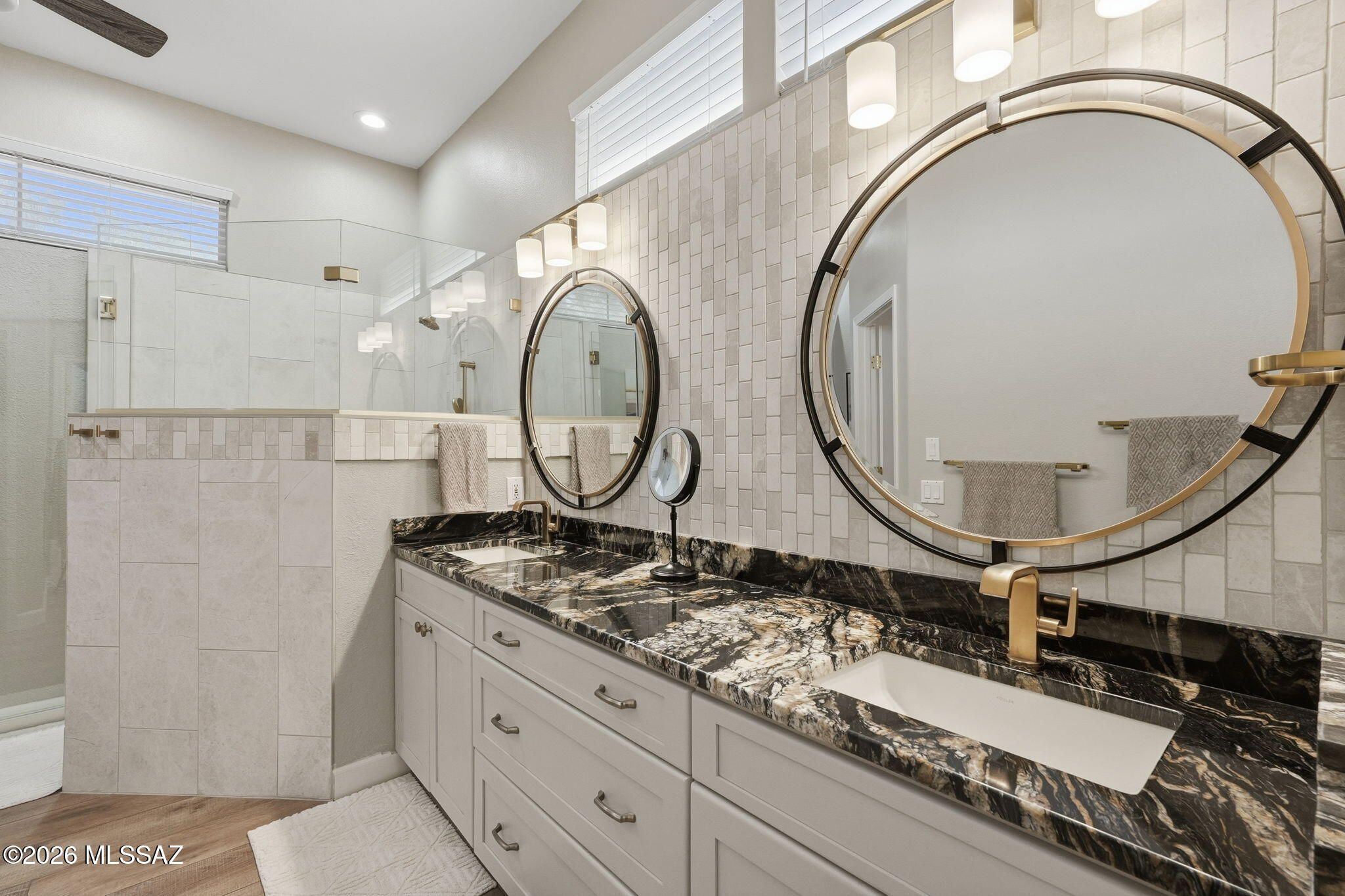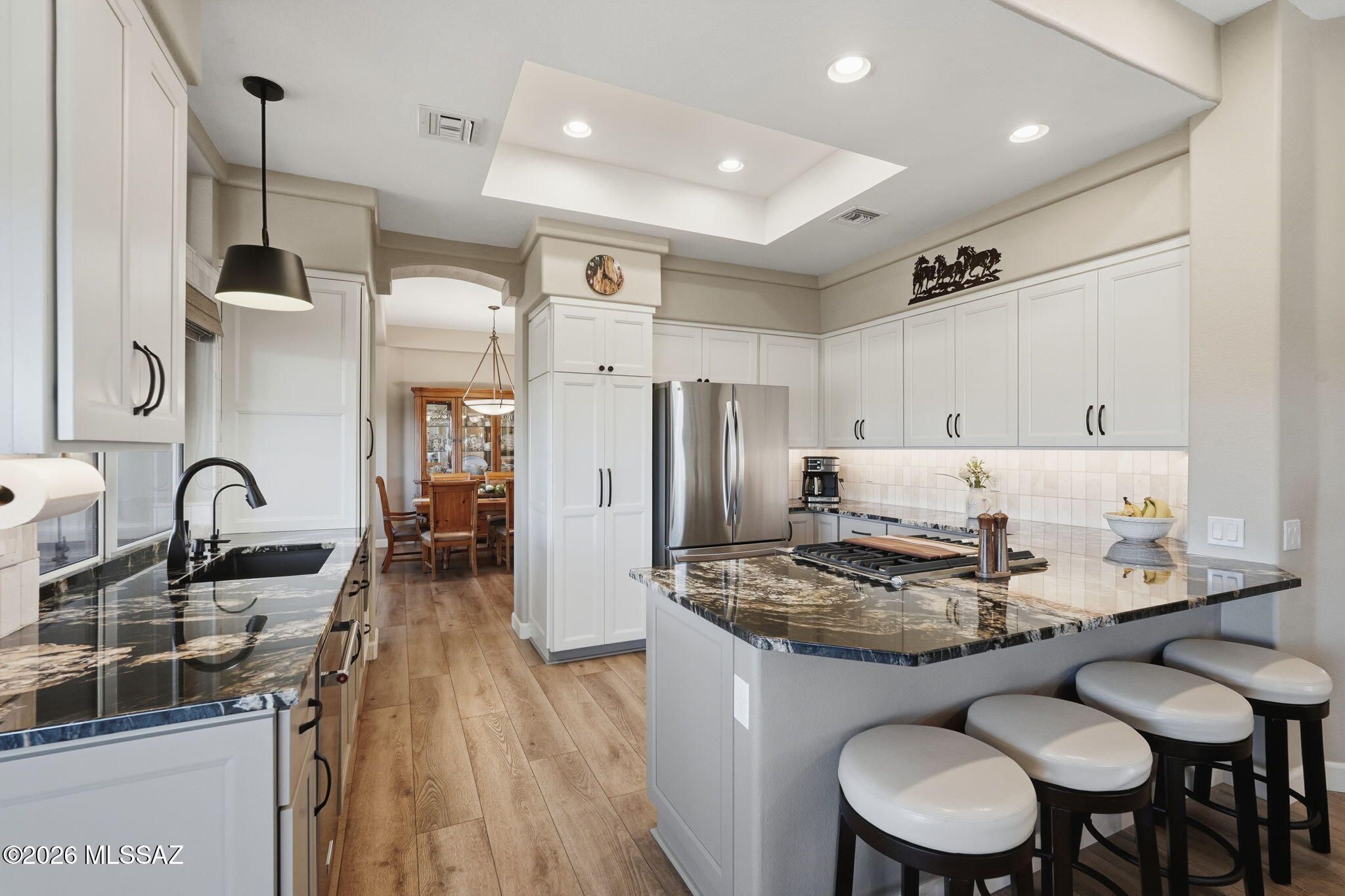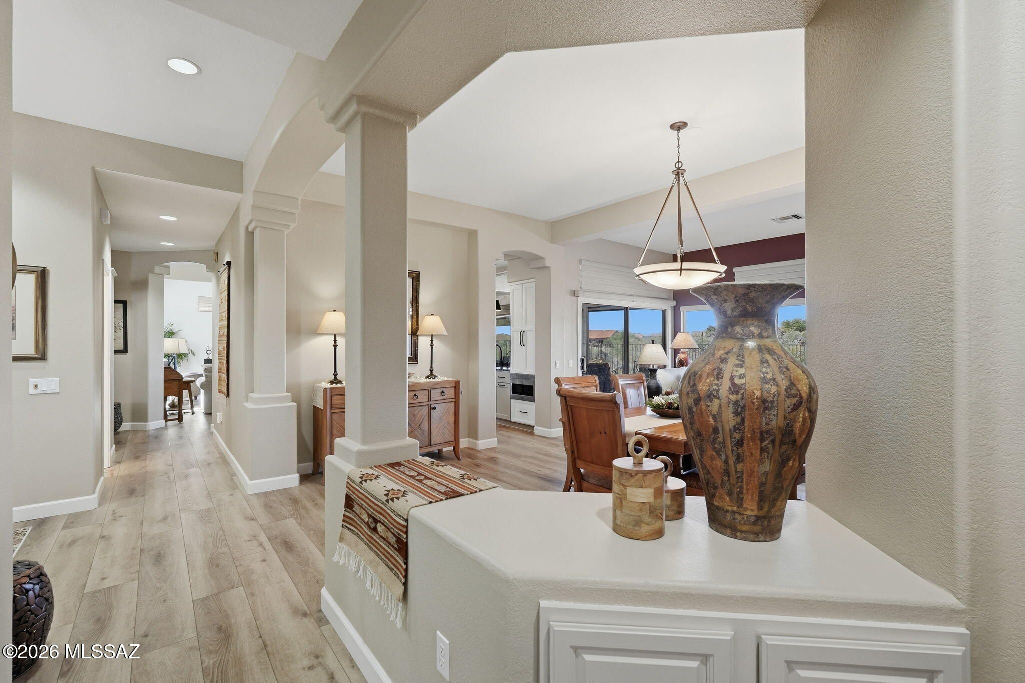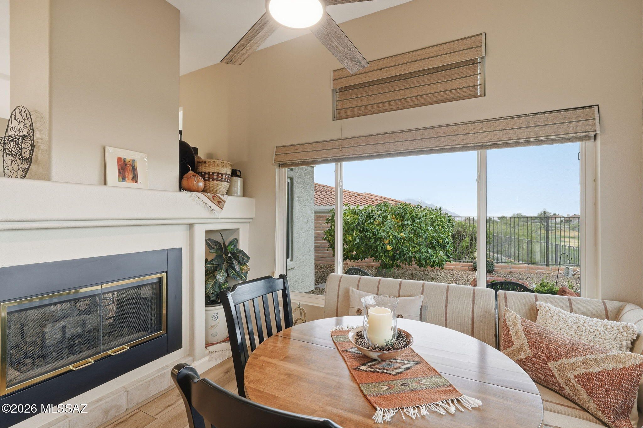 Extended Mountainview floor plan with 2,186 sq ft featuring two private suites, a den, and a half bath off the kitchen. Completely updated and elevated above the Sun City Oro Valley golf course with breathtaking mountain and sunset views from both front and back patios. Outdoor living includes a pergola with drop-down sunscreens for year-round comfort. A double-sided gas fireplace adds warmth and ambiance. The updated kitchen offers shaker cabinets, KitchenAid gas range, marble backsplash, and opens to an extended sitting area with views. New Summit Series stone composite flooring throughout. Remodeled baths with quartzite counters, new vanities, and a marble shower in the primary suite. Hunter Douglas window coverings and shutters. Replaced roof underlayment, owned solar, and HVAC (2020)