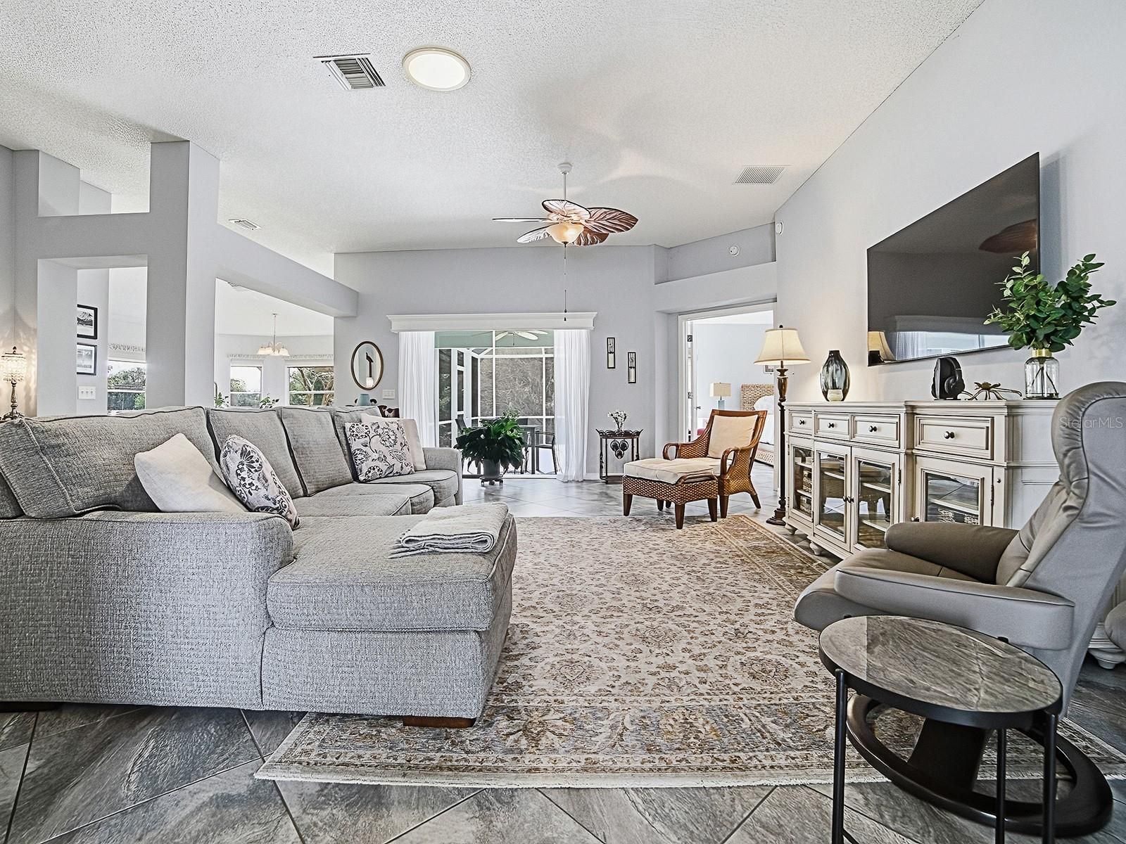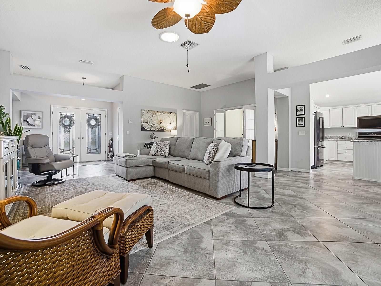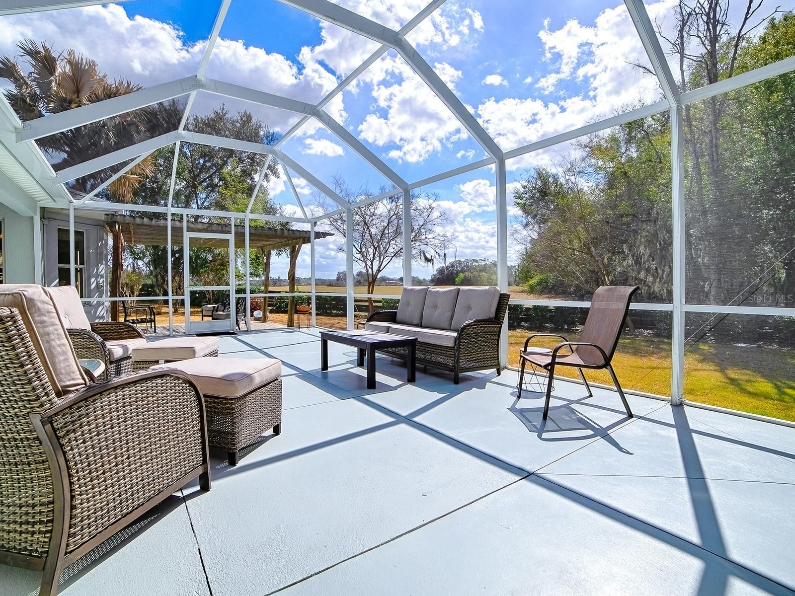 Welcome to the QUIETER side of The Villages! Tucked away at the end of a cul-de-sac, this home offers the kind of PRIVACY and SERENITY that’s hard to find — set on over a 1/3 ACRE HOMESITE backing to the Kelsea Louise Morse PRESERVE and even a local farm… which means NO REAR NEIGHBORS and peaceful views to enjoy every day. This 3-bedroom (one without a closet), 2½-bath Block & Stucco Designer is far from a typical Grand Ficus. Thoughtful modifications throughout make this truly a one-of-a-kind home. Both the Primary and Guest Bedrooms feature their own private EN-SUITE BATHROOMS and walk-in closets — ideal for hosting family and friends. There’s also a convenient half bath off the entry, and the enclosed den with double pocket doors offers flexibility as an additional guest space (no closet), craft room, office, or quiet personal retreat. Step outside and you’ll understand what makes this setting so special. The covered lanai opens to a spacious patio with a birdcage, plus an additional large patio with pergola — the perfect spaces to relax, entertain, or simply soak in the peaceful surroundings. And while you’re just about 1/10 mile from Chatham Recreation Center, there’s still plenty of room if adding your own pool is in your future plans. From the moment you walk through the double leaded-glass entry doors, you’ll feel right at home. The light and bright open floorplan, vaulted ceilings, and abundant natural light create a welcoming atmosphere. The kitchen is both beautiful and functional, featuring a sunny eat-in area with bay windows overlooking the FABULOUS SETTING! You’ll love the Black Stainless appliances, natural gas range, granite counters, white cabinetry with generous pull-out drawers (even in the pantry!), and thoughtful layout designed for everyday living. The Primary Suite is a relaxing retreat with double-door entry, a large walk-in closet, and an en-suite bath offering a tiled shower, dual rectangular sinks with granite counters, and a solar tube for added natural light. The indoor laundry is conveniently tucked away just off the primary bath. Throughout the home you’ll find beautiful tile and laminate flooring — NO carpet. The OVERSIZED 25’ deep garage provides versatile space for 2 cars and a golf cart or 1 car and 2 golf carts (depending on size). Location? It’s hard to beat. You’re just a short golf cart ride to multiple golf courses, pools, recreation centers, Nancy Lopez Legacy Country Club, Mulberry Grove Shopping Plaza, Spanish Springs Town Square, and Lake Sumter Landing — plus major medical and so much more. Additional features include a paver driveway, window blinds and cornices, wainscoting, attic stairs, workbench, gutters, and more. And for peace of mind: Roof replaced in 2020, HVAC in 2022, and Water Heater in 2023. Move right in with NO worries. .PLEASE NOTE: The MLS “View” reflects “Trees/Woods” and “Water” since a “Preserve” option is not available — this is simply a system limitation and not intended to mislead. Property taxes: $3,040.41, CDD (annual maintenance, storm/wastewater, fire district & bond): $1,800.98, Low Bond Balance: $2,113.72. Some furnishings may be negotiated separately. So… what are you waiting for? If not now, when?