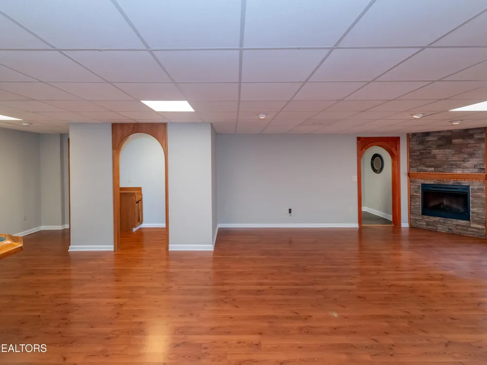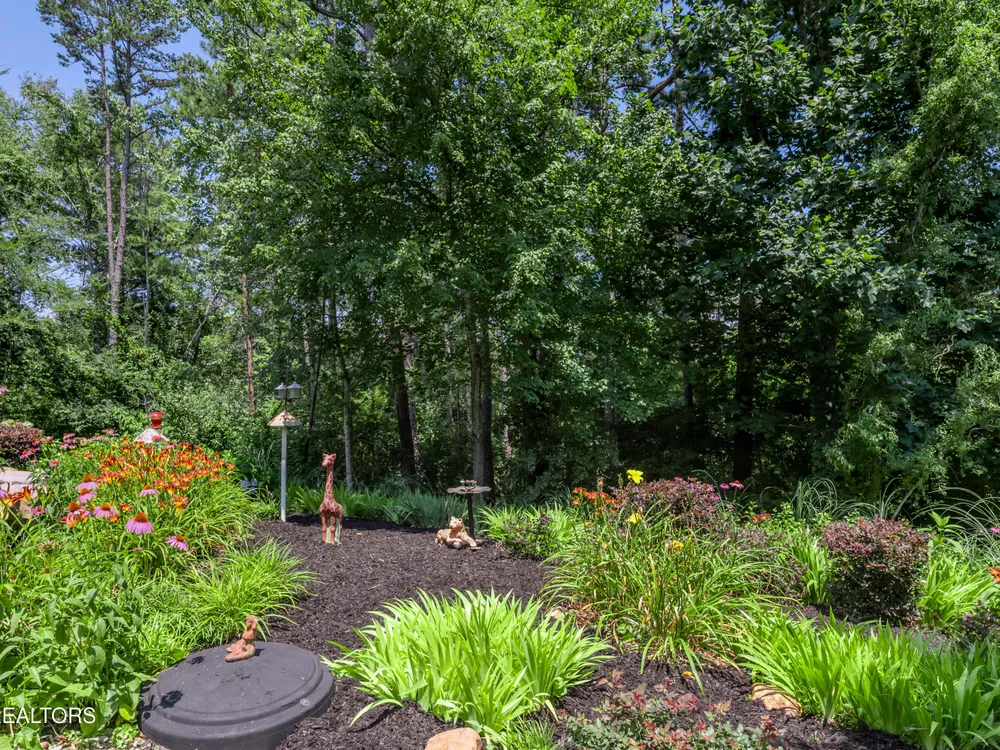 This 3,258 sq ft home is a landscaping delight. There is no grass to mow. The entire property is completely covered in gardens of trees, flowering shrubbery, flowers and stone walkway's. The gardens back up to approximately 80' of wooded common property behind the home. As you enter the driveway you will notice the side loaded three car garage on the right with ample driveway to back out into and exit the property going forward. Entering the home you will notice the gleaming wood floors. The formal dining room is on the right with distinctive three quarter high walls giving it a sense of privacy but yet not excluded from the rest of the home. Straight ahead past the dining room you enter the great room seeing the fire place in the left rear corner and windows and a door wall leading to a newly done beautiful screened in deck with a view of the wooded area behind. Turning to the right you notice the open dinette and looking further to the right you will see the large workable kitchen. Walking through the dinette you enter a hall which leads to two guest bed rooms on either side of a full bath. Just before entering the great room there is a door to the left that takes you into the large master suite. The bath offers his ans hers vanities, a jetted tub, a nice sized low step tiled shower and a large walk in closet. At the back of the kitchen there is a door leading to a large laundry room with cupboards, laundry sink, hanging area and a very large open pantry. A door at the back of the laundry room opens to the three car garage. A stairway before the great room leads down to the lower walk out level where you will find a large game room office or hobby room a kitchenette, a very large bar room and a very nice full bath. It is a party givers paradise. The lower level is heated and cooled with a vent from the HVAC system, electric fireplace and a window air conditioner. A one year Home Warranty is included. Outside there is a beautifully unique stone patio and a built in fire pit. This home is, without a doubt, a must see.