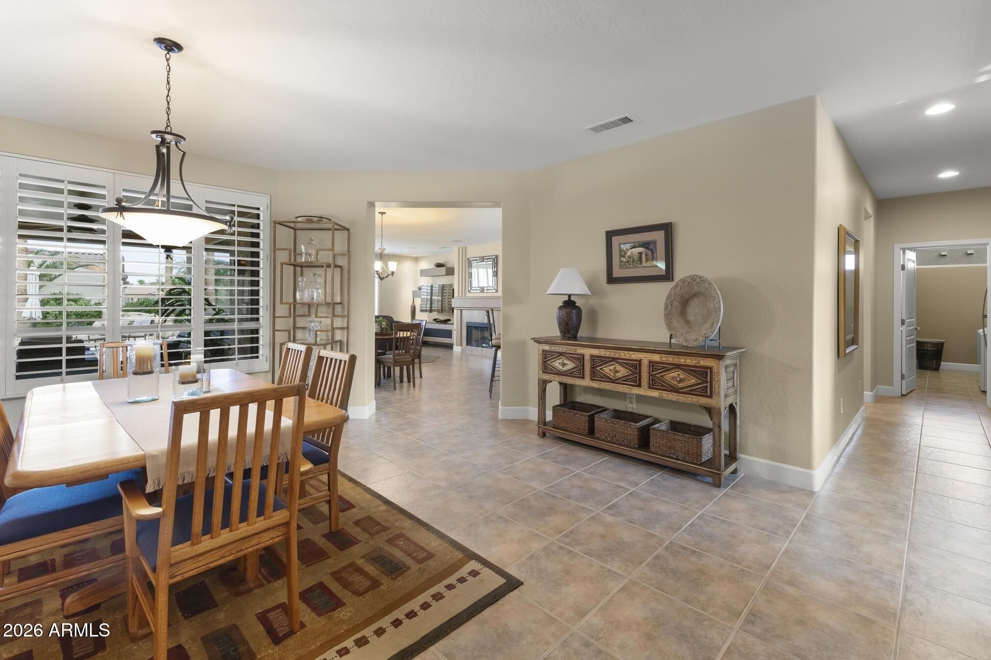 Expanded Hacienda model offering 3 bedrooms plus a den, thoughtfully upgraded and meticulously maintained with true pride of ownership throughout. This desirable split-bedroom floor plan provides both privacy and functionality, ideal for everyday living and hosting guests. The remodeled kitchen is a standout feature, showcasing stunning high-end granite countertops, stainless steel appliances, and gas cooking--perfect for the home chef. Interior upgrades include a custom media wall, 22-inch tile flooring, 5-inch baseboards & plantation shutters. The expanded 2-car garage with a dedicated golf cart garage adds exceptional storage and convenience. Step outside to a beautifully designed backyard retreat featuring a sparkling pool and spa, outdoor kitchen, and firepit -ideal for Arizona Living The expanded covered patio offers ample space for entertaining both large and intimate gatherings. Professionally landscaped with a PVC irrigation system for efficiency and ease. Additional improvements include a replaced HVAC system, adding comfort and peace of mind.