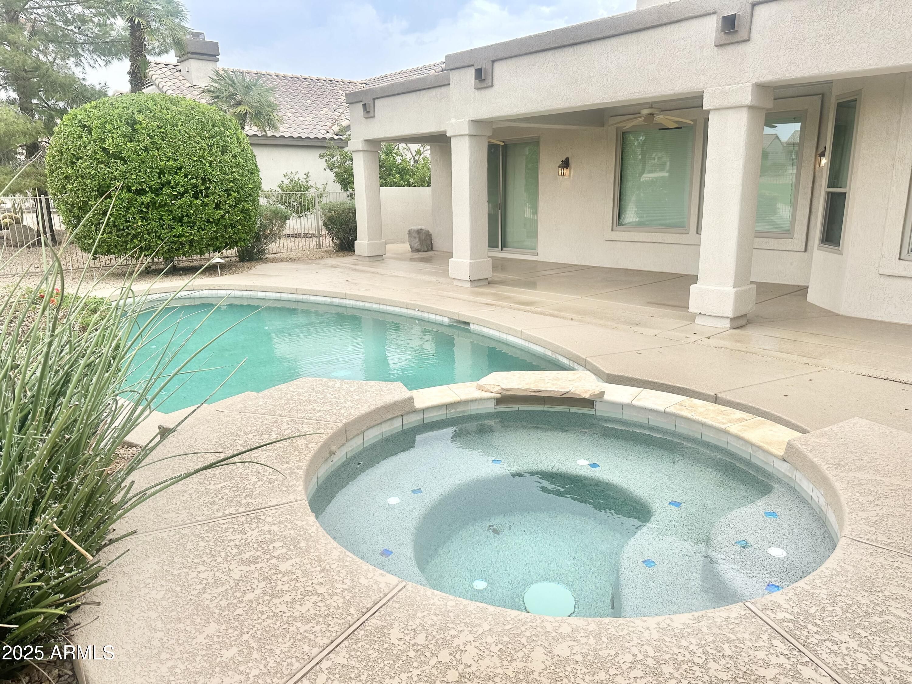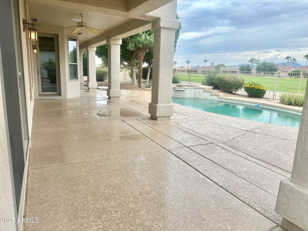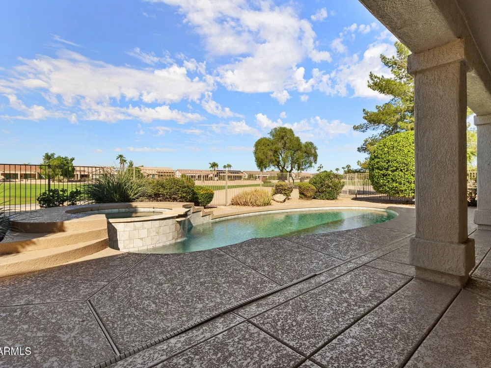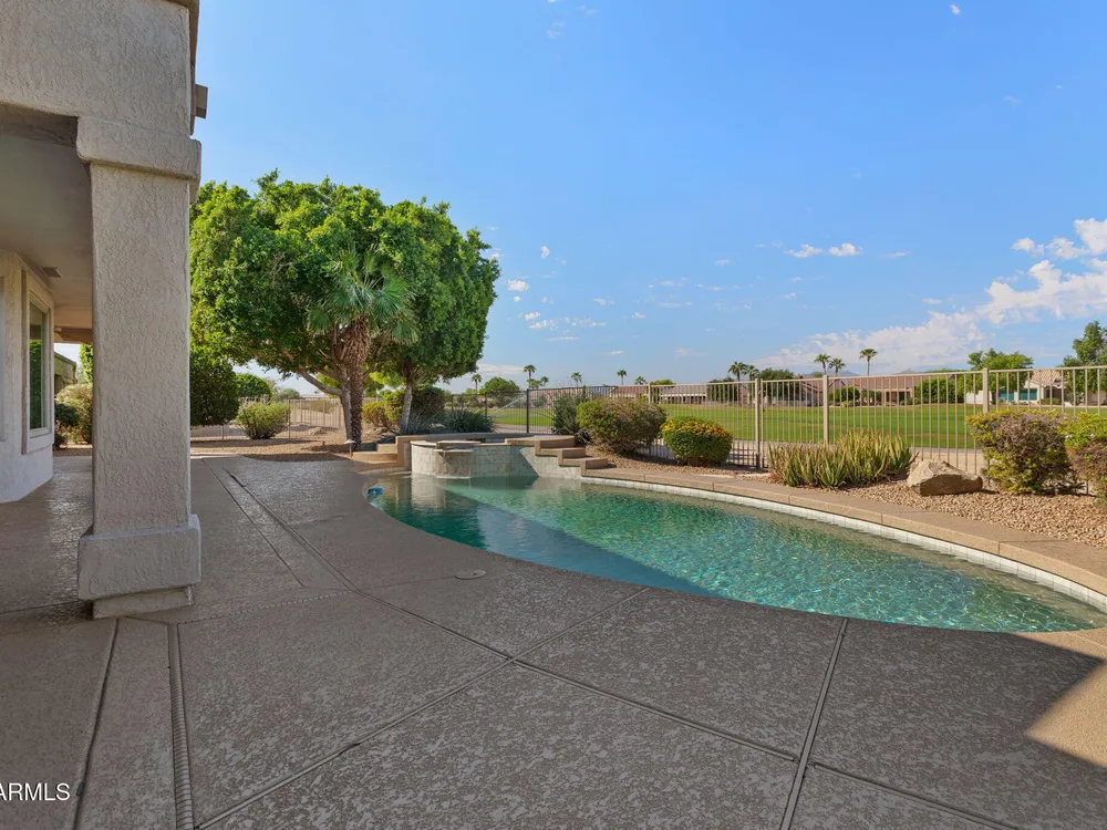 Live the golf lifestyle in Sun City Grand! This beautifully appointed 3 bed 3 bath split floorplan home offers stunning golf course views and resort-style relaxation from your own backyard +stunning sunset views of the White Tanks. Inside, soaring ceilings and sophisticated finishes create a light airy ambiance. Featuring two spacious primary suites. Enjoy outdoor living with a large covered patio, Cool deck around pool & spa area + pool drained and chemically washed in 2025. Low E Windows throughout! Perfect as a winter retreat or second home, this residence offers effortless lock-and-leave living in one of Arizona's most desirable active adult communities. Experience active adult living with championship golf, dining, and premier amenities. Prestine Pool Services has been working on this property/pool since 2022 33' pool with attached elevated spa 2023 Heater Replaced 2024 Pop-up heads were repaired/replaced 2025 Jan - pool was emptied and acid washed 2025 New GFI was installed with cover