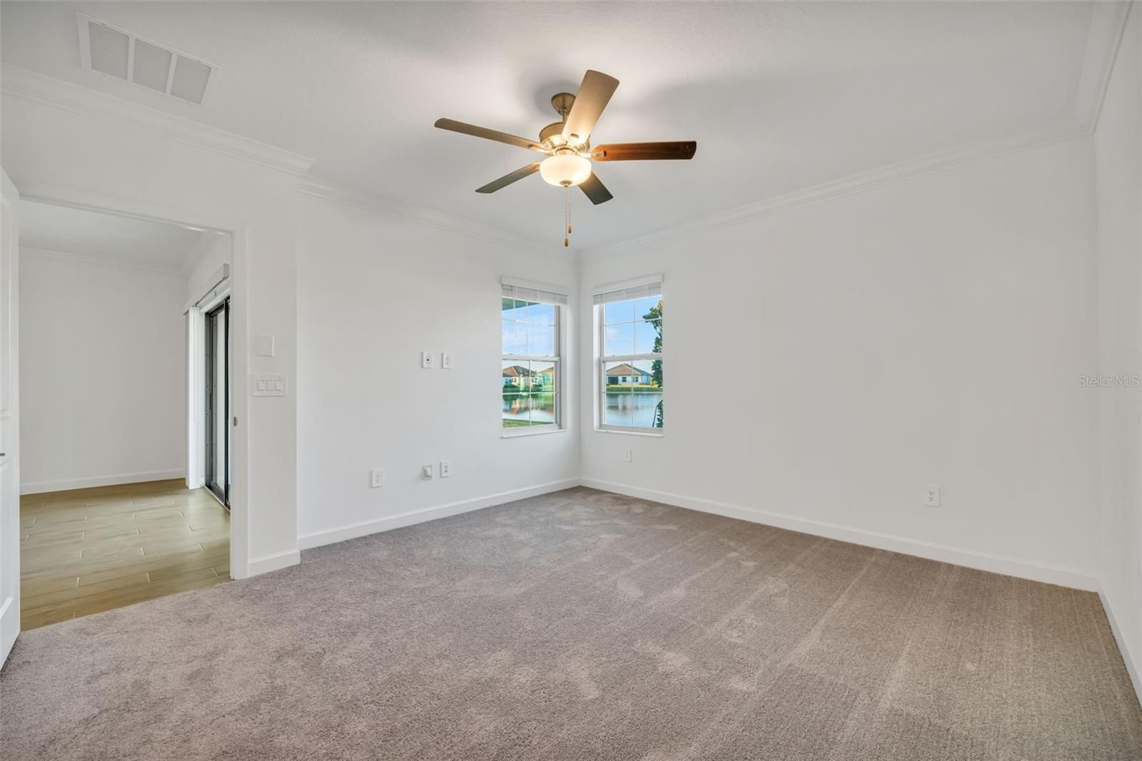 - Crown Molding, Living/Dining Room, Open Floorplan, In-Wall Pest Control, Main Level Primary, Solid Surface Counters, Thermostat, Walk-In Closet(s), Window Treatments