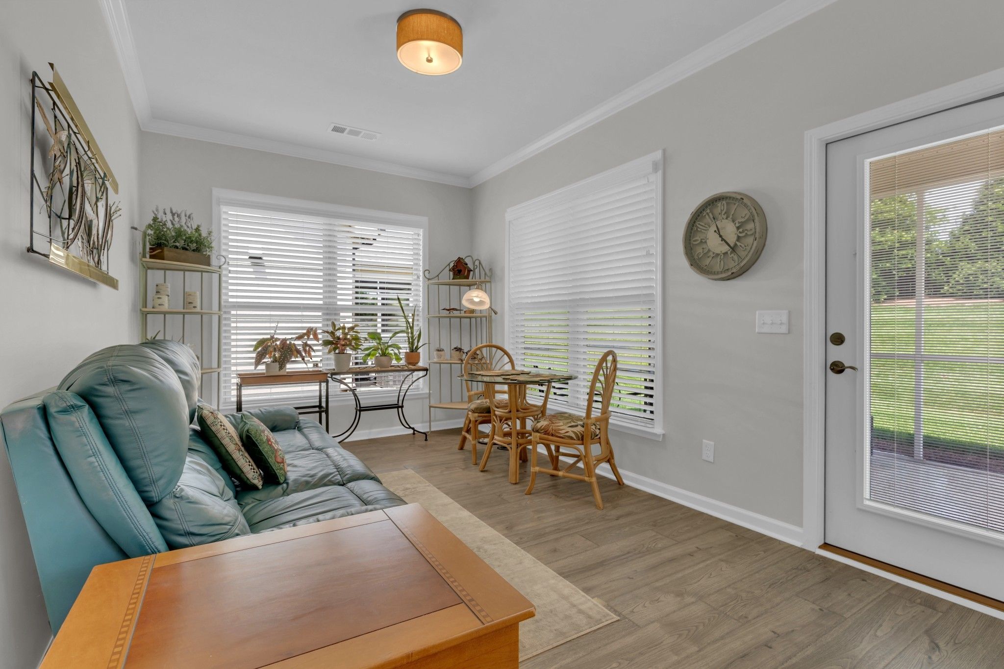 Well maintained, one owner, 3 bedroom 2 bath Taft model floor plan in Southern Springs by Del Webb 55+ active adult community. Open concept living, 9ft ceilings, crown moulding, flex room, sunroom, and a screened lanai with epoxy coating backing to a very lush tree lined berm for the ultimate in privacy. The front of the home is bordered by a gorgeous pocket park where neighbors are often seen gathering for social events and holiday celebrations. The kitchen is a cook's dream with beautiful upgraded white cabinetry, roll out shelving, soft close doors and drawers, slide in gas range, with stainless steel range hood vent, tile backsplash, farmhouse sink, large island for entertaining, double door pantry with modular shelving system, and lots of natural light coming from the three windows over the kitchen sink area overlooking the private tree lined backyard. The third guest bedroom is located upstairs and can also be used as a craft/hobby room, or TV room. Current owners have a futon for guests and this also doubles as a craft area/sewing room. Primary bedroom has ensuite bath with quartz countertops, tile floor, double sink vanities, walk-in tile shower, and a huge primary closet with custom modular closet shelving. Lots of storage in the garage as well as upstairs. Whole house air purifier. The community has both indoor and outdoor pools, pickleball and tennis courts, gas firepit, pavilion with gas grills and patio tables, clubhouse with fitness center and fitness classes, ball rooms, kitchen, conference room, card/game room, massage room, men's and women's locker rooms, and a dog park. Over 70 clubs and special interest groups, special programs, presentations, concerts, Southern Springs choir and band, as well as photography, painting, quilting, solo clubs, coffee club, Veteran's club, and so much more. Living in Southern Springs is like vacationing at a very active resort. Thirty-five minutes to/from BNA.
