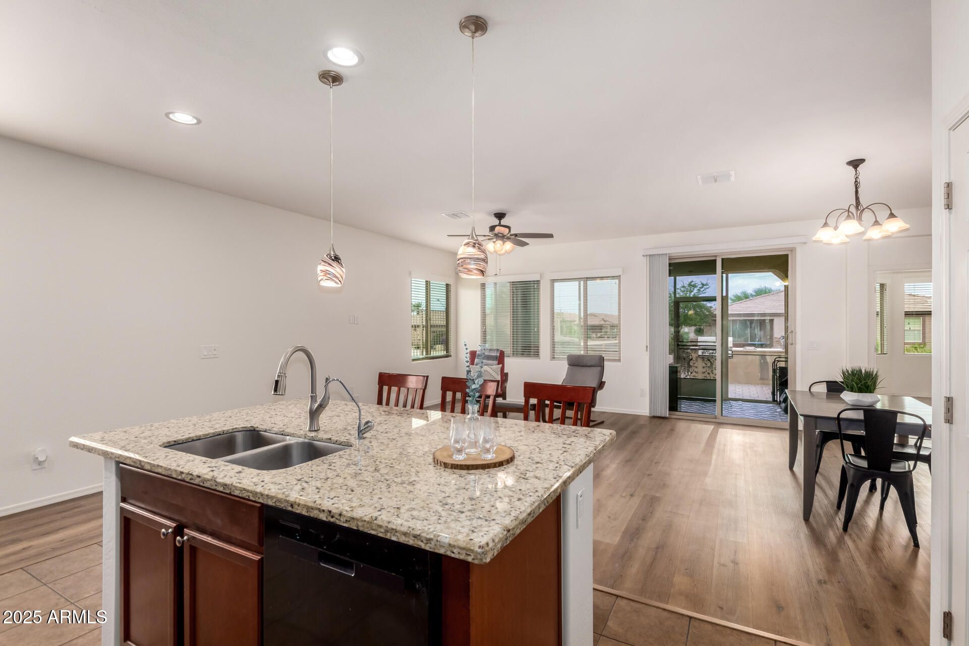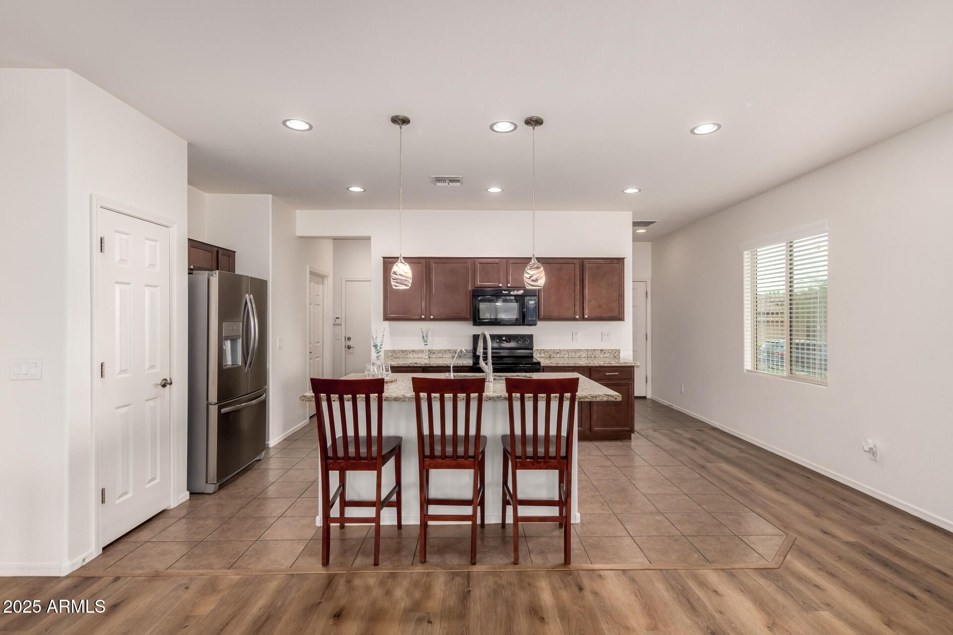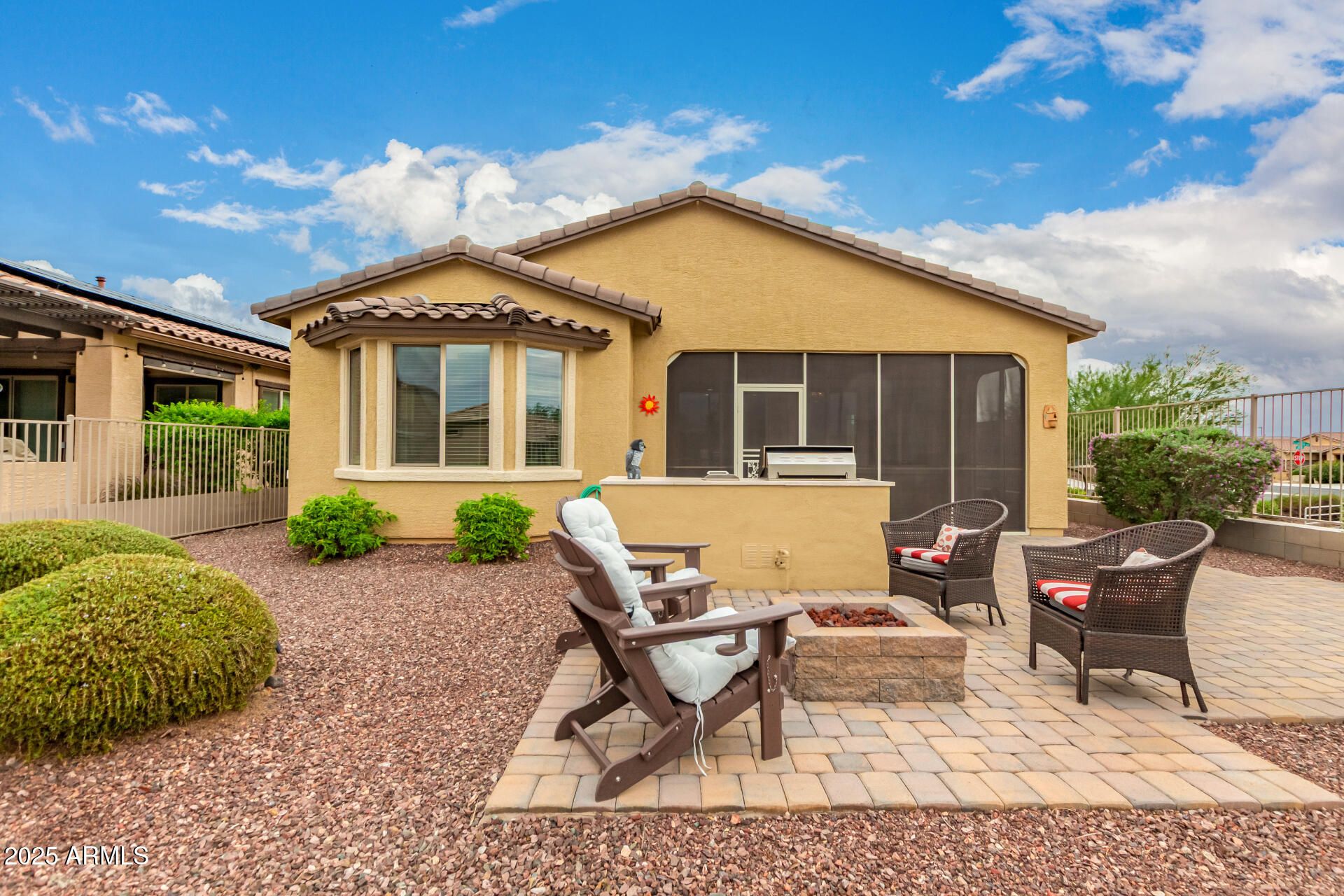 Welcome to CantaMia in Estrella Mountain Ranch! This immaculate 2-bedroom, 2-bath home plus den/office offers an open floor plan with stunning mountain and sunset views from a screened-in back patio. Featuring fresh interior paint (including garage), tile in kitchen and baths, and luxury vinyl plank flooring throughout. NO CARPET, this home is move-in ready. Enjoy OWNED SOLAR, owned water softener, reverse osmosis system for comfort and efficiency. The backyard is perfect for entertaining with a built-in gas BBQ, gas firepit, pavers, and low-maintenance landscaping. Located on a desirable north/south-facing corner lot. Enjoy resort-style living with access to heated pools, fitness center, art studio, pickleball, bocce ball, tennis, dog park, café and more in this 55+ gated community