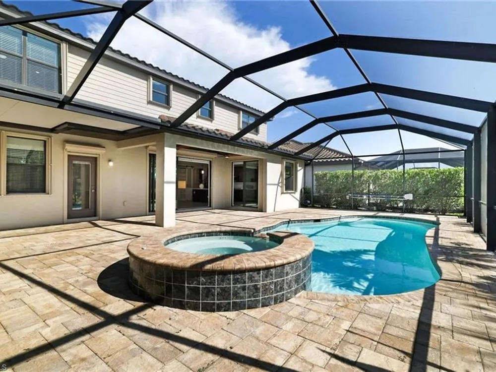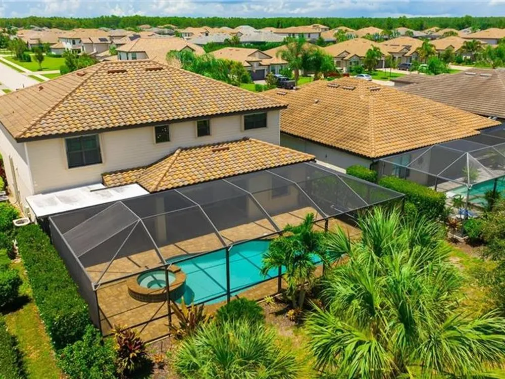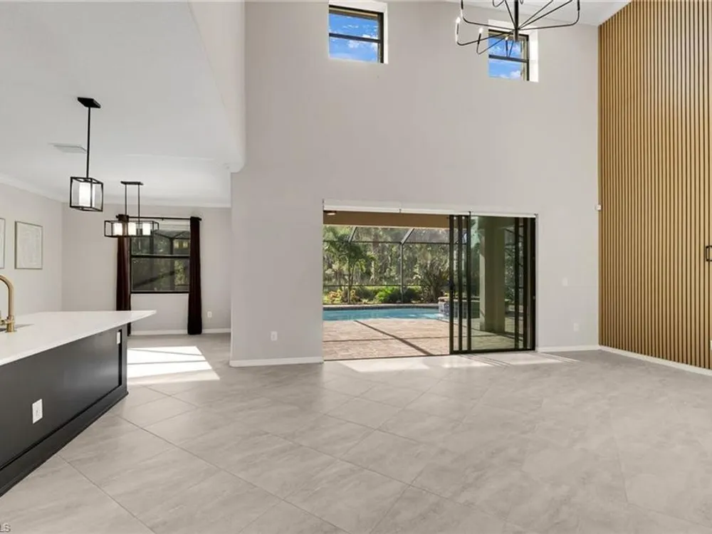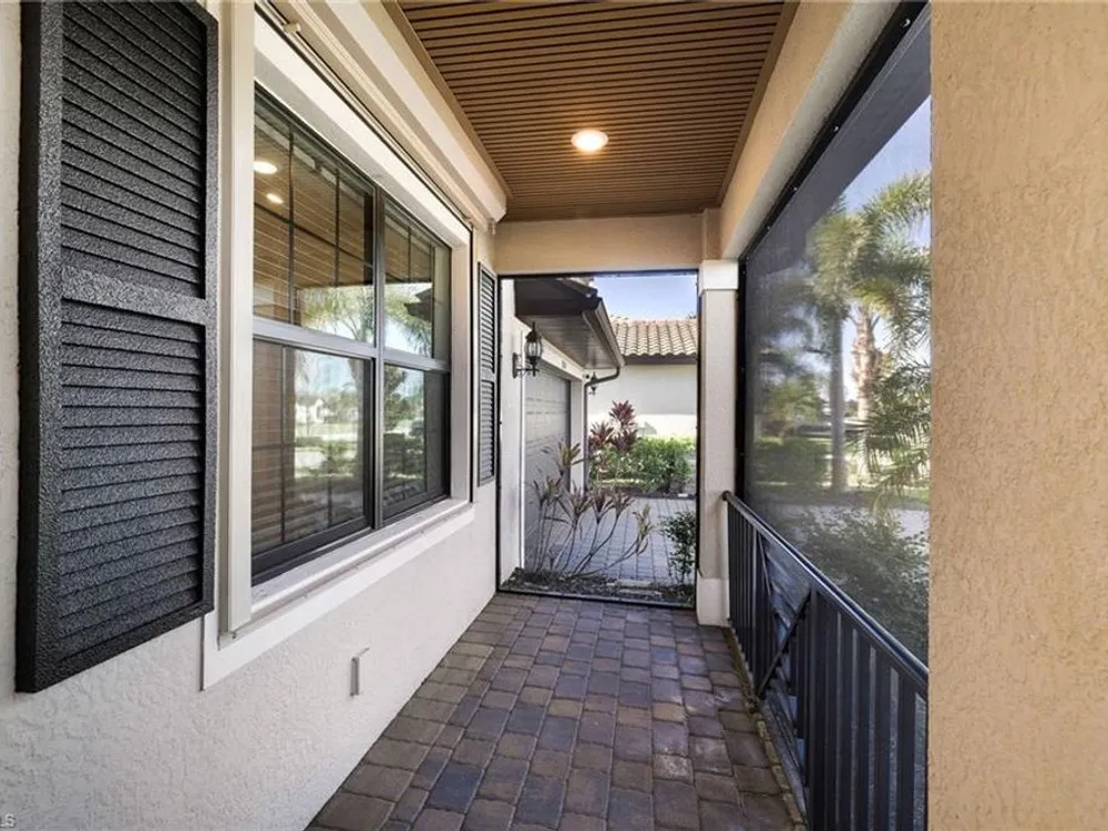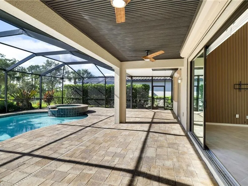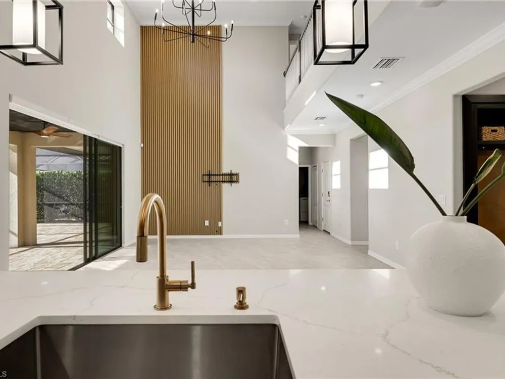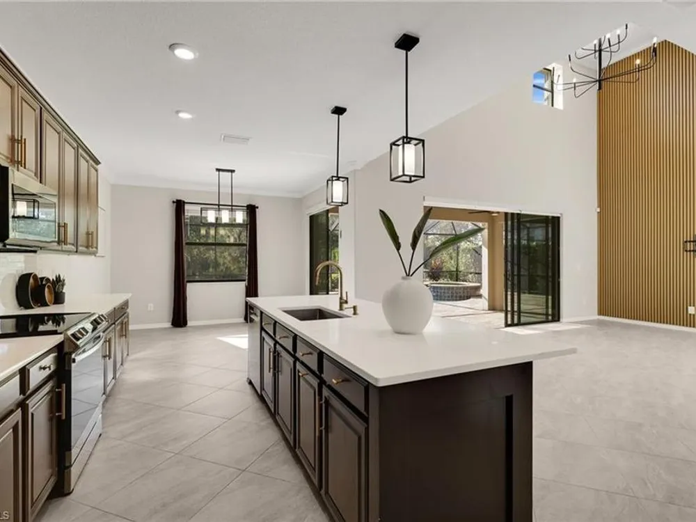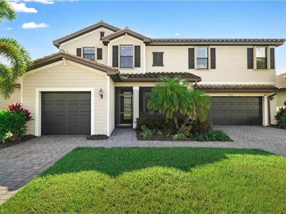 Discover refined luxury within the contemporary ambiance of this two-story Sorrento model home in The Place at Corkscrew. Offering 3,357 square feet of beautifully designed living space, this residence features 5 bedrooms, 4-1/2 bathrooms, and a versatile den/office/flex room. The open-concept design with a neutral palette and abundant natural light creates a warm and inviting atmosphere that seamlessly blends style and functionality. The kitchen is a showpiece with updated appliances, 42” chestnut-toned cabinetry, an OVERSIZED ISLAND with single-basin sink, CALACUTTA GOLD QUARTZ countertops, antiqued champagne bronze hardware, TILED BACKSPLASH, UNDER CABINET LIGHTING, dry bar, and a built-in pantry with frosted sliding glass doors. The great room makes a statement with a soaring two-story fluted wood accent wall, double-tiered chandelier, and motorized window shades. Additional features include tile flooring on the main level, manufactured hardwood upstairs, crown molding, formal dining, wainscoting in the half bath, 2” white blinds, laundry room, and a custom-built drop zone with lighting and storage. The SCREENED FRONT PORCH with fluted ceiling detail adds charm, while outdoor electric shutters on sliders and accordion shutters on windows provide peace of mind. A 3 CAR SPLIT GARAGE WITH EPOXY FLOORING, INSULATION, AND AIR CONDITIONING IN THE SINGLE BAY offers comfort and storage. The private upstairs primary suite impresses with DUAL CUSTOM BUILT CLOSETS with digital locks, a spa-inspired bath with comfort-height dual sink vanity, soaking tub, frameless glass shower, separate water closet, and linen closet with shelving and laundry drawer. Two bedrooms with custom closets share a full bath and a fourth bedroom has an ensuite, perfect for family. The fifth en-suite bedroom on the first floor features a custom closet and is an ideal space for guests. Set on a .24-acre lot with desirable SOUTHEAST REAR EXPOSURE and tranquil preserve views, this home offers a stunning outdoor retreat. The extended lanai showcases a fluted ceiling finish, dual ceiling fans, and an expansive 18’ x 24’ AWNING providing shade and rain protection. A CUSTOM HEATED POOL AND SPA create the perfect private oasis for relaxation or entertaining, complemented by a convenient FULL POOL BATH with shower. Residents of The Place at Corkscrew enjoy resort-style amenities: an indoor/outdoor restaurant and bar, Marketplace Café, Bourbon Bar, 11,000-sf zero-depth pool with waterslide, spa, splash pad, cabanas, sand volleyball, 24/7 fitness center, childcare room, movement studio, playground, and dog park. Pickleball, tennis, bocce, and basketball courts provide recreation, while Old Corkscrew Golf Club, a Jack Nicklaus Signature public course, is just beyond the gates. With low HOA fees, a no flood zone location, and proximity to RSW Airport, FGCU, shopping, dining, and Gulf beaches, The Place at Corkscrew stands out as one of the most desirable communities in Southwest Florida.