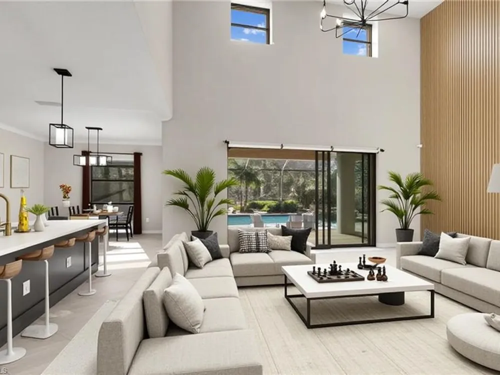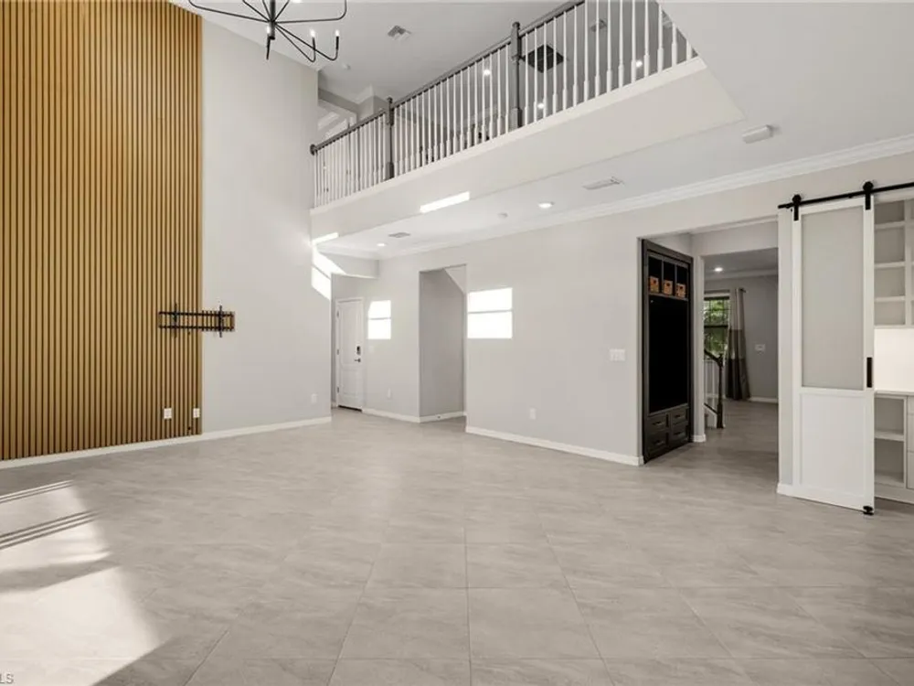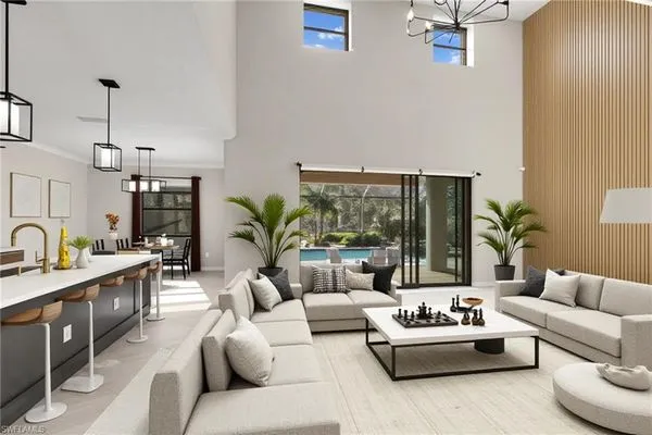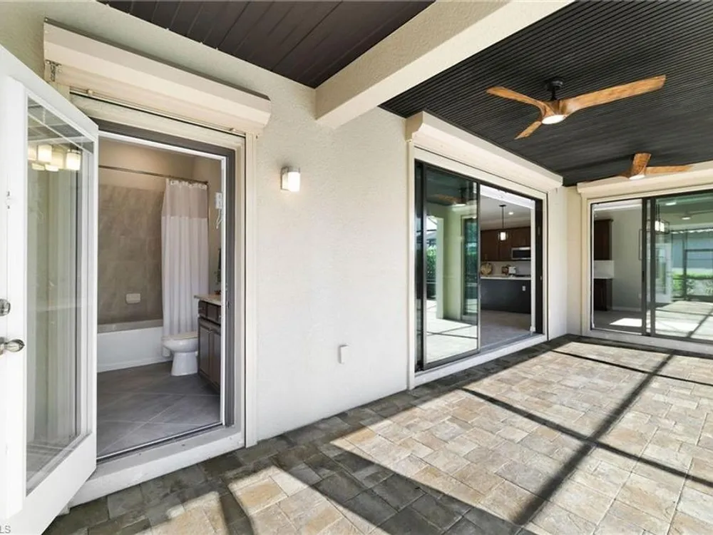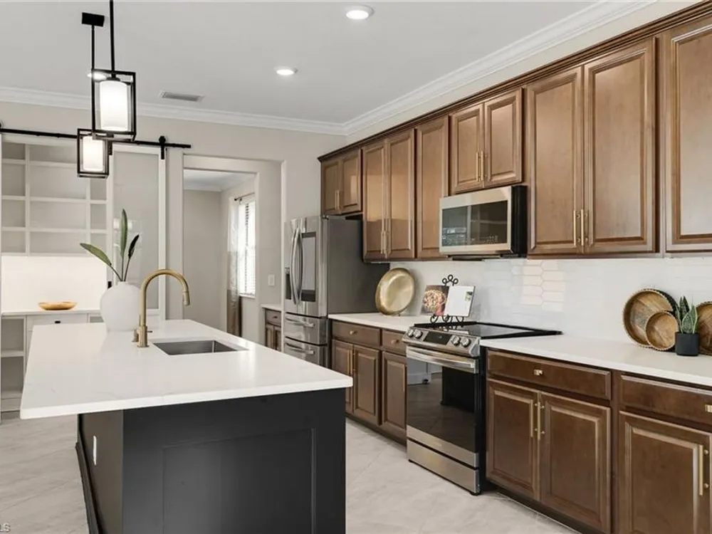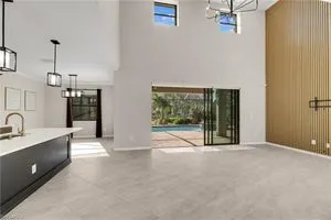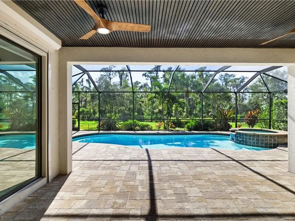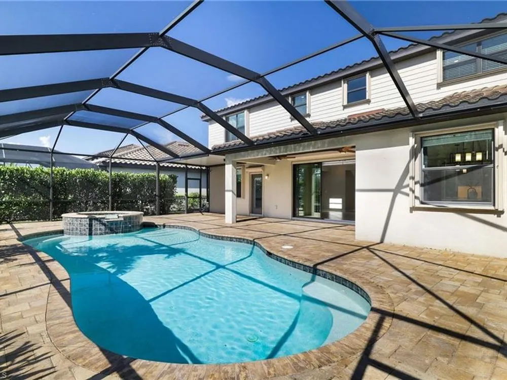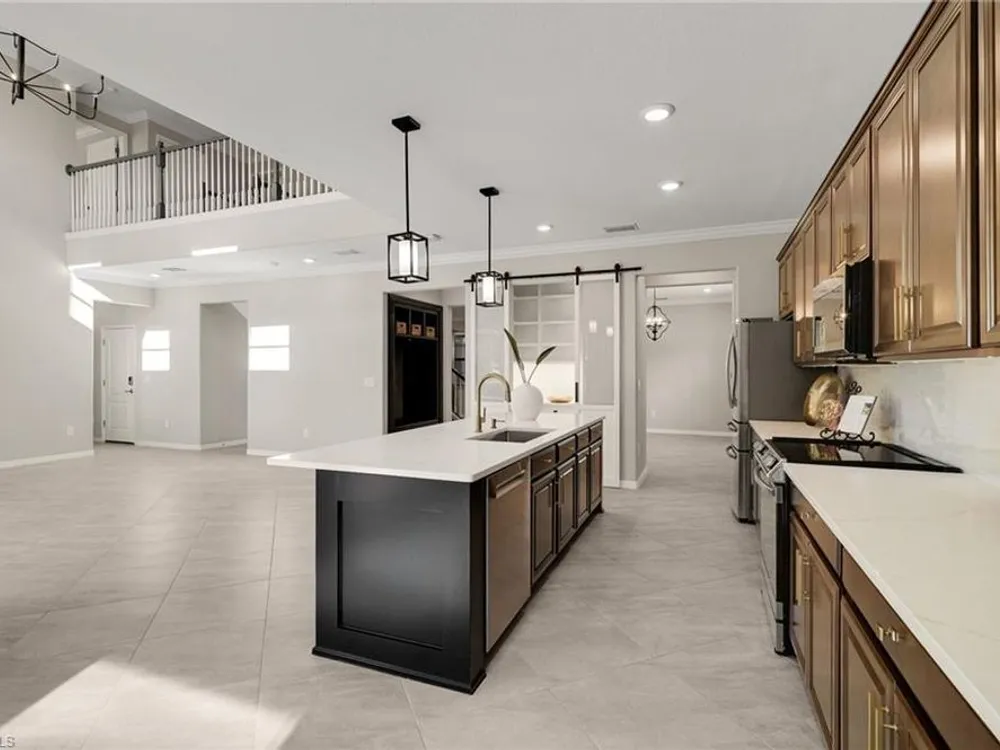 Discover refined luxury within the contemporary ambiance of this two-story Sorrento model home in The Place at Corkscrew. Offering 3,357 square feet of beautifully designed living space, this residence features 5 bedrooms, 4-1/2 bathrooms, and a versatile den/office/flex room. The open-concept design with a neutral palette and abundant natural light creates a warm and inviting atmosphere that seamlessly blends style and functionality. The kitchen is a showpiece with updated appliances, 42” chestnut-toned cabinetry, an OVERSIZED ISLAND with single-basin sink, CALACUTTA GOLD QUARTZ countertops, antiqued champagne bronze hardware, TILED BACKSPLASH, UNDER CABINET LIGHTING, dry bar, and a built-in pantry with frosted sliding glass doors. The great room makes a statement with a soaring two-story fluted wood accent wall, double-tiered chandelier, and motorized window shades. Additional features include tile flooring on the main level, manufactured hardwood upstairs, crown molding, formal dining, wainscoting in the half bath, 2” white blinds, laundry room, and a custom-built drop zone with lighting and storage. The SCREENED FRONT PORCH with fluted ceiling detail adds charm, while outdoor electric shutters on sliders and accordion shutters on windows provide peace of mind. A 3 CAR SPLIT GARAGE WITH EPOXY FLOORING, INSULATION, AND AIR CONDITIONING IN THE SINGLE BAY offers comfort and storage. The private upstairs primary suite impresses with DUAL CUSTOM BUILT CLOSETS with digital locks, a spa-inspired bath with comfort-height dual sink vanity, soaking tub, frameless glass shower, separate water closet, and linen closet with shelving and laundry drawer. Two bedrooms with custom closets share a full bath and a fourth bedroom has an ensuite, perfect for family. The fifth en-suite bedroom on the first floor features a custom closet and is an ideal space for guests. Set on a .24-acre lot with desirable SOUTHEAST REAR EXPOSURE and tranquil preserve views, this home offers a stunning outdoor retreat. The extended lanai showcases a fluted ceiling finish, dual ceiling fans, and an expansive 18’ x 24’ AWNING providing shade and rain protection. A CUSTOM HEATED POOL AND SPA create the perfect private oasis for relaxation or entertaining, complemented by a convenient FULL POOL BATH with shower. Residents of The Place at Corkscrew enjoy resort-style amenities: an indoor/outdoor restaurant and bar, Marketplace Café, Bourbon Bar, 11,000-sf zero-depth pool with waterslide, spa, splash pad, cabanas, sand volleyball, 24/7 fitness center, childcare room, movement studio, playground, and dog park. Pickleball, tennis, bocce, and basketball courts provide recreation, while Old Corkscrew Golf Club, a Jack Nicklaus Signature public course, is just beyond the gates. With low HOA fees, a no flood zone location, and proximity to RSW Airport, FGCU, shopping, dining, and Gulf beaches, The Place at Corkscrew stands out as one of the most desirable communities in Southwest Florida.