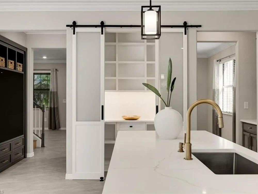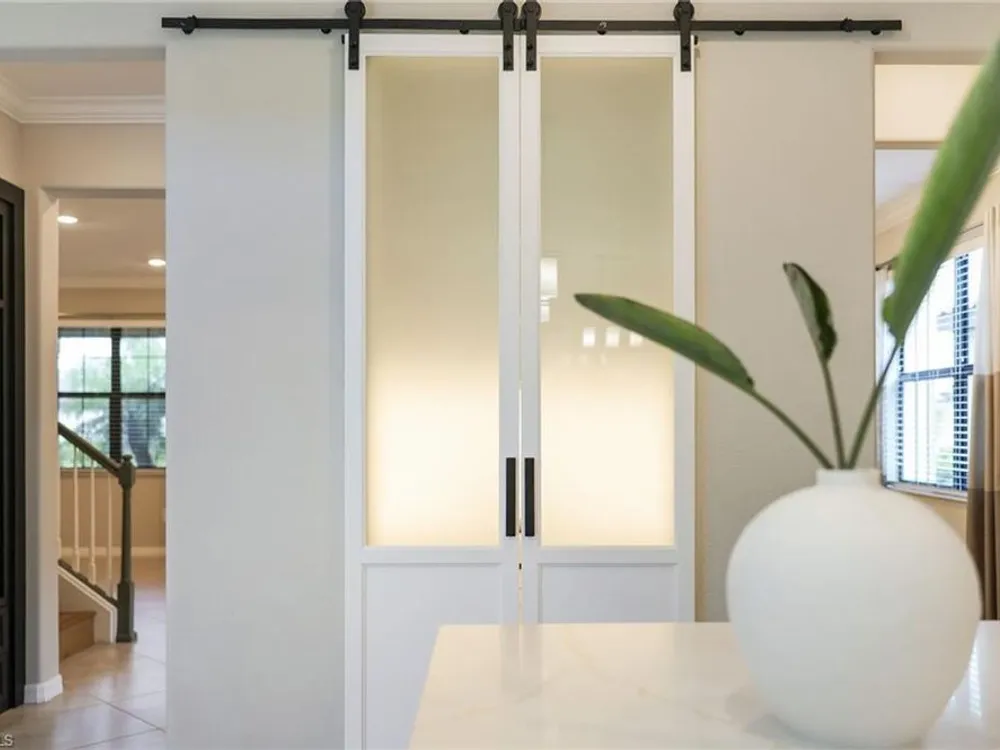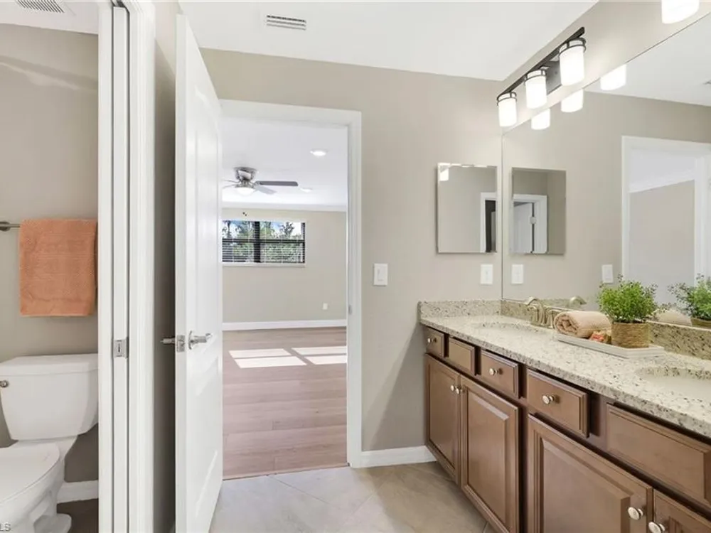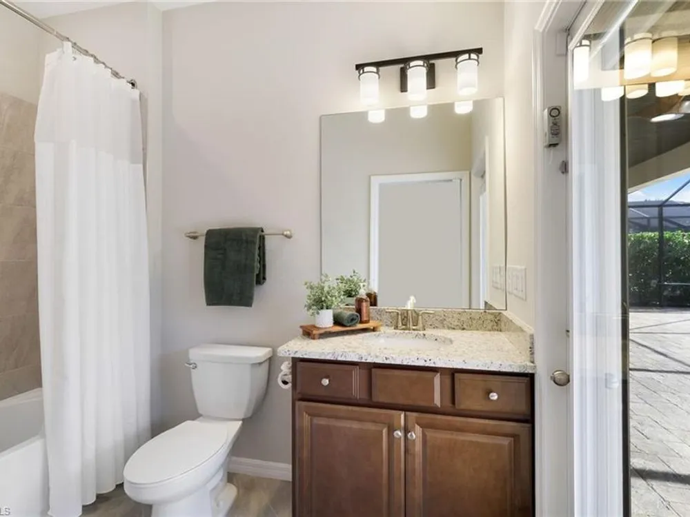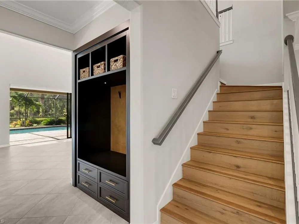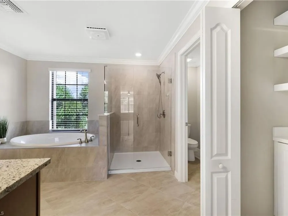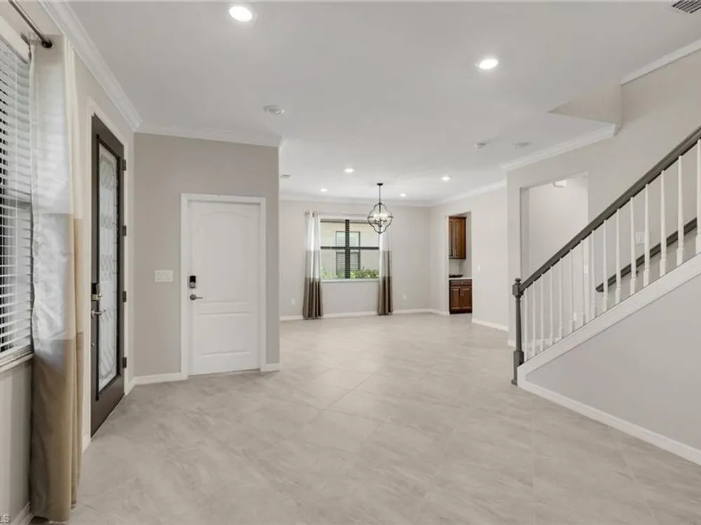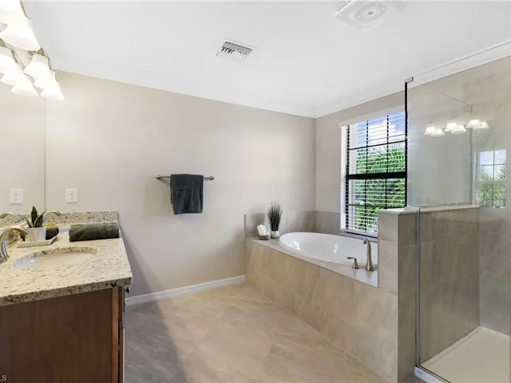 Discover refined luxury within the contemporary ambiance of this two-story Sorrento model home in The Place at Corkscrew. Offering 3,357 square feet of beautifully designed living space, this residence features 5 bedrooms, 4-1/2 bathrooms, and a versatile den/office/flex room. The open-concept design with a neutral palette and abundant natural light creates a warm and inviting atmosphere that seamlessly blends style and functionality. The kitchen is a showpiece with updated appliances, 42” chestnut-toned cabinetry, an OVERSIZED ISLAND with single-basin sink, CALACUTTA GOLD QUARTZ countertops, antiqued champagne bronze hardware, TILED BACKSPLASH, UNDER CABINET LIGHTING, dry bar, and a built-in pantry with frosted sliding glass doors. The great room makes a statement with a soaring two-story fluted wood accent wall, double-tiered chandelier, and motorized window shades. Additional features include tile flooring on the main level, manufactured hardwood upstairs, crown molding, formal dining, wainscoting in the half bath, 2” white blinds, laundry room, and a custom-built drop zone with lighting and storage. The SCREENED FRONT PORCH with fluted ceiling detail adds charm, while outdoor electric shutters on sliders and accordion shutters on windows provide peace of mind. A 3 CAR SPLIT GARAGE WITH EPOXY FLOORING, INSULATION, AND AIR CONDITIONING IN THE SINGLE BAY offers comfort and storage. The private upstairs primary suite impresses with DUAL CUSTOM BUILT CLOSETS with digital locks, a spa-inspired bath with comfort-height dual sink vanity, soaking tub, frameless glass shower, separate water closet, and linen closet with shelving and laundry drawer. Two bedrooms with custom closets share a full bath and a fourth bedroom has an ensuite, perfect for family. The fifth en-suite bedroom on the first floor features a custom closet and is an ideal space for guests. Set on a .24-acre lot with desirable SOUTHEAST REAR EXPOSURE and tranquil preserve views, this home offers a stunning outdoor retreat. The extended lanai showcases a fluted ceiling finish, dual ceiling fans, and an expansive 18’ x 24’ AWNING providing shade and rain protection. A CUSTOM HEATED POOL AND SPA create the perfect private oasis for relaxation or entertaining, complemented by a convenient FULL POOL BATH with shower. Residents of The Place at Corkscrew enjoy resort-style amenities: an indoor/outdoor restaurant and bar, Marketplace Café, Bourbon Bar, 11,000-sf zero-depth pool with waterslide, spa, splash pad, cabanas, sand volleyball, 24/7 fitness center, childcare room, movement studio, playground, and dog park. Pickleball, tennis, bocce, and basketball courts provide recreation, while Old Corkscrew Golf Club, a Jack Nicklaus Signature public course, is just beyond the gates. With low HOA fees, a no flood zone location, and proximity to RSW Airport, FGCU, shopping, dining, and Gulf beaches, The Place at Corkscrew stands out as one of the most desirable communities in Southwest Florida.