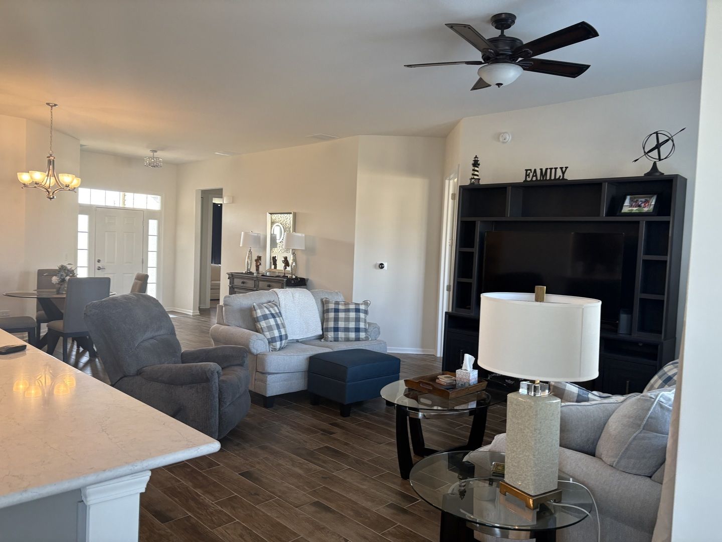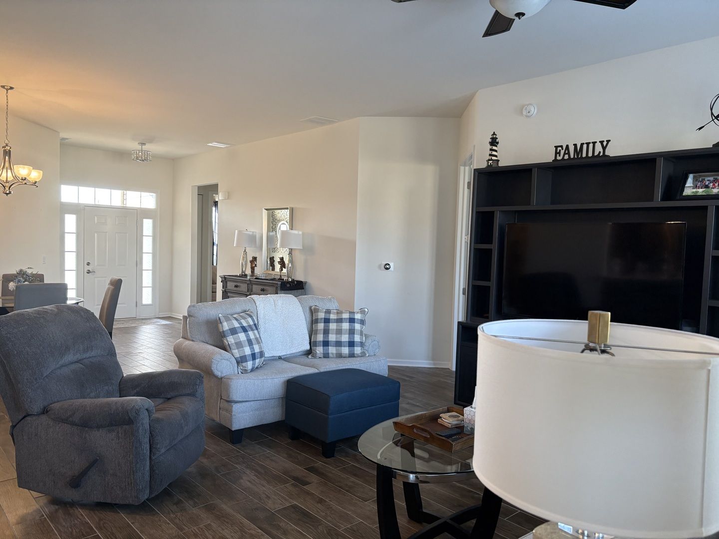 Fabulous Brick Front "Coral Springs" Former Builders Model Built in 2021 Featuring Soaring 10 Foot Ceilings, Sunny Eat in Kitchen with Stainless Steel Appliances, Custom Cabinetry, Breakfast Bar, Upgraded Light Fixtures, Pantry, Tiled Flooring, Sliding Glass Door to Nice Size Patio, Opens to Family Room with Custom Window Treatments, Ceiling Fan, Upgraded Ceramic Tile Flooring, (Some Furniture For Sale) Newer Neutral Carpet in Bedrooms, Six Panel White Doors and Trim, Private Master Suite with Separate Closets, Adult Height Vanities, Walk in Shower, and Linen Closet! Bedroom Two Features Window Treatments, Ceiling Fan, Adjacent to 2nd Full Bath, Huge Foyer and Spacious Dining Room with Upgraded Light Fixture, Laundry Room Features Washer/Dryer Plus Tub, Insulated Two Car Garage, In-Ground Sprinkler System, and Covered Front Porch! Pool & Clubhouse Community, Ponds, Walking Paths, Exercise Facility, Home Shows Like New! HURRY