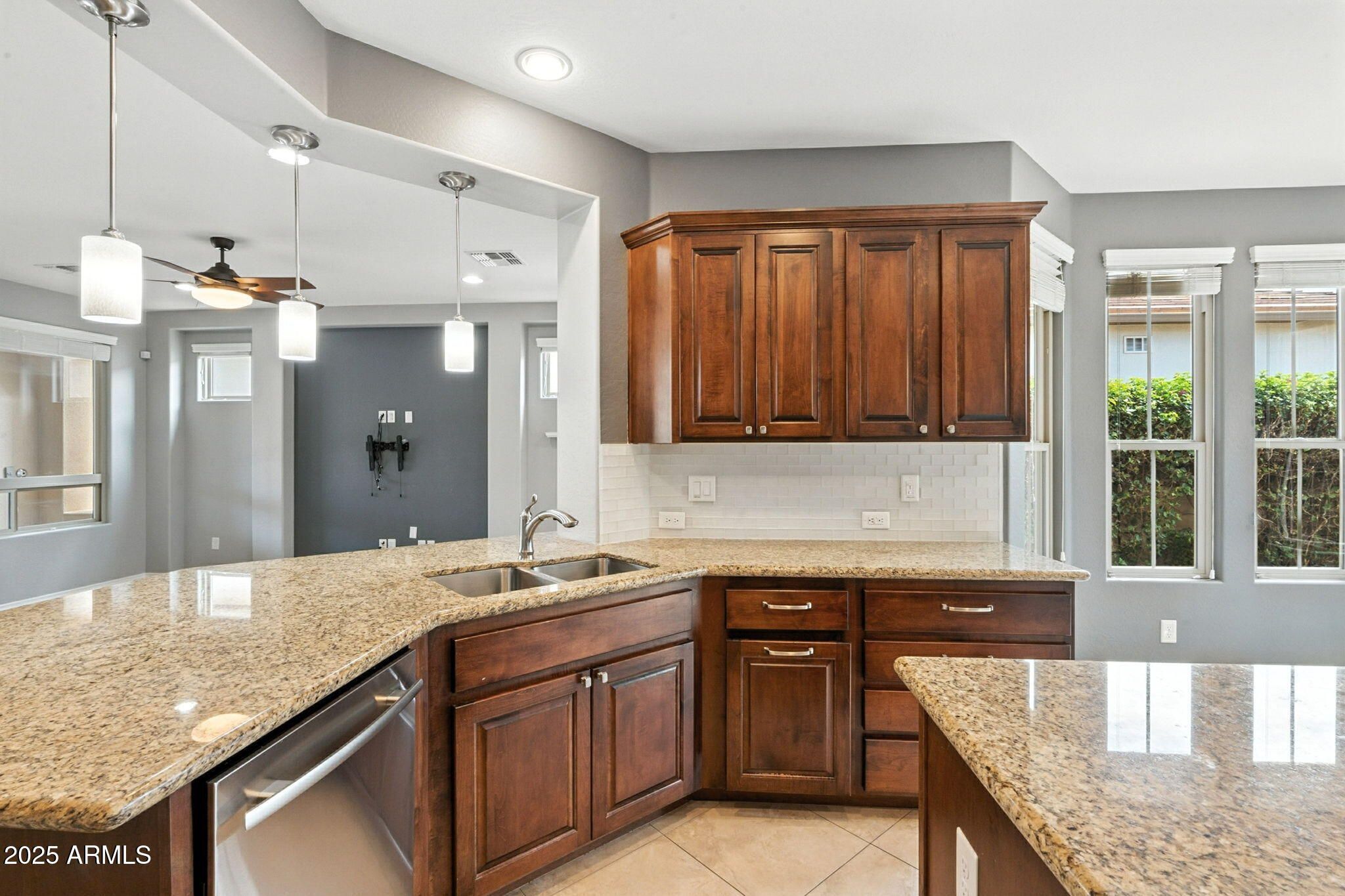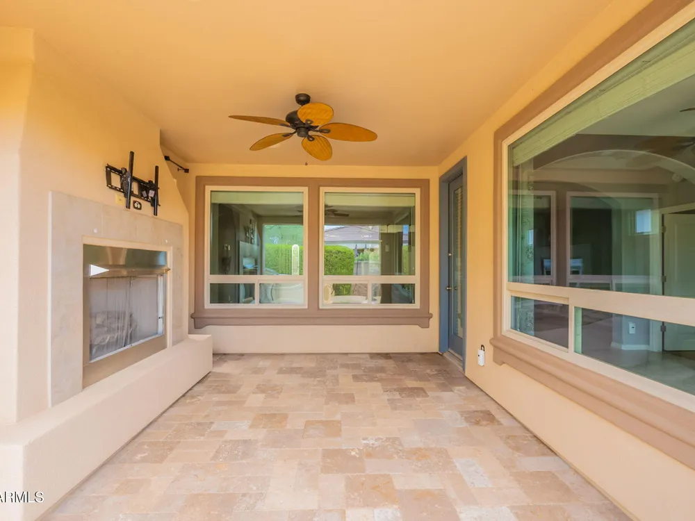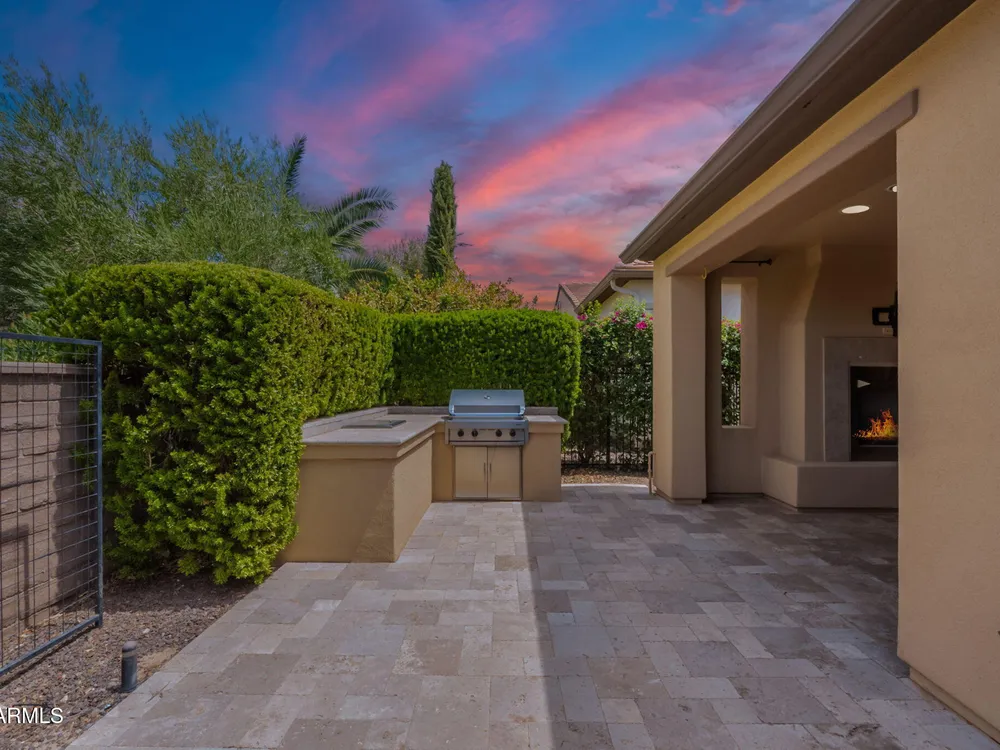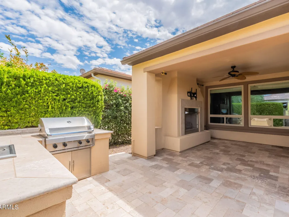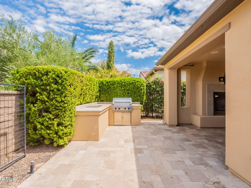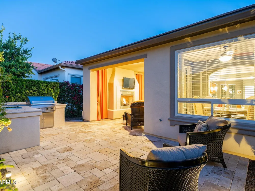 Step into this beautiful home offering 2 bedrooms, a spacious den, 2 bathrooms, and a 2-car garage. The open-concept great room features elegant 20'' tile flooring and a generous dining area perfect for entertaining. The light-filled kitchen offers granite countertops, a large island, spacious pantry, staggered maple cabinetry and stainless steel appliances The primary suite includes a tiled walk-in shower with built-in seating, a heavy glass enclosure, dual under-mount sinks, and a spacious closet. Step outside to a private backyard retreat with a gas fireplace, built-in BBQ, and beautifully laid travertine marble pavers, all surrounded by a block privacy wall, ideal for relaxing or hosting guests. Additional highlights include garage storage cabinets and soft water system.