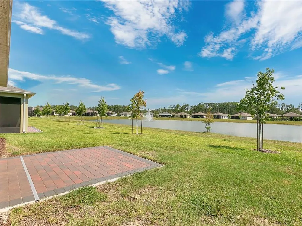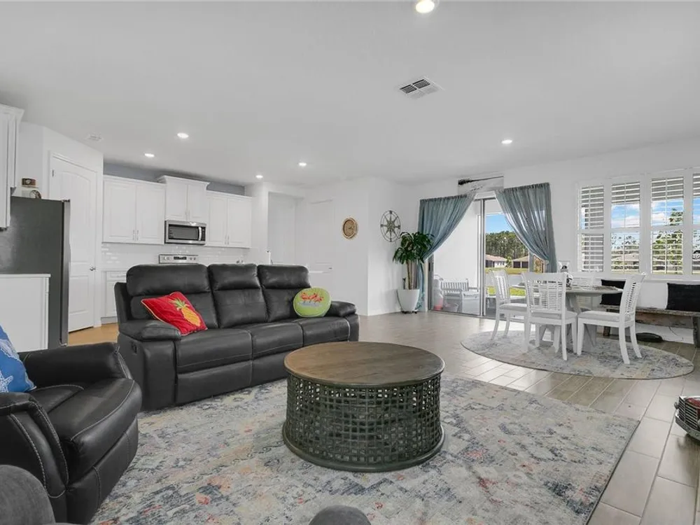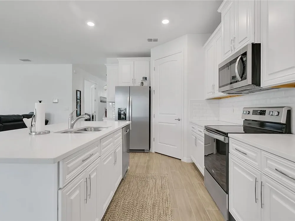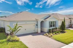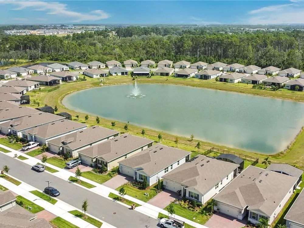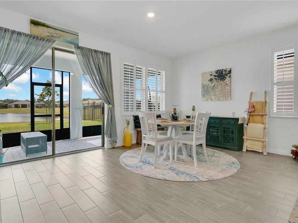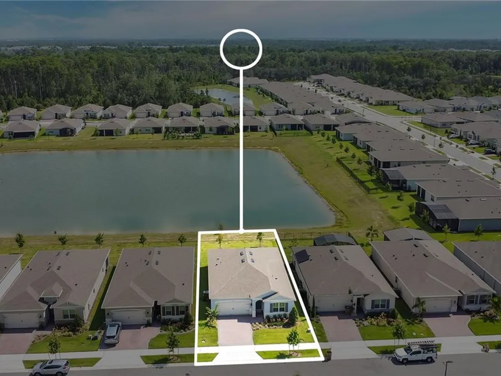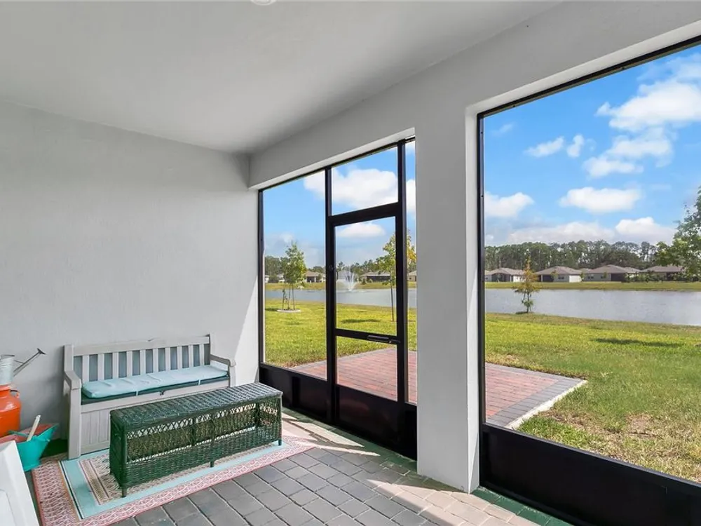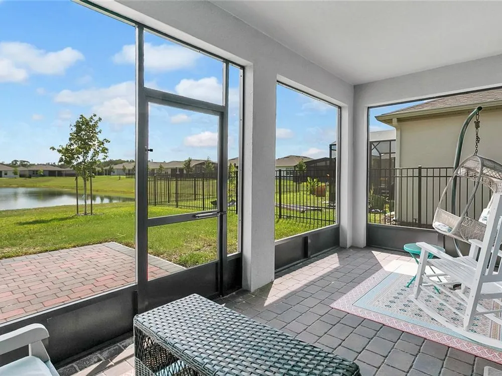 Welcome home to a light-filled water front retreat where comfort meets function. As you walk through the front door, you're greeted by warm wood-look tile floors and a bright, open layout. To your left, the kitchen catches your eye—quartz countertops, 42" crisp white deluxe soft-close cabinets and drawers, stainless steel appliances, and a classic subway tile backsplash create a space that’s both stylish and practical. Imagine cooking here, with guests relaxing just steps away in the open living room filled with natural light from the large sliding glass doors. Step out onto the screened-in lanai and enjoy quiet mornings, cool evening gatherings, or simply soak in the Florida breeze and pond views. The layout offers a thoughtful split floor plan, with the primary suite tucked away for privacy, complete with two spacious walk-in closets and an en-suite bath. In the front of the home, an additional bedroom and flex space with french doors provide space for guests, hobbies, or working from home. Smart features, like the keyless entry, camera doorbell, thermostat, and Deako interchangeable switches add convenience and peace of mind to your daily routine. Tall 9'4" ceilings and 8' doors throughout add to the feeling of freedom. Beyond the home, residents love the active adult community of Palms at Serenoa for its resort-style amenities including a secured gate, clubhouse, zero-entry pool, fitness center, dog park, and walking trails, cable TV, internet, and lawn care included! Located near shopping, dining, Disney, and the future Olympus project, it’s easy to see why this community is such a draw.