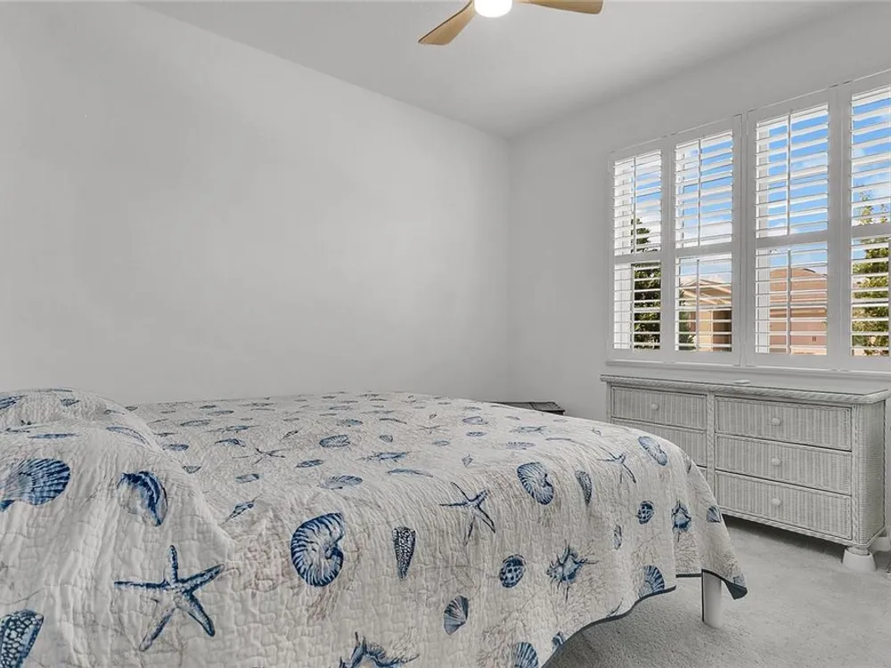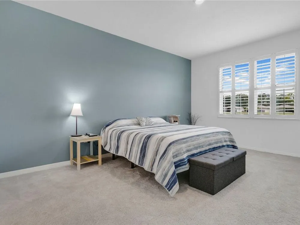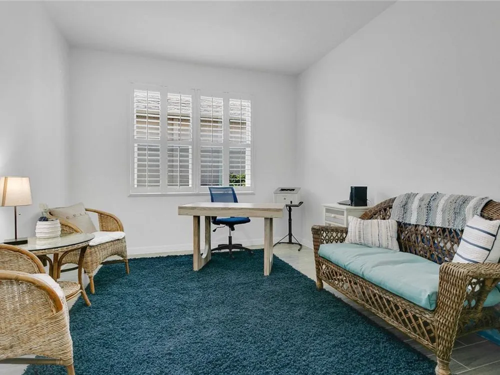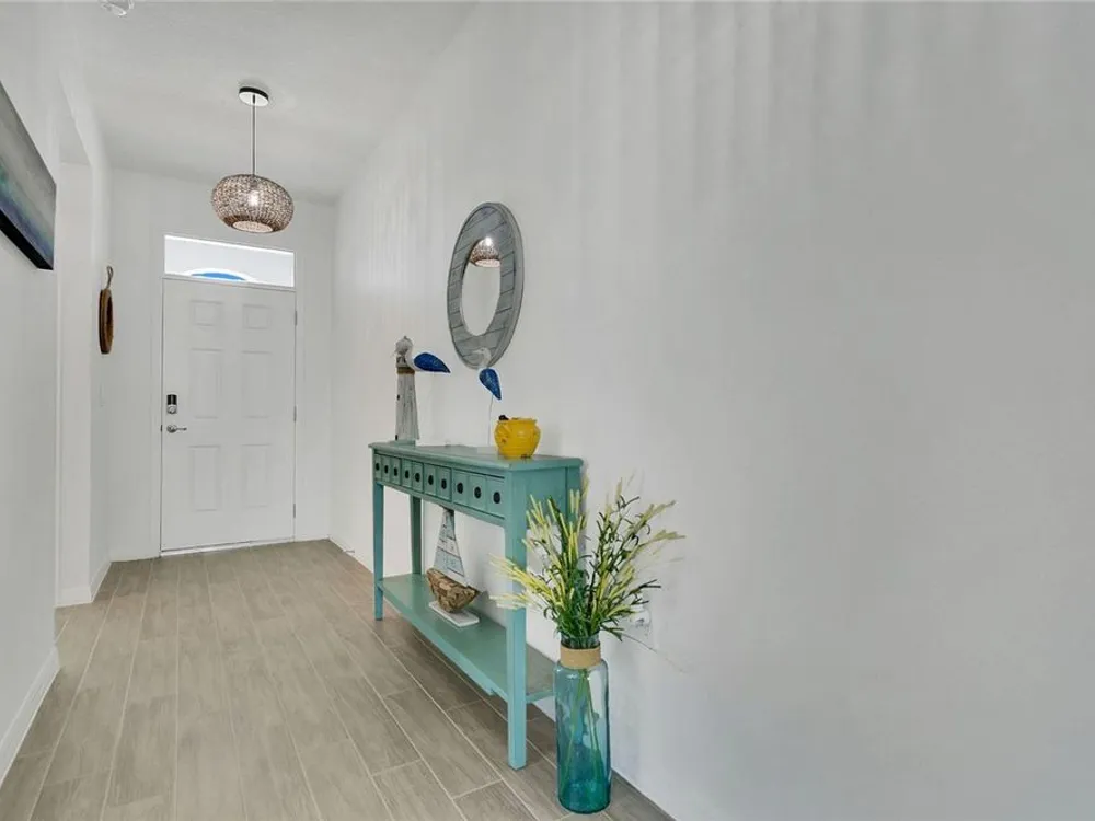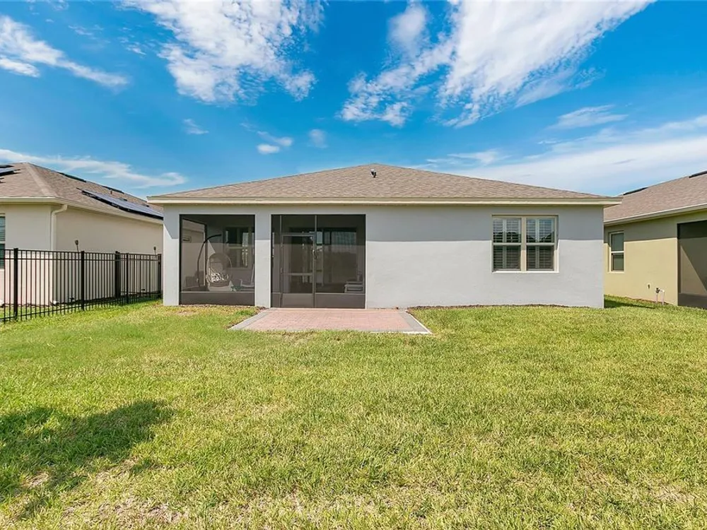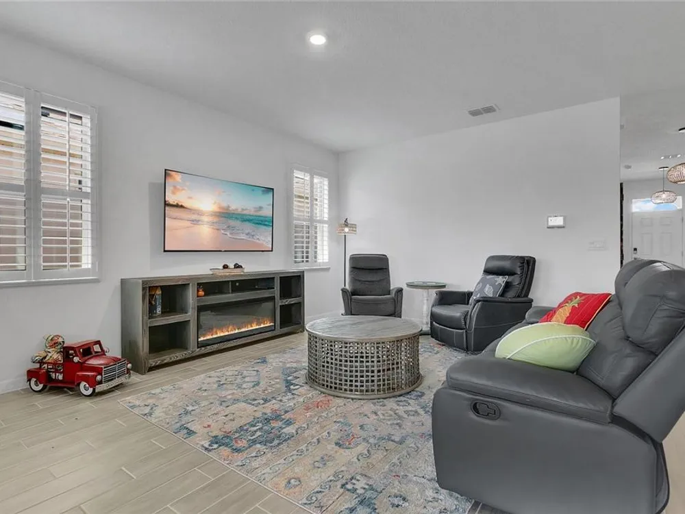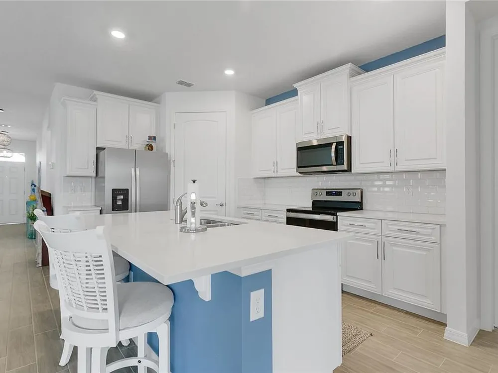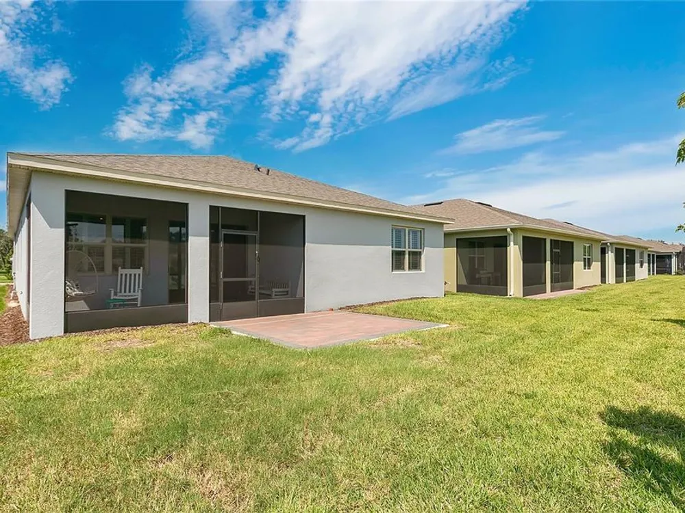Welcome home to a light-filled water front retreat where comfort meets function. As you walk through the front door, you're greeted by warm wood-look tile floors and a bright, open layout. To your left, the kitchen catches your eye—quartz countertops, 42" crisp white deluxe soft-close cabinets and drawers, stainless steel appliances, and a classic subway tile backsplash create a space that’s both stylish and practical. Imagine cooking here, with guests relaxing just steps away in the open living room filled with natural light from the large sliding glass doors. Step out onto the screened-in lanai and enjoy quiet mornings, cool evening gatherings, or simply soak in the Florida breeze and pond views. The layout offers a thoughtful split floor plan, with the primary suite tucked away for privacy, complete with two spacious walk-in closets and an en-suite bath. In the front of the home, an additional bedroom and flex space with french doors provide space for guests, hobbies, or working from home. Smart features, like the keyless entry, camera doorbell, thermostat, and Deako interchangeable switches add convenience and peace of mind to your daily routine. Tall 9'4" ceilings and 8' doors throughout add to the feeling of freedom. Beyond the home, residents love the active adult community of Palms at Serenoa for its resort-style amenities including a secured gate, clubhouse, zero-entry pool, fitness center, dog park, and walking trails, cable TV, internet, and lawn care included! Located near shopping, dining, Disney, and the future Olympus project, it’s easy to see why this community is such a draw.