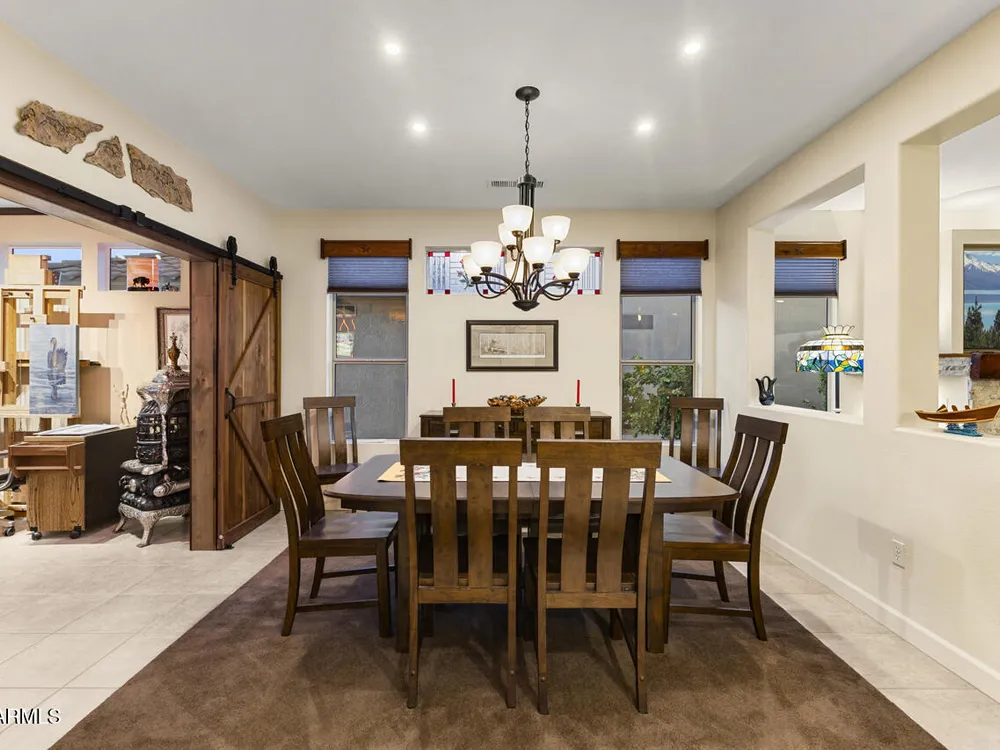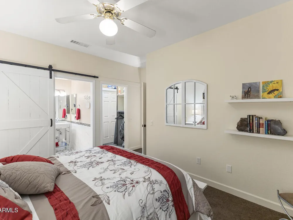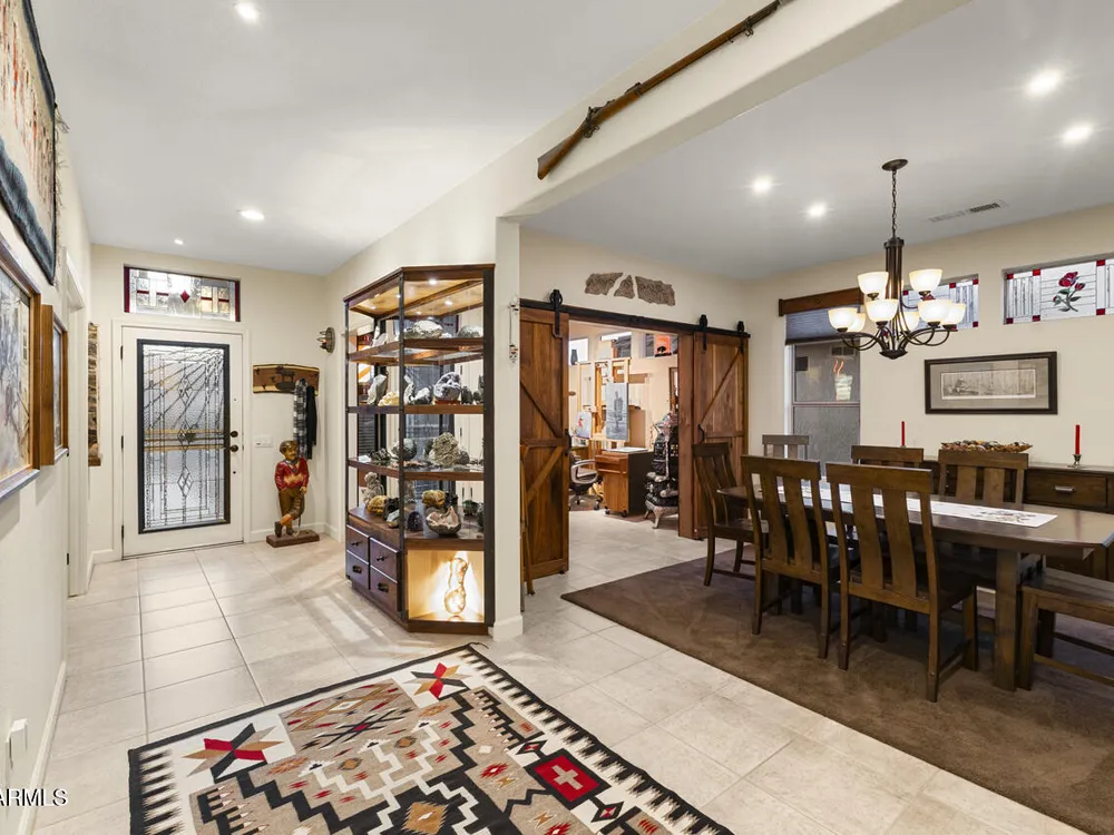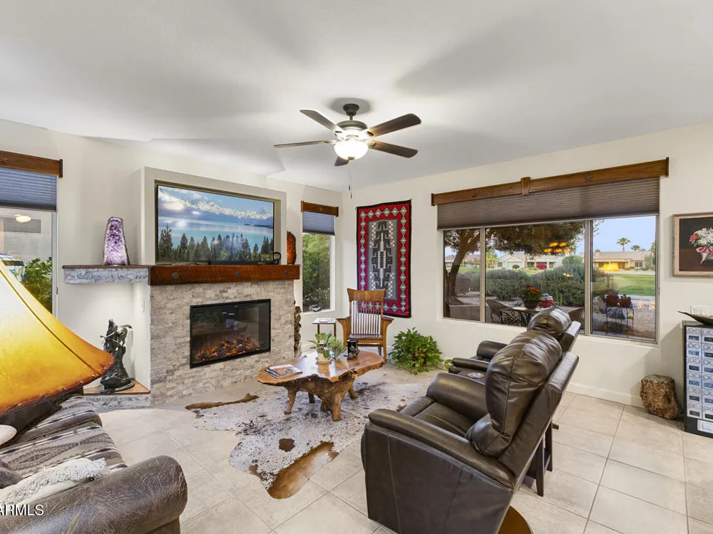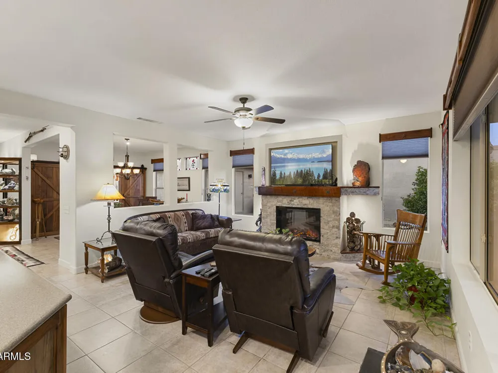 A UNIQUE JASMINE situated mid-fairway #12, Granite Falls South. Fantastic curb appeal surrounds the extra large coated driveway & walkway to the front of this 3 BR / 2.5 BA home w/ its many updates and custom features. Step into the large entryway through a security door & beautiful front door w/glass insert. To the left, the once extra large living/dining area has been perfectly divided into 2 useful spaces. The first space can be used as an office, hobby room or extra sleeping area, with privacy provided by 2 custom, rustic style barn doors. The other area is the formal dining space. To the right, thru double doors is a bedroom/den complete with a closet.The bright, open Great Room w/ panoramic golf course views has plenty of windows for lots of natural light. A brand new electric fireplace, recessed television, custom mantle & stone surrounds offer a cozy ambiance, even when you don't need the heat! The spacious, eat-in kitchen is perfect if you love to cook or entertain. Lots of cabinets & counter space w/beautiful granite tops, breakfast bar for added seating, large island, pantry, upgraded appliances including a red enamel gas range & stainless steel range hood. Upgraded lighting & pendants, & the beautiful golf course view make this kitchen so special. Off of the main hallway is a convenient powder room, perfect for guests. The primary suite is large, bright & offers yet another view of the golf course. The en-suite bath boasts a large vanity w/double sinks, granite tops, walk-in closet w/custom closet organizers, including drawers & shelves, a large walk-in, tiled shower, updated fixtures. No glass doors to clean! The spacious guest bedroom has a custom barn door separating the en-suite from the bedroom. The bathroom is complete w/custom tile flooring, tub/shower & retro pedestal style sink. Walk-in closet w/built-ins & a 2nd closet w/sliding doors in back, offering additional storage. In the main hallway, a custom decorative wall w/wood plank & shelves makes a perfect statement wall for displaying art & collectibles. If you are a project person this full 3 car, air conditioned garage will be your haven. To the left of the main 2 car garage a large space, perfect for added storage and a workshop. The extended patio is truly a sanctuary. Plenty of room for seating, entertaining or just relaxing, while enjoying the views. The east exposure coupled w/the sound of a tranquil water feature is perfect for your morning coffee. Look no more...........make this your new home TODAY!