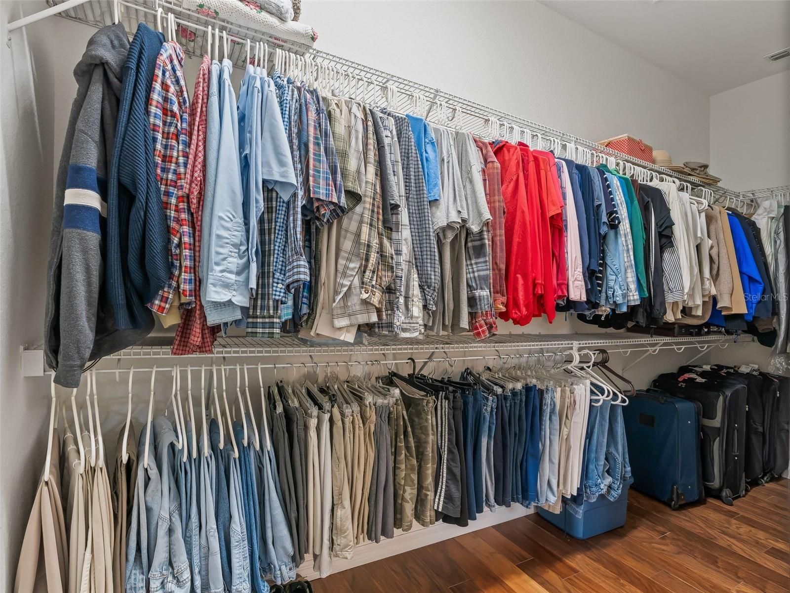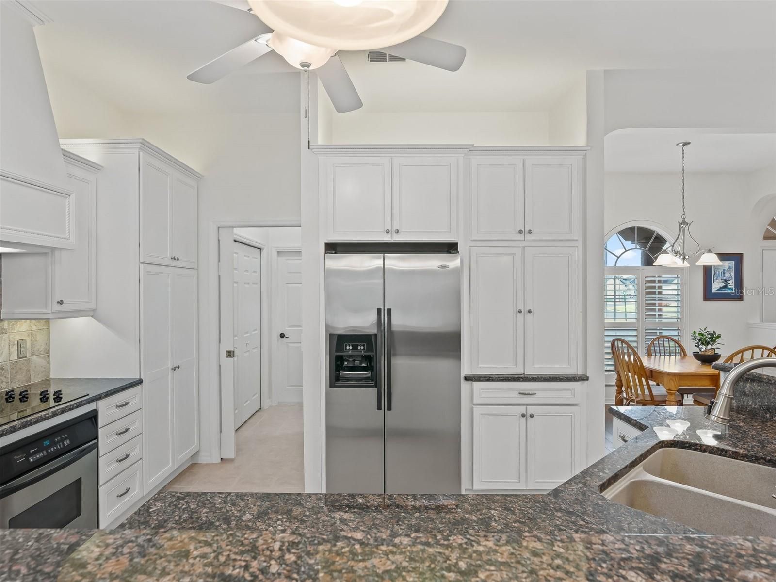 - Ceiling Fan(s), Eat-in Kitchen, High Ceilings, Living/Dining Room, Open Floorplan, Main Level Primary, Solid Surface Counters, Solid-Wood Cabinets, Split Bedrooms, Stone Counters, Thermostat, Walk-In Closet(s)