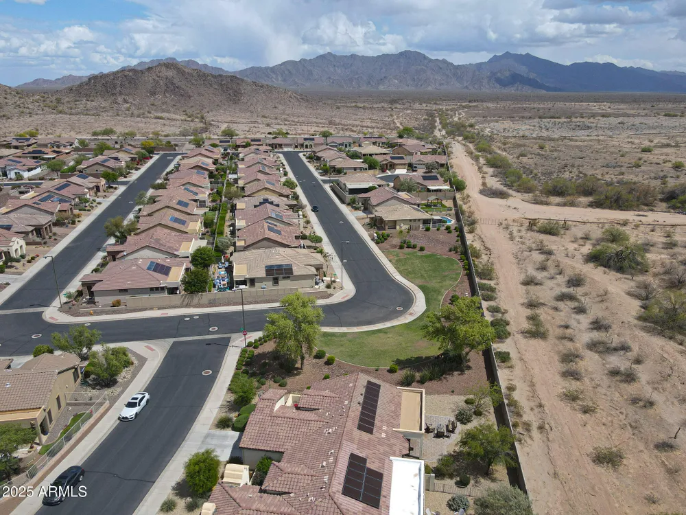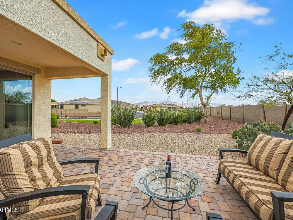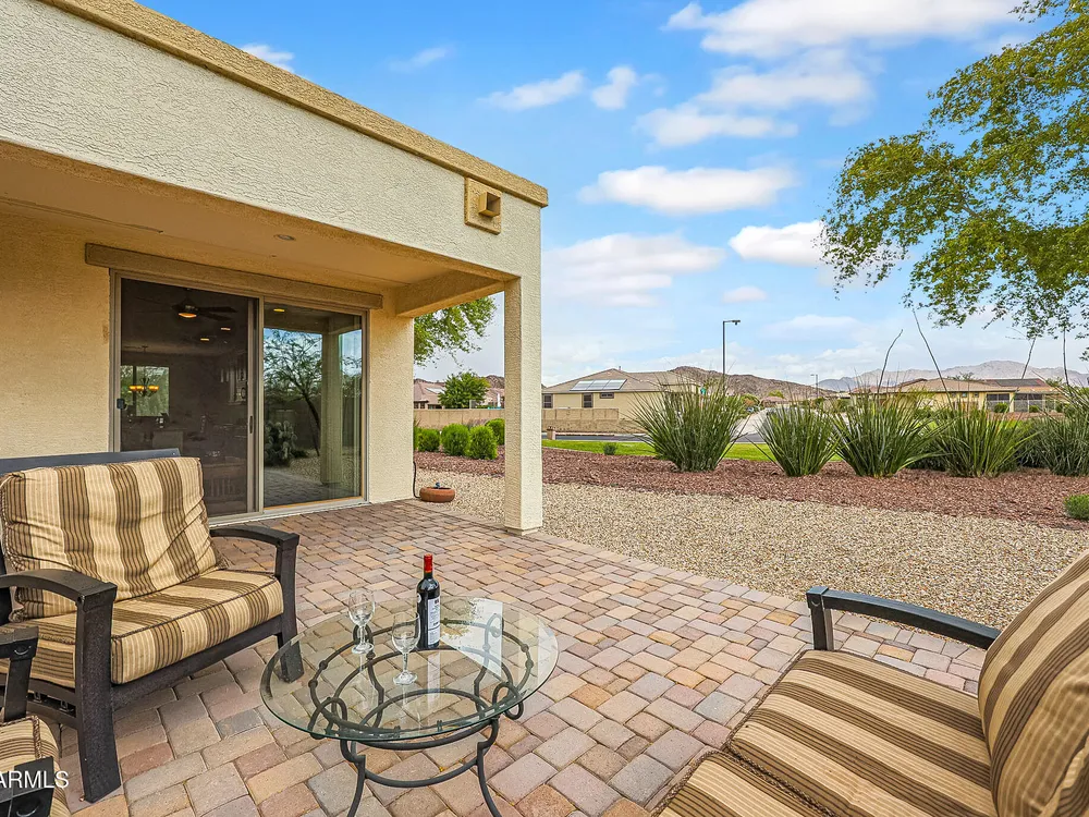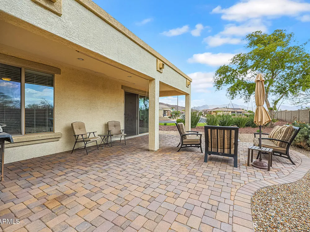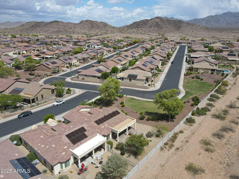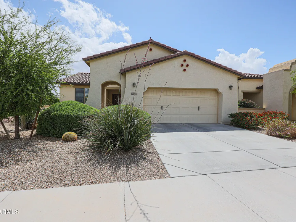 Nestled in the breathtaking, lake-inspired community of CantaMia, this stunning upgraded Melody floorplan offers the ultimate Active Adult 55+ lifestyle with a perfect blend of relaxation and adventure! Situated on a premium corner lot, you'll wake up to breathtaking mountain views and enjoy a spacious, extended south-facing patio—ideal for morning coffee, evening gatherings, or simply soaking in the Arizona sunshine. The backyard offers privacy with no neighbors directly behind, while the common space to the East adds an extra sense of openness. Designed for both style and convenience, this home is move-in ready with high-end finishes throughout—including granite countertops, upgraded cabinetry with roll-out shelves, and sleek tile flooring in all high-traffic areas. The bedrooms are cozy with plush upgraded Berber carpet, while the epoxy-coated garage floor and built-in cabinets provide extra storage and functionality. Enjoy the ease of a fully equipped home, complete with all appliances - including a refrigerator, washer, and dryer. All furnishings are available for purchase as well making this a truly turn key opportunity. And the best part? This home comes with fully owned solar, allowing you to enjoy year-round comfort while significantly reducing energy costs! Live the dream in a community that embraces resort-style living, with picturesque walking trails, serene lakes, and endless opportunities to connect and thrive. Welcome home to CantaMia!