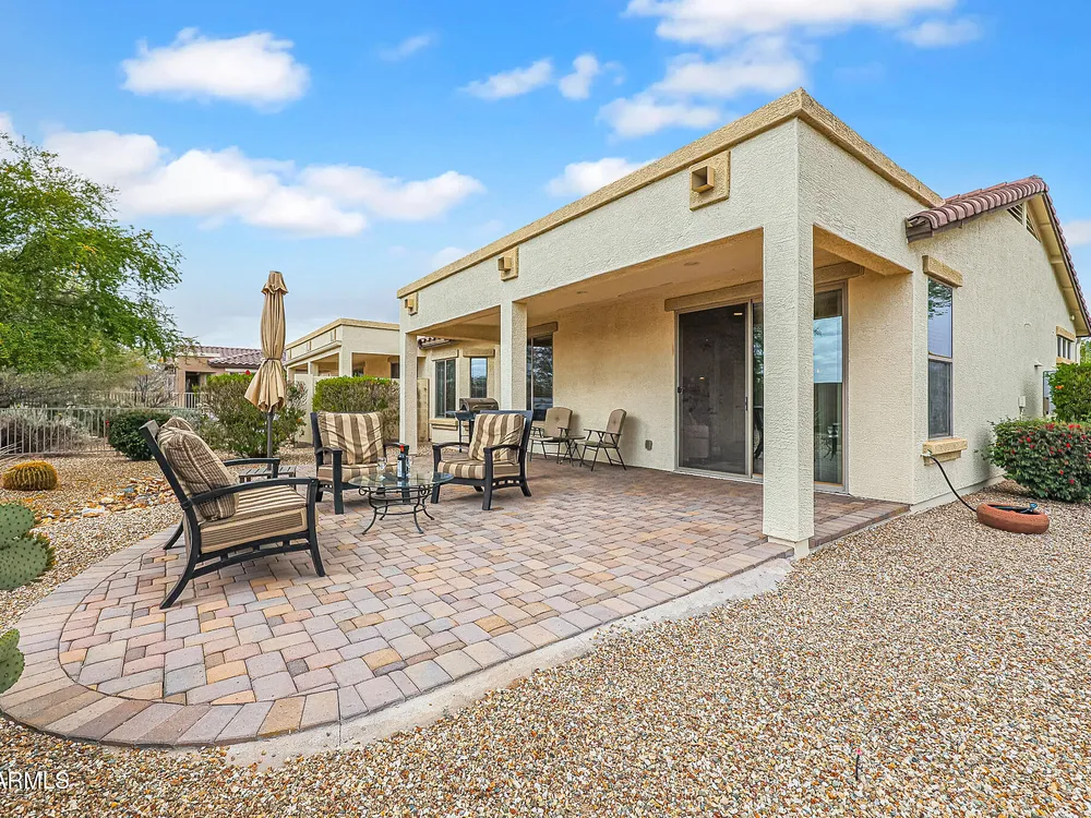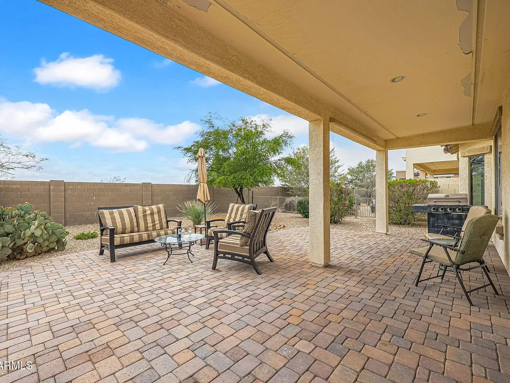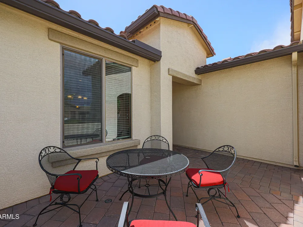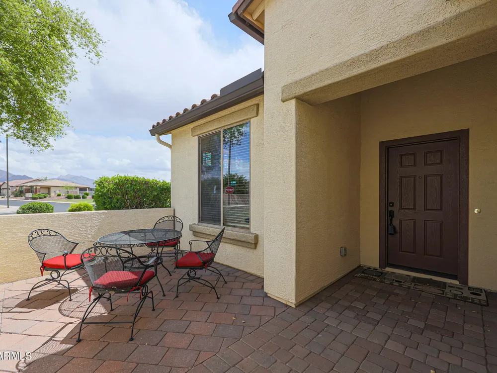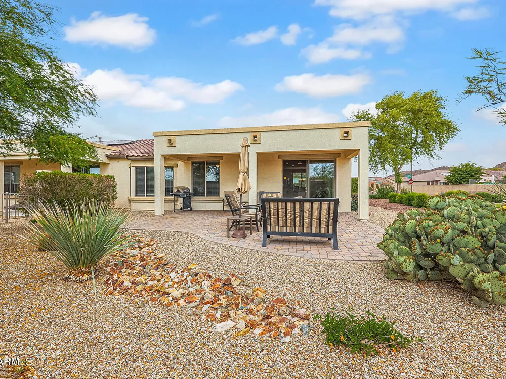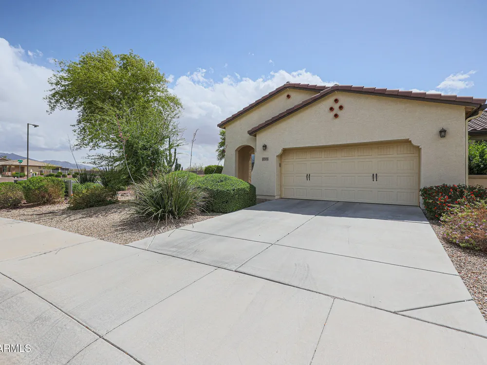 Nestled in the breathtaking, lake-inspired community of CantaMia, this stunning upgraded Melody floorplan offers the ultimate Active Adult 55+ lifestyle with a perfect blend of relaxation and adventure! Situated on a premium corner lot, you'll wake up to breathtaking mountain views and enjoy a spacious, extended south-facing patio—ideal for morning coffee, evening gatherings, or simply soaking in the Arizona sunshine. The backyard offers privacy with no neighbors directly behind, while the common space to the East adds an extra sense of openness. Designed for both style and convenience, this home is move-in ready with high-end finishes throughout—including granite countertops, upgraded cabinetry with roll-out shelves, and sleek tile flooring in all high-traffic areas. The bedrooms are cozy with plush upgraded Berber carpet, while the epoxy-coated garage floor and built-in cabinets provide extra storage and functionality. Enjoy the ease of a fully equipped home, complete with all appliances - including a refrigerator, washer, and dryer. All furnishings are available for purchase as well making this a truly turn key opportunity. And the best part? This home comes with fully owned solar, allowing you to enjoy year-round comfort while significantly reducing energy costs! Live the dream in a community that embraces resort-style living, with picturesque walking trails, serene lakes, and endless opportunities to connect and thrive. Welcome home to CantaMia!
