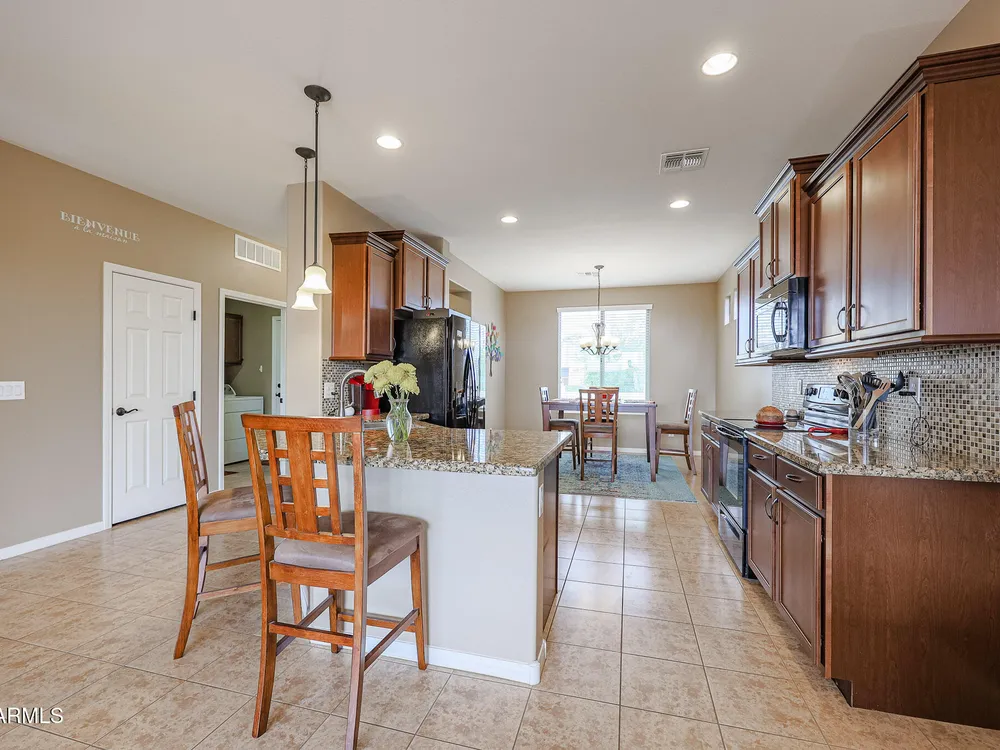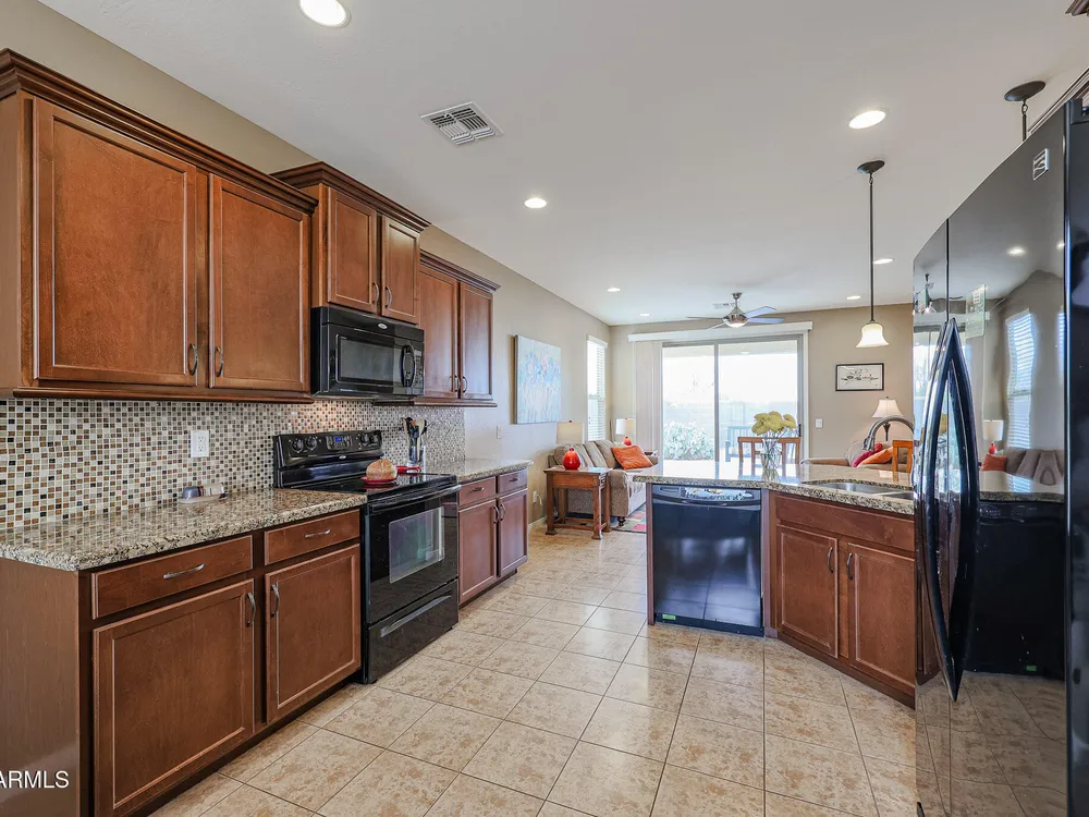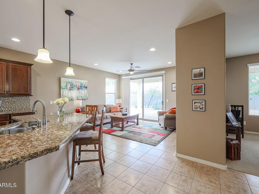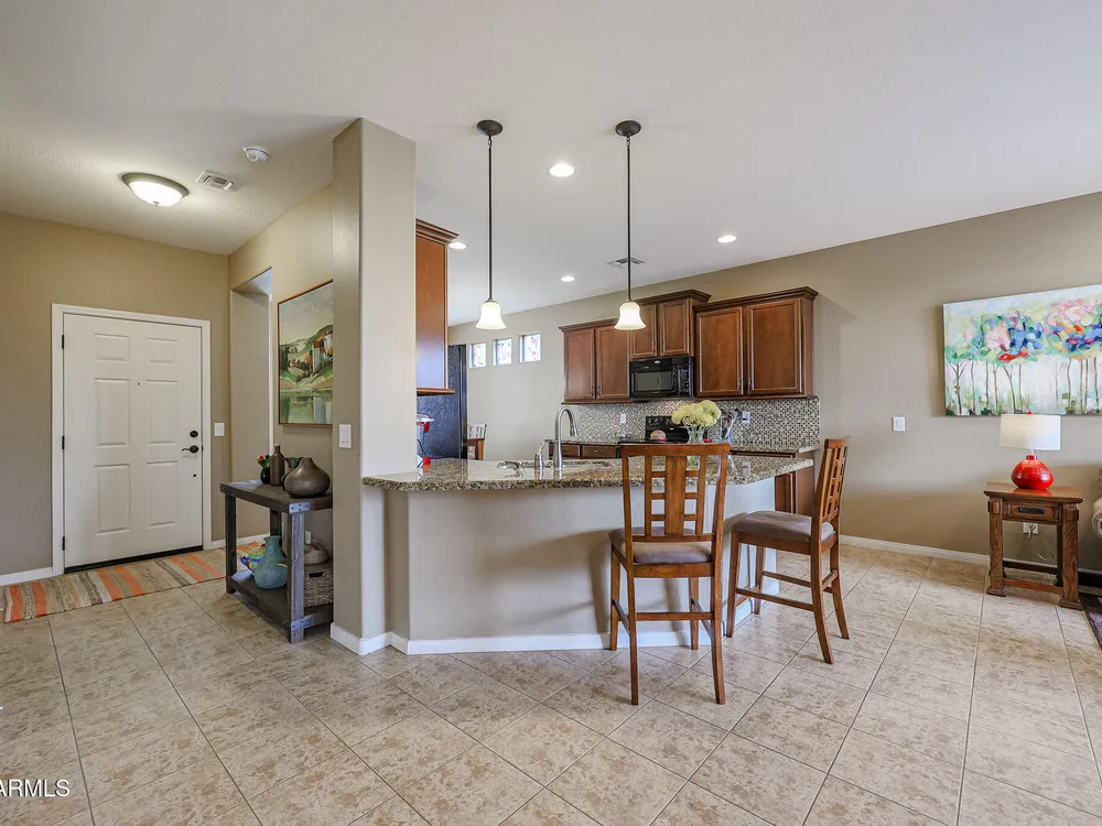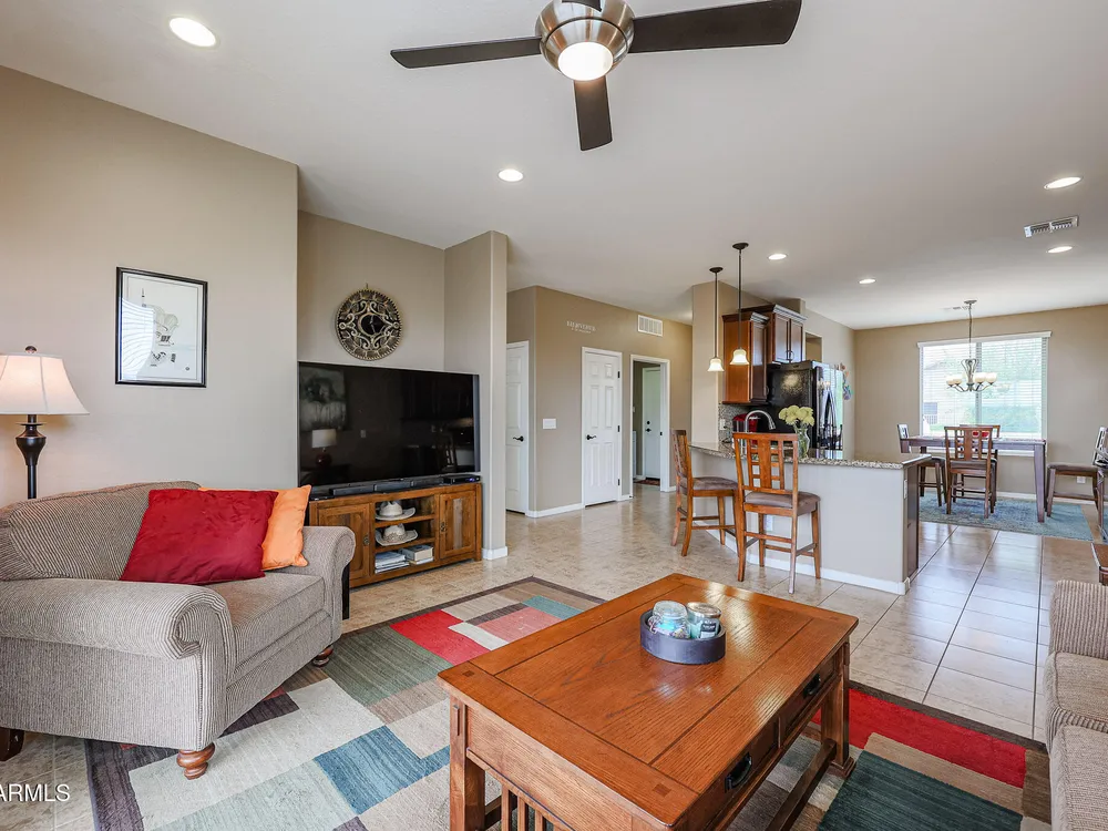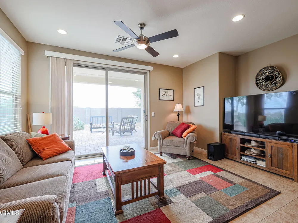 Nestled in the breathtaking, lake-inspired community of CantaMia, this stunning upgraded Melody floorplan offers the ultimate Active Adult 55+ lifestyle with a perfect blend of relaxation and adventure! Situated on a premium corner lot, you'll wake up to breathtaking mountain views and enjoy a spacious, extended south-facing patio—ideal for morning coffee, evening gatherings, or simply soaking in the Arizona sunshine. The backyard offers privacy with no neighbors directly behind, while the common space to the East adds an extra sense of openness. Designed for both style and convenience, this home is move-in ready with high-end finishes throughout—including granite countertops, upgraded cabinetry with roll-out shelves, and sleek tile flooring in all high-traffic areas. The bedrooms are cozy with plush upgraded Berber carpet, while the epoxy-coated garage floor and built-in cabinets provide extra storage and functionality. Enjoy the ease of a fully equipped home, complete with all appliances - including a refrigerator, washer, and dryer. All furnishings are available for purchase as well making this a truly turn key opportunity. And the best part? This home comes with fully owned solar, allowing you to enjoy year-round comfort while significantly reducing energy costs! Live the dream in a community that embraces resort-style living, with picturesque walking trails, serene lakes, and endless opportunities to connect and thrive. Welcome home to CantaMia!