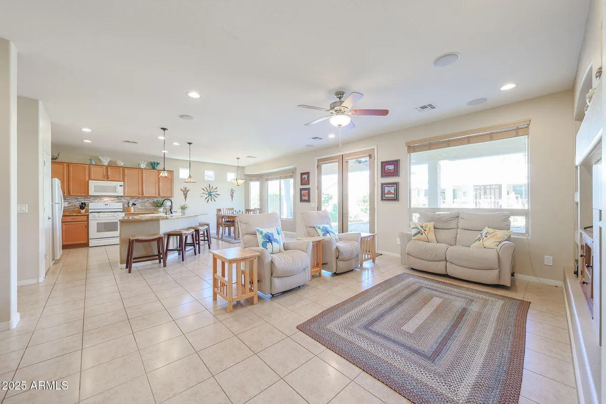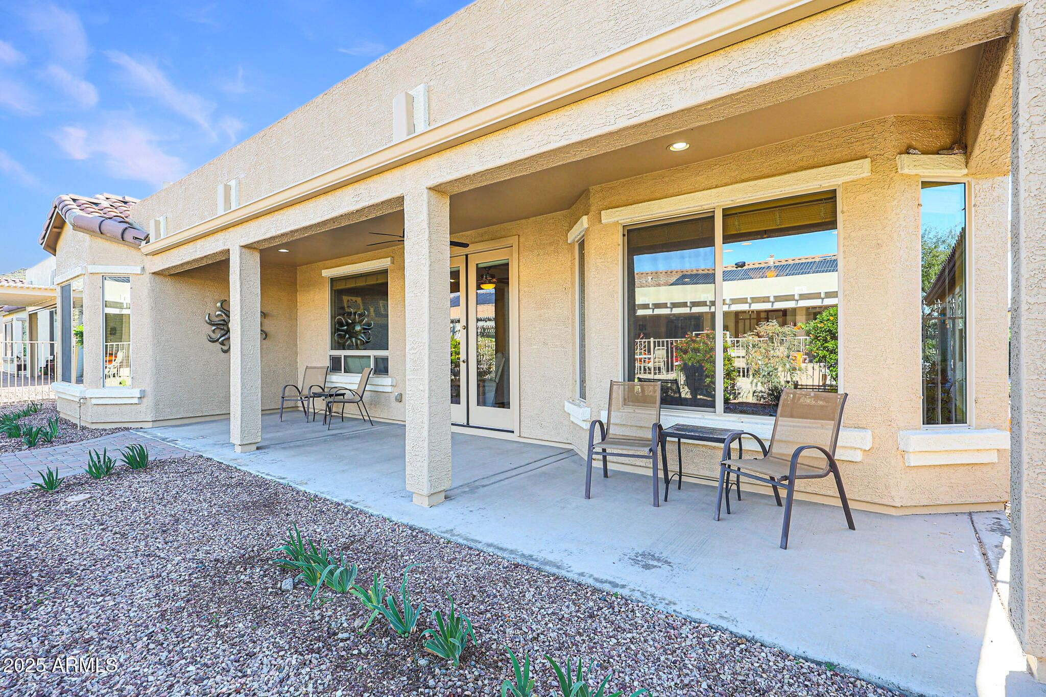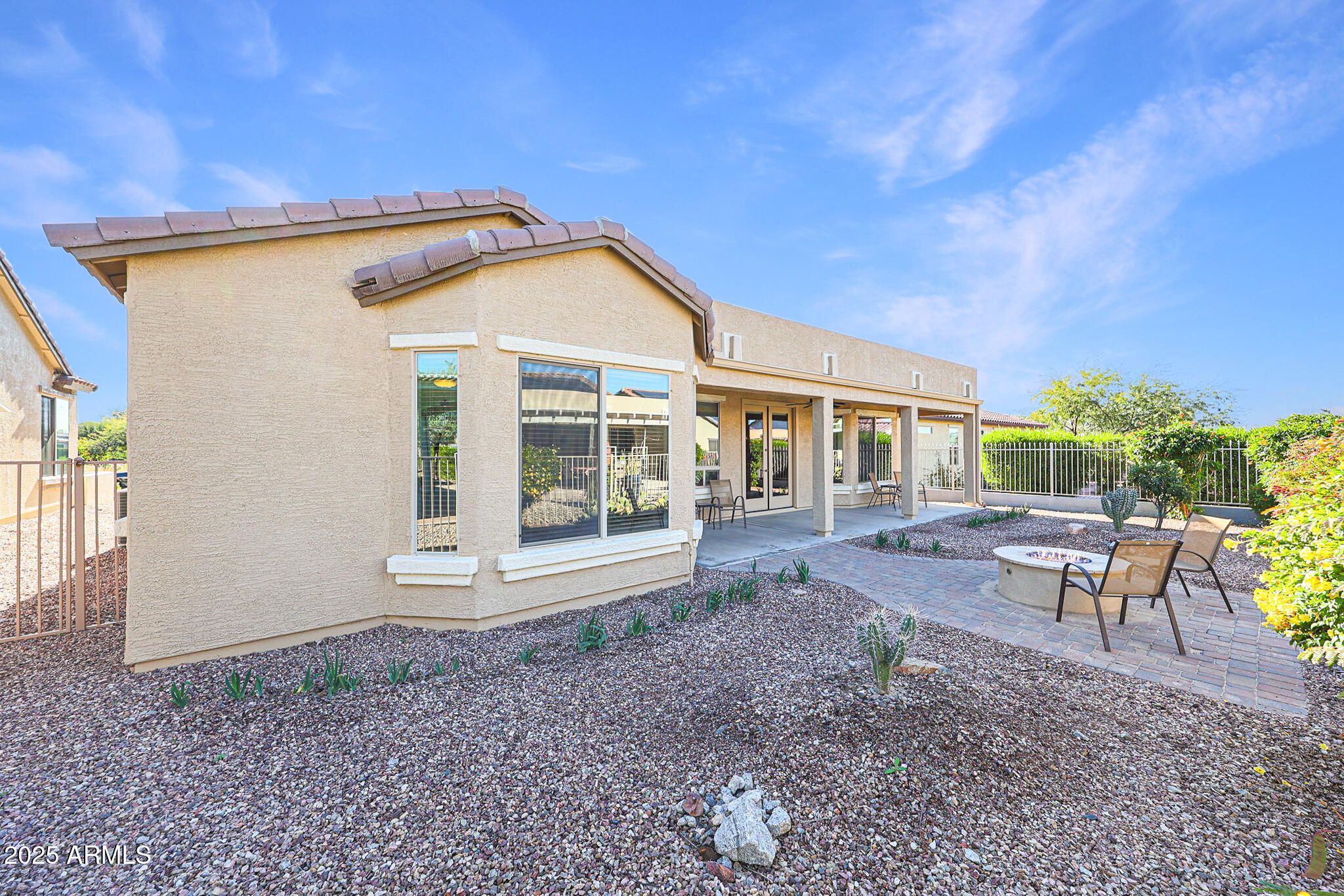 Welcome to this beautiful move-in ready 2-bedroom, 2-bath home with a den/office, where comfort, style, and resort-style living come together effortlessly. Behind elegant glass double doors, the versatile den offers the perfect space for a home office, hobby room, or quiet retreat. Enjoy exceptional energy savings with a solar system that saves approximately $1,800 per year, is grandfathered into netmetering, and delivers average electric bills of just $44/month - a rare and valuable benefit. From the moment you arrive, the charming front patio invites you to slow down, sip your morning coffee, and connect with neighbors. Inside, tile flooring flows throughout the entire home creating a clean, stylish, and low-maintenance living environment. The light-filled kitchen is is both warm and functional, featuring medium-toned wood cabinetry, granite countertops, a designer backsplash, and a gas stove. It opens seamlessly to the dining area with a lovely bay window and a cozy family room anchored by a gas fireplace, perfect for relaxed evenings at home. The spacious primary suite feels like a personal sanctuary, complete with a bay window ideal for a reading nook, and an en suite bath offering dual sinks and a large walk-in shower. Step outside to a fully fenced backyard designed for entertaining and relaxation, featuring an oversized covered patio, extended paver patio with firepit, and low-maintenance desert landscaping - perfect for Arizona evenings under the stars. All of this is located within the award-winning, 55+ resort-style community of CantaMia, where everyday life feels like a vacation. Residents enjoy indoor and outdoor pools, a state-of-the-art fitness center, pickleball and tennis courts, scenic walking paths, creative arts studios, on-site dining, and a vibrant calendar of clubs and social events. This is more than a home - it's a lifestyle you'll love coming home to.