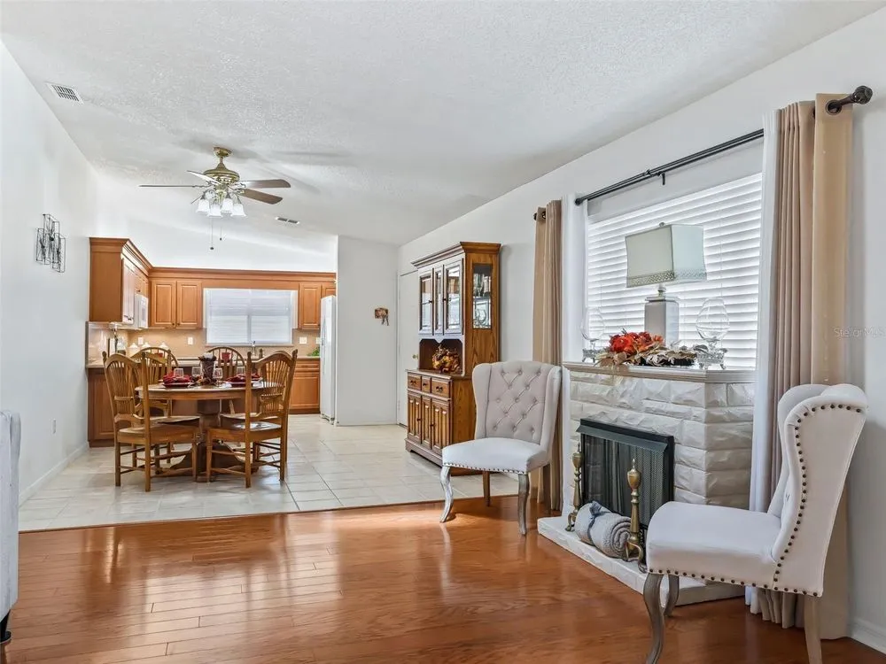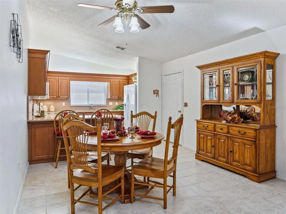 - Ceiling Fan(s), Eat-in Kitchen, High Ceilings, Kitchen/Family Room Combo, Living/Dining Room, Open Floorplan, Main Level Primary, Solid Surface Counters, Solid-Wood Cabinets, Split Bedrooms, Thermostat, Walk-In Closet(s), Window Treatments