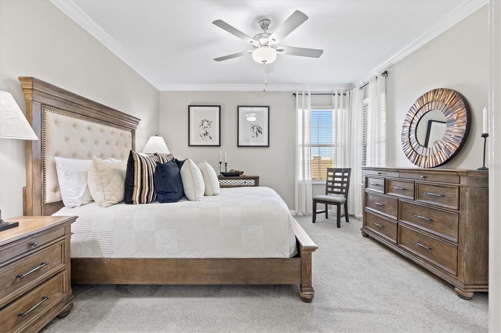 - Ceiling Fan(s), Crown Molding, Eat-in Kitchen, Living/Dining Room, Open Floorplan, Main Level Primary, Stone Counters, Thermostat, Walk-In Closet(s)