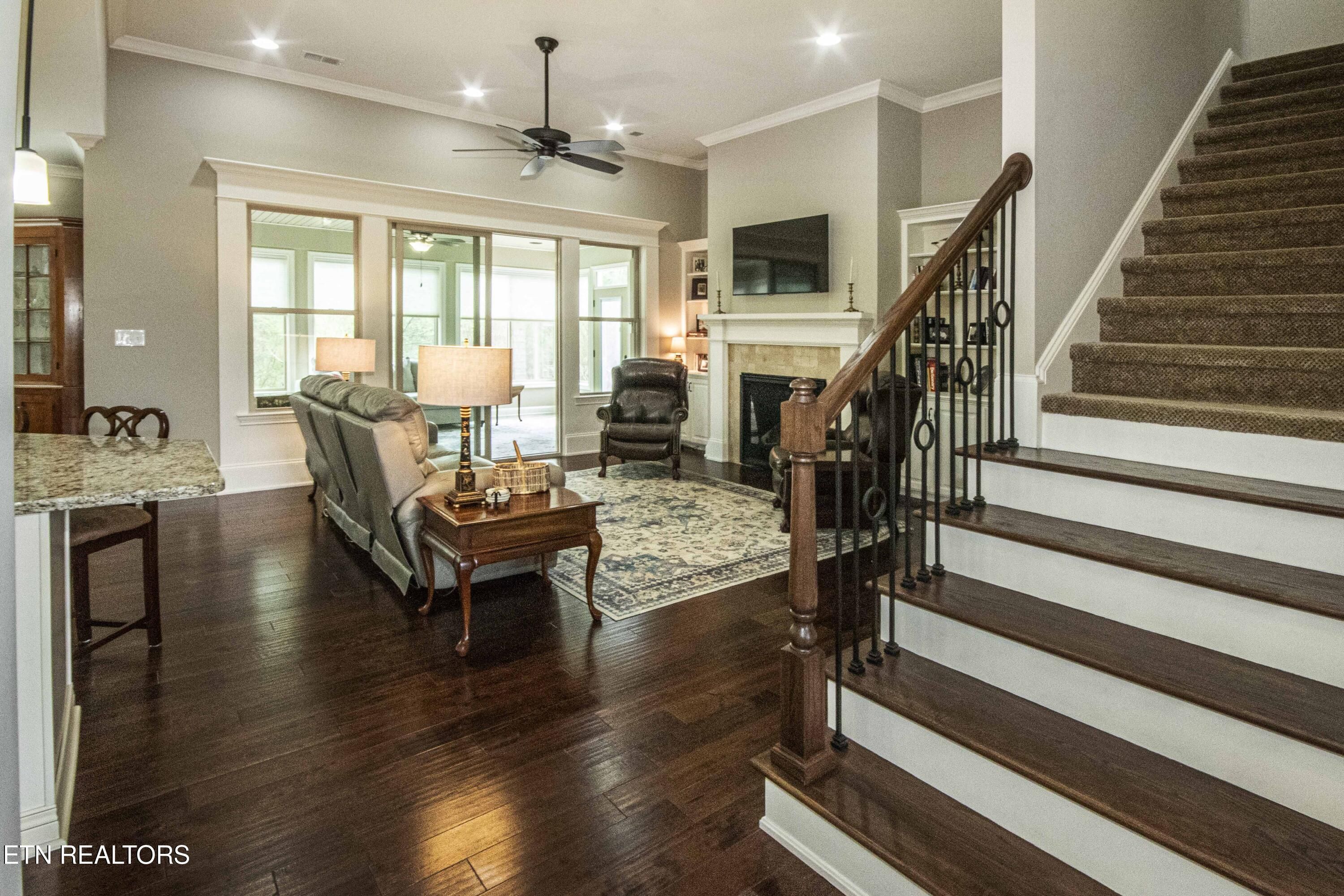 Bright, neutral, and move-in ready, this beautifully maintained home blends quality finishes with a comfortable, easy-flowing layout. Thoughtful details like arched doorways, crown molding, hand-scraped hardwood floors, and custom millwork add character throughout. The Great Room features a soaring 12-foot ceiling and gas fireplace--perfect for relaxing or gathering with friends and family. The kitchen offers a large island with breakfast bar, cream cabinetry, granite countertops, travertine tile backsplash, GE stainless steel appliances, and a walk-in pantry. Just off the kitchen, the dining area a tray ceiling overlooks the wooded common area. The temperature controlled sunroom is a favorite spot, with sliding windows that let in fresh air and peaceful views of the wooded common area--often with deer passing through. The main level includes the spacious primary suite and a second bedroom for flexible living. The primary bath features a large tile-and-glass shower and an oversized walk-in closet. Upstairs, you'll find a generous third bedroom and full bath--ideal for guests, a home office, or bonus space. Additional highlights include a large laundry room (washer and dryer convey), a charming brick-front exterior with covered porch, and a sought-after mid-Village location near the Yacht club. A great opportunity for easy living with privacy, scenic views and many community amenities to enjoy.