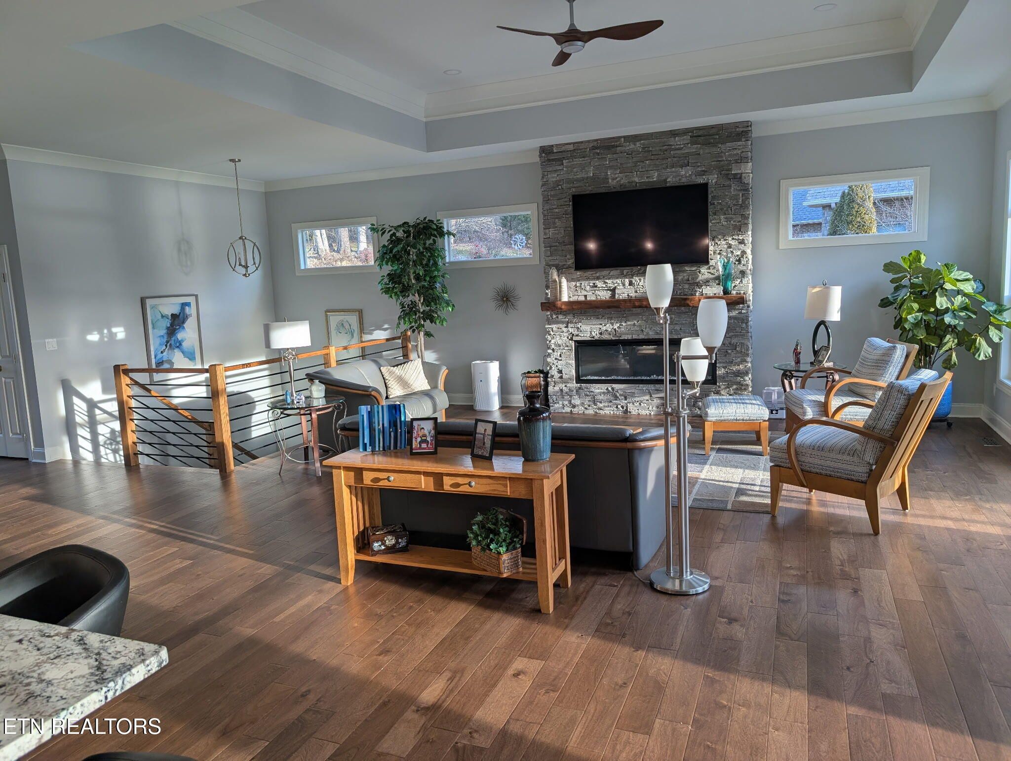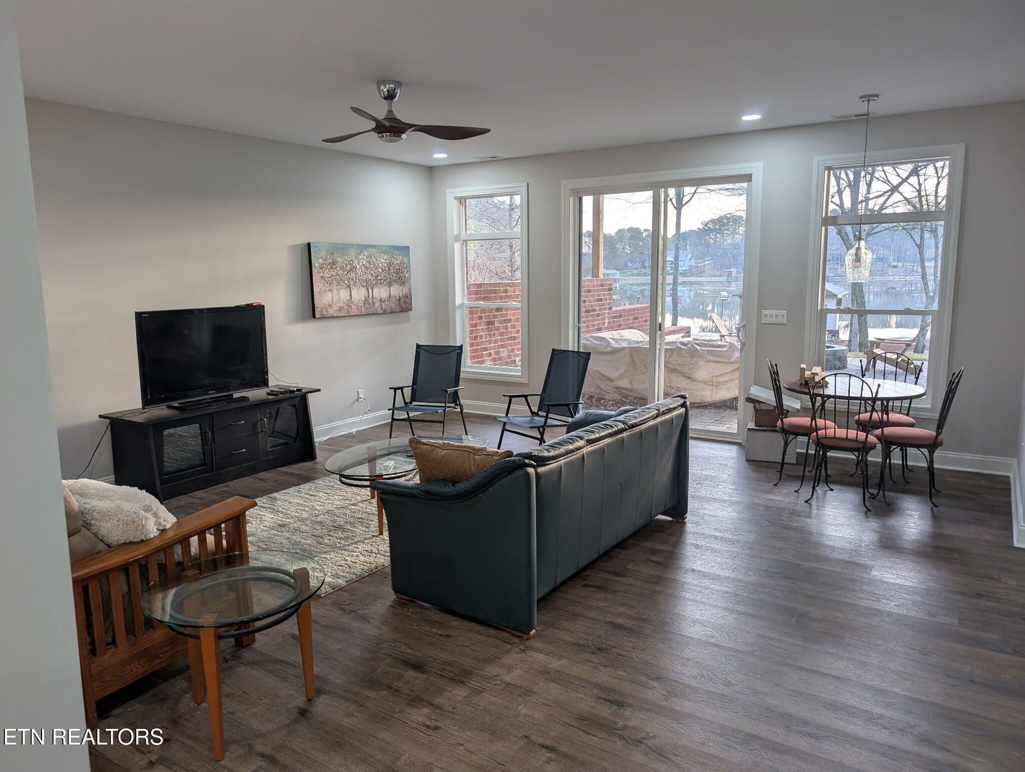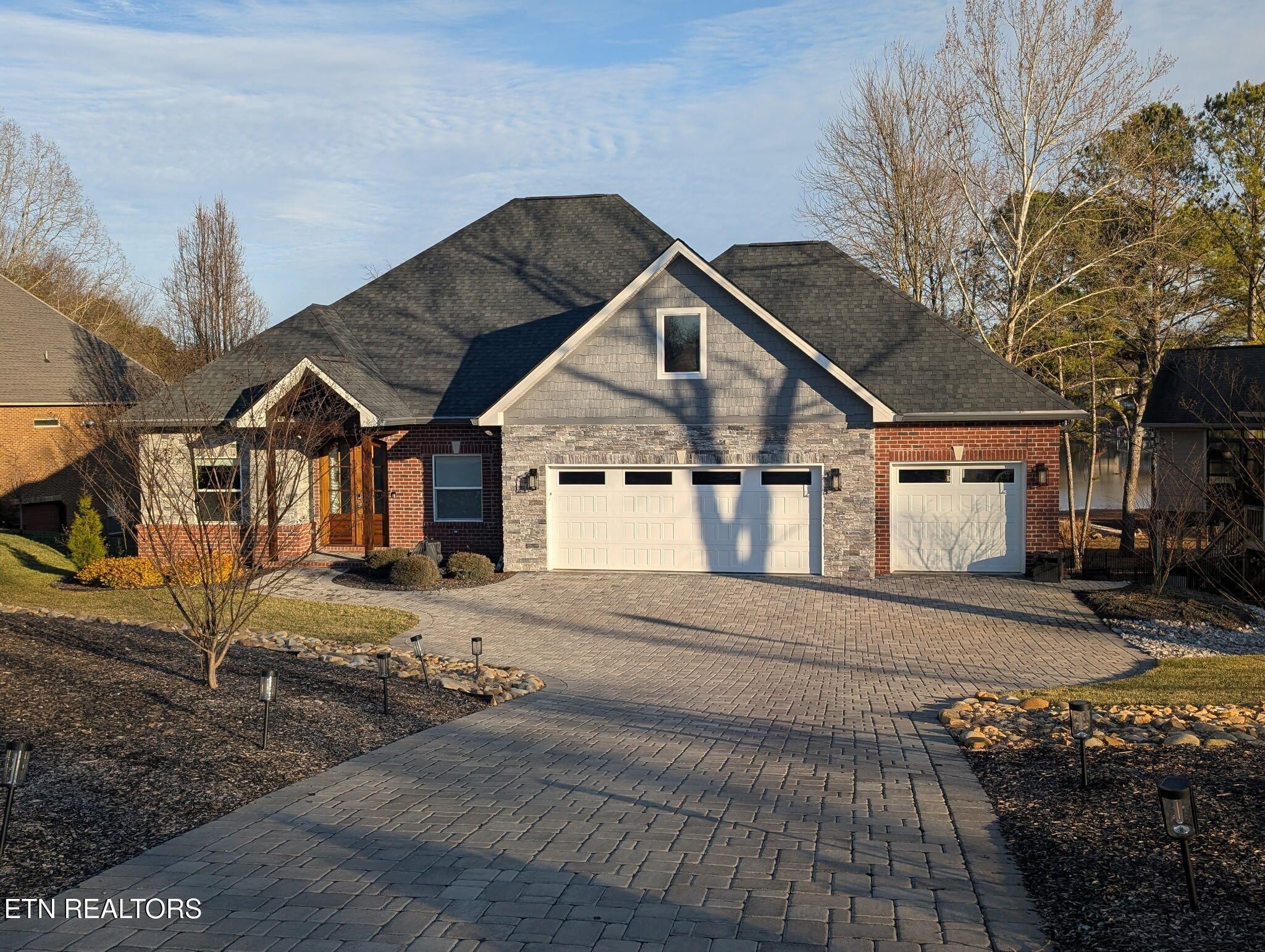 Custom-built lakefront home completed in 2023, ideally located in the prestigious Mialaquo Shores neighborhood of Tellico Village. Offering over 4,400 square feet of thoughtfully designed living space, this home showcases an open main-level floor plan with 10-foot ceilings and dramatic 12-foot tray ceilings in both the living room and primary suite. The main level features two bedrooms, two full baths, a dedicated office/den, and expansive kitchen, dining, and living areas perfect for everyday living and entertaining. The primary suite is a true retreat with breathtaking lake views, a spa-inspired bath, and a generous walk-in closet. Transom windows throughout the home flood the space with natural light. The lower level boasts 9-foot ceilings and includes two additional bedrooms, a full bath, a large family room, a convenient half kitchen, a wine room or flexible bonus space, and a finished workshop with garage door access ideal for hobbies or additional storage. Outdoor living is exceptional, featuring an expansive deck, a 1,000-square-foot paver patio with fire pit, and a covered dock equipped with power lifts for both a boat and jet ski. The durable brick, stone, and composite exterior is enhanced by Zip System sheathing, dual HVAC units, lake-fed irrigation, and economical utilities. A three-car garage and paver driveway complete this remarkable lakefront offering. Showings to start on Feb. 3rd.