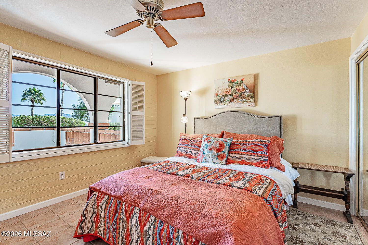 Perfectly located, east facing patio for your enjoyment of those morning sunrises and mountain views! Plus you are just steps down to the pool below. This lovely home has many upgrades, from tile floors throughout to the kitchen highlights which include: accent Mexican tile backsplash, drawer-style dishwasher, pantry cabinet with the laundry room just out the back door. A pocket door was added from the second bedroom to the Jack and JIll bath which offers a walkin shower and more beautiful Mexican tile counter and backsplash. Double pane windows were added for extra energy efficiency, new HVAC and the roof was redone in 2022. This beauty is furnished and ready for you to move in!