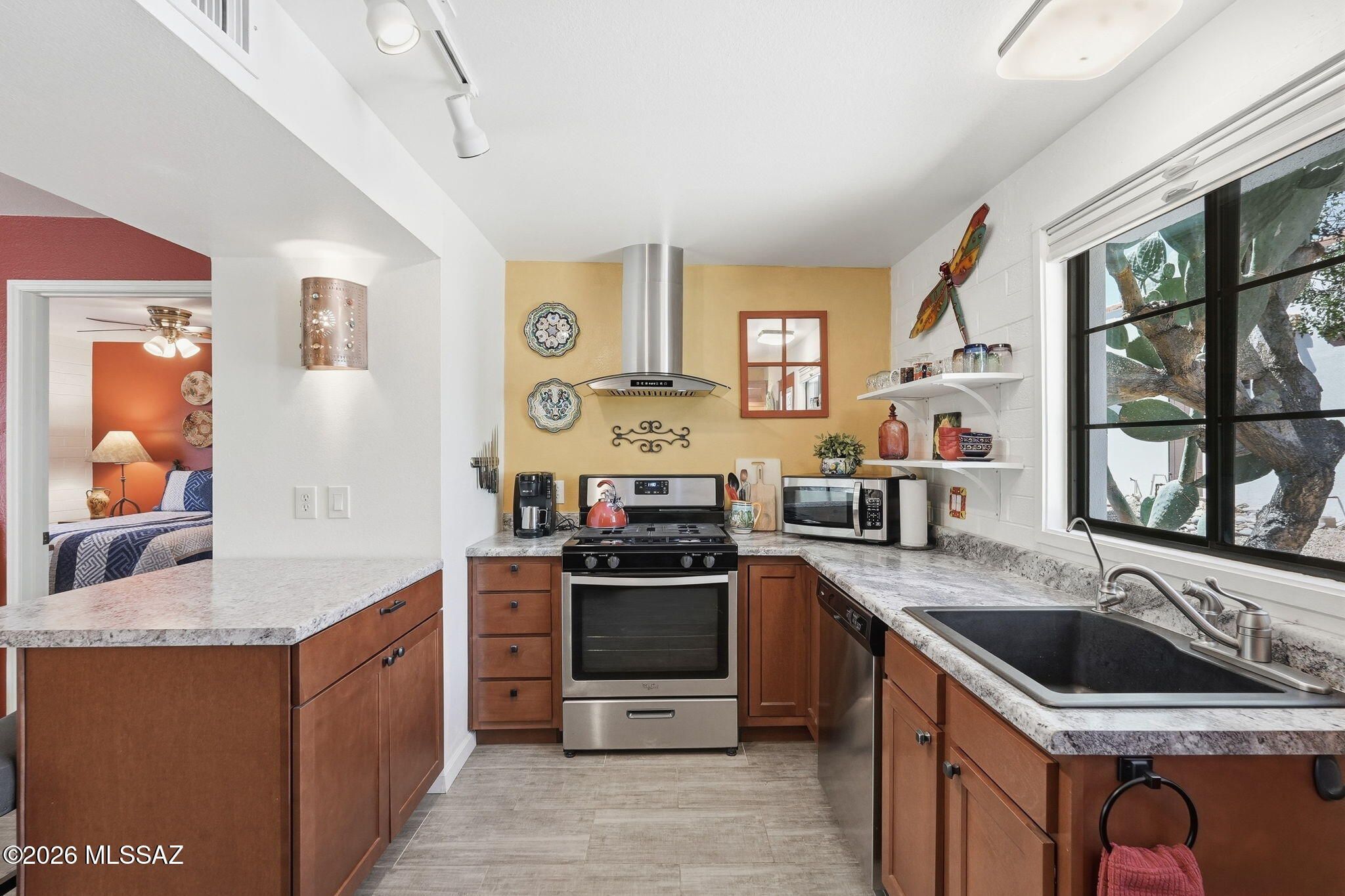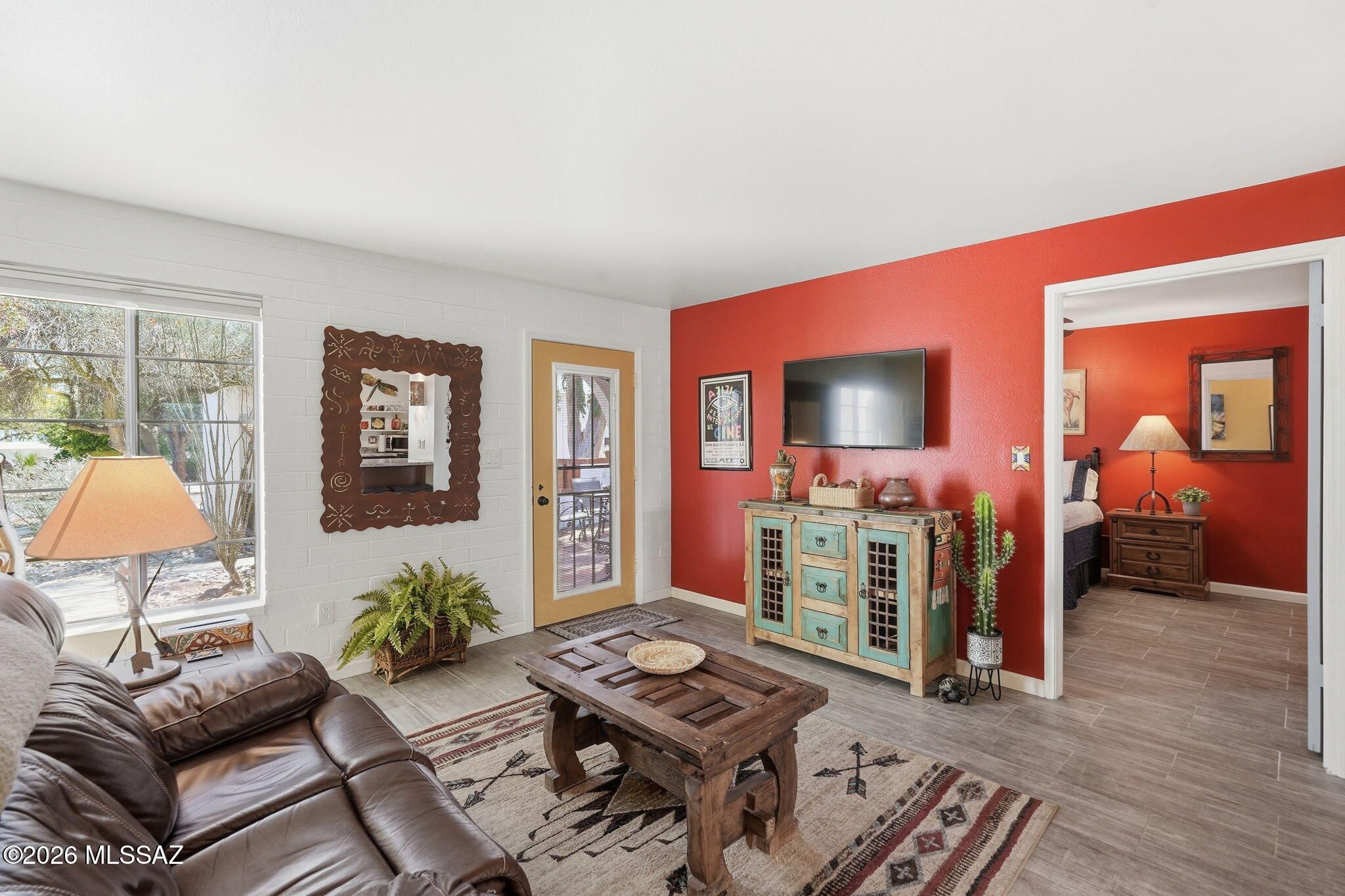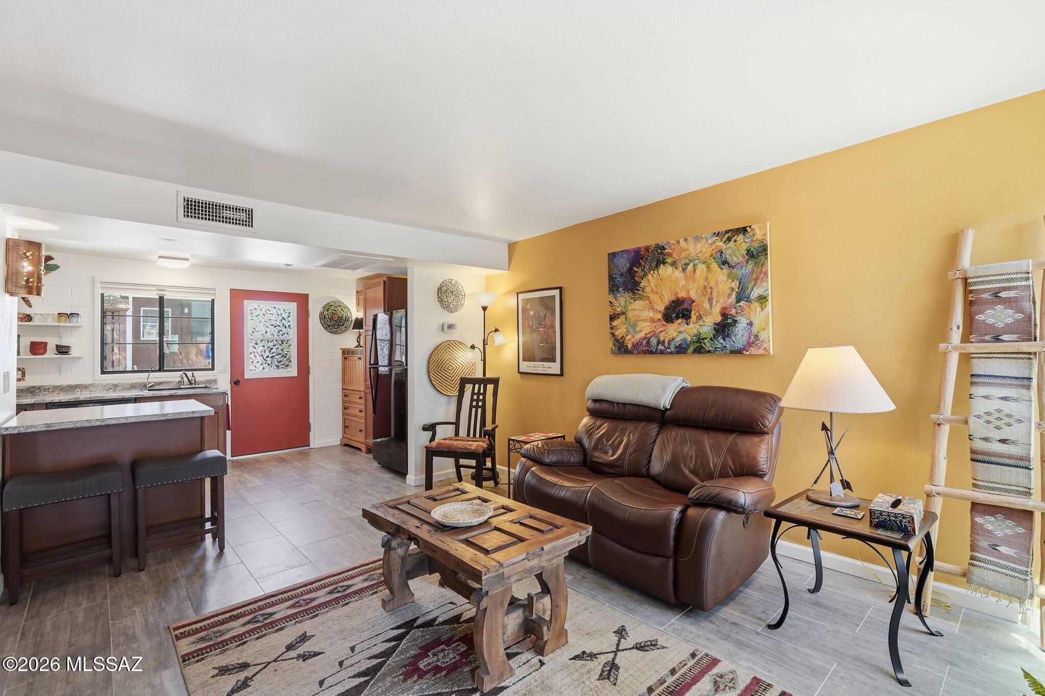 Charming, meticulously maintained 1BR villa in Villas West with a glass entry door and beautiful wood-look ceramic tile throughout. Sold fully furnished in a warm Southwestern style. The remodeled kitchen features newer cabinets, a breakfast bar, reverse osmosis system, stainless steel Whirlpool appliances, gas range, and ample counter space. Dual-pane windows with top-down/bottom-up blinds add comfort and efficiency. Relax on the private patio overlooking a green park with mature trees, just steps to the pool and laundry. HOA covers roof, HVAC, water heater, trash, pest control, exterior maintenance, and more. Ideal winter retreat or easy year-round living! This is one you will want to see!