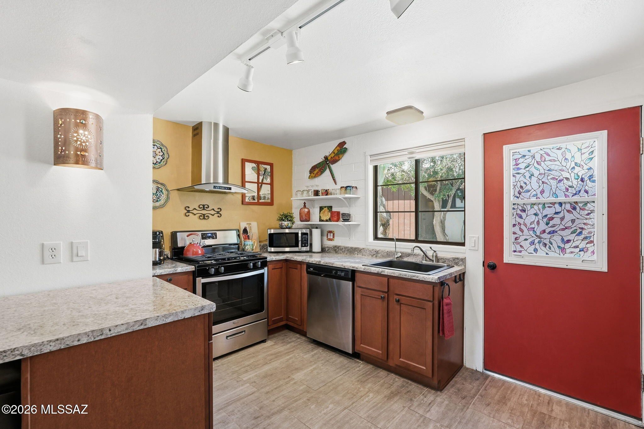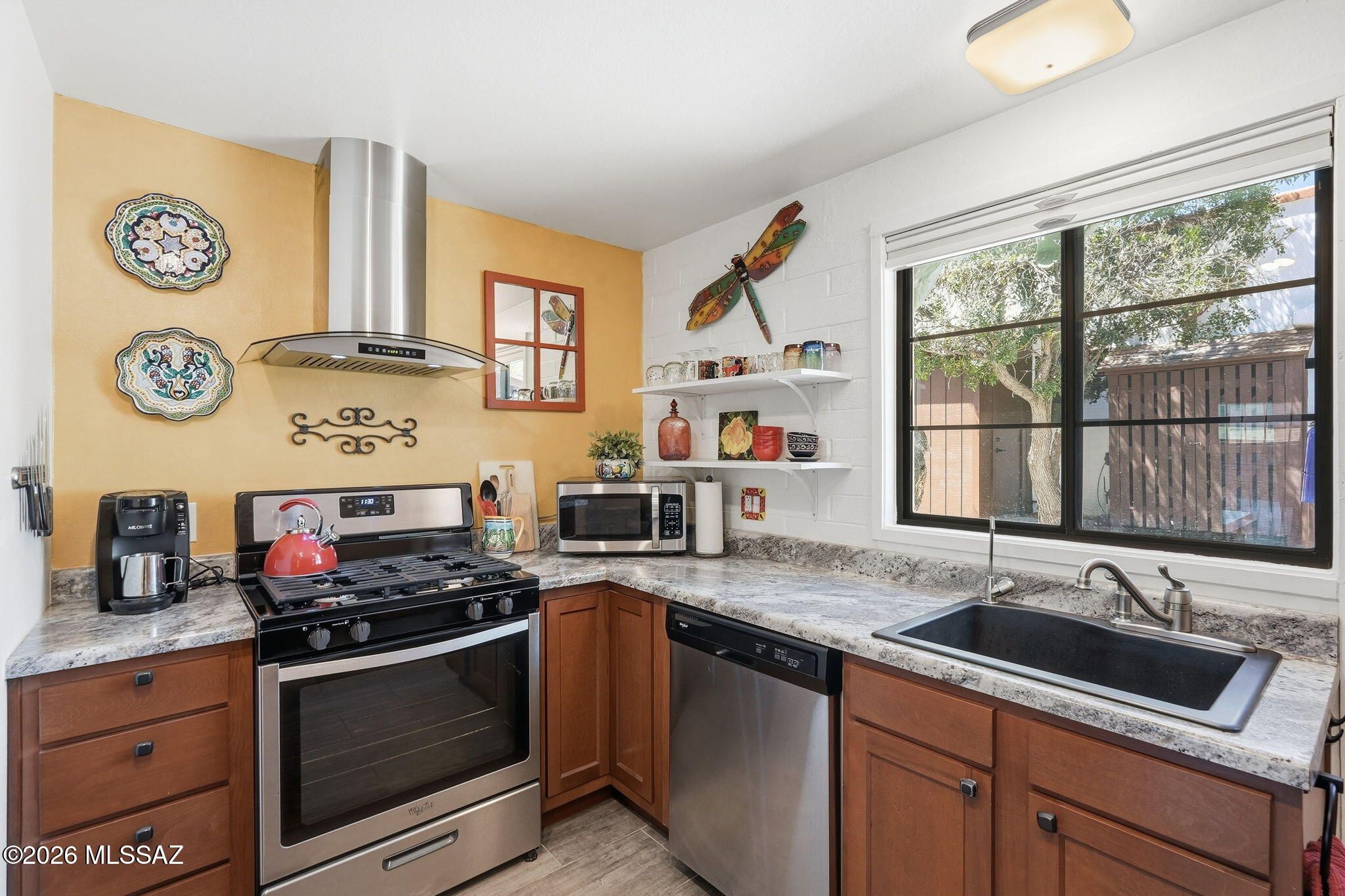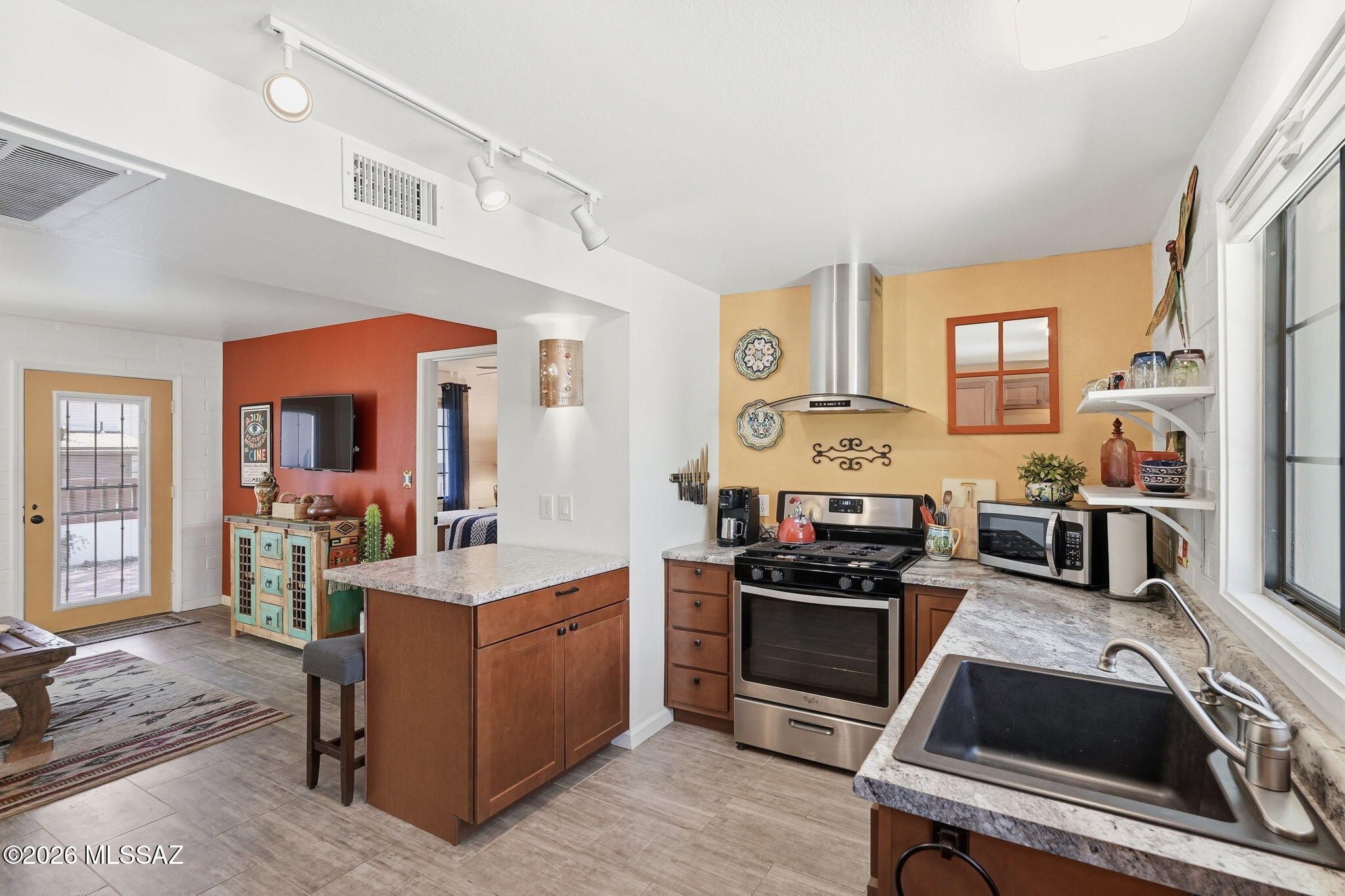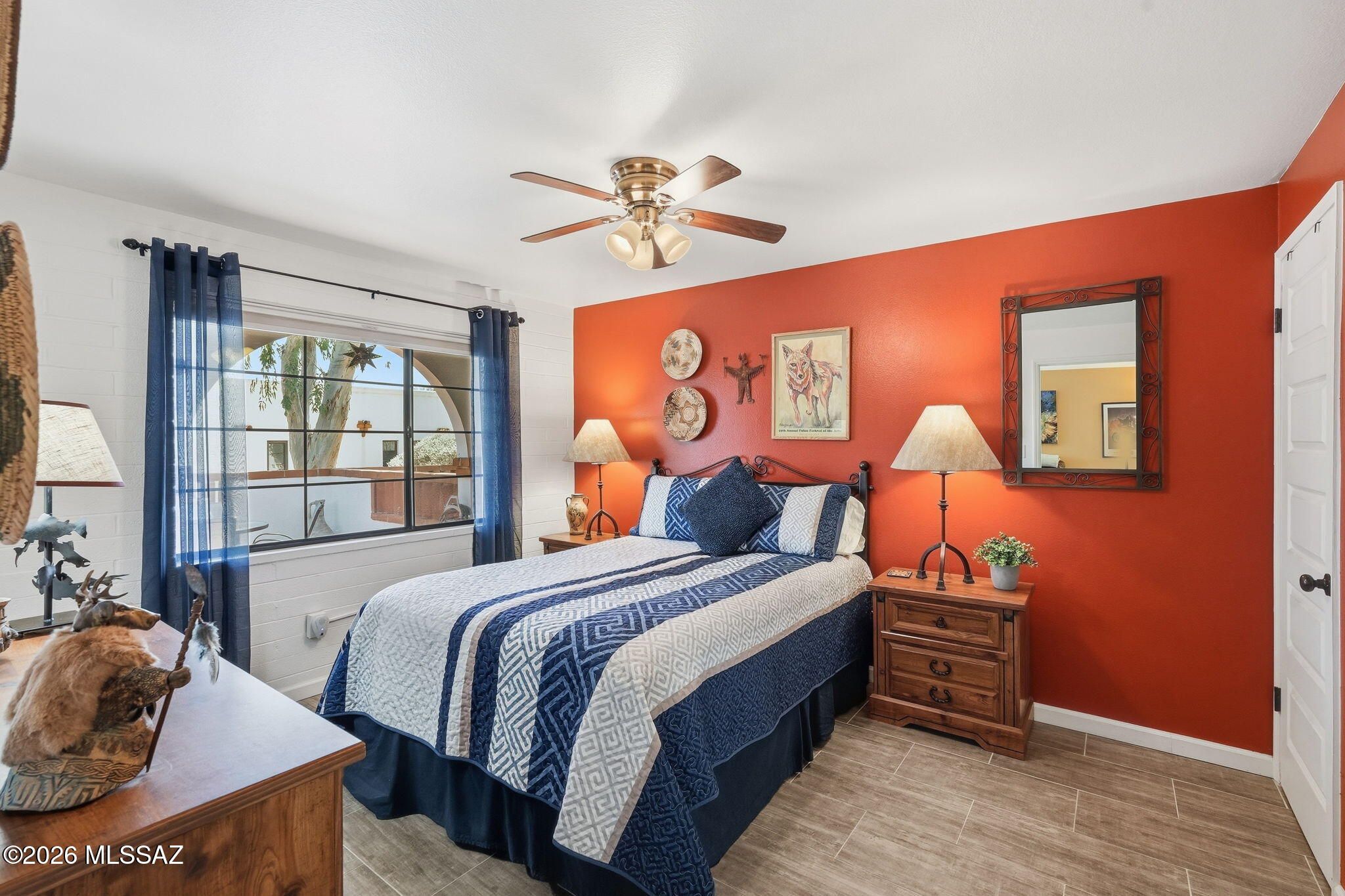 Charming, meticulously maintained 1BR villa in Villas West with a glass entry door and beautiful wood-look ceramic tile throughout. Sold fully furnished in a warm Southwestern style. The remodeled kitchen features newer cabinets, a breakfast bar, reverse osmosis system, stainless steel Whirlpool appliances, gas range, and ample counter space. Dual-pane windows with top-down/bottom-up blinds add comfort and efficiency. Relax on the private patio overlooking a green park with mature trees, just steps to the pool and laundry. HOA covers roof, HVAC, water heater, trash, pest control, exterior maintenance, and more. Ideal winter retreat or easy year-round living! This is one you will want to see!