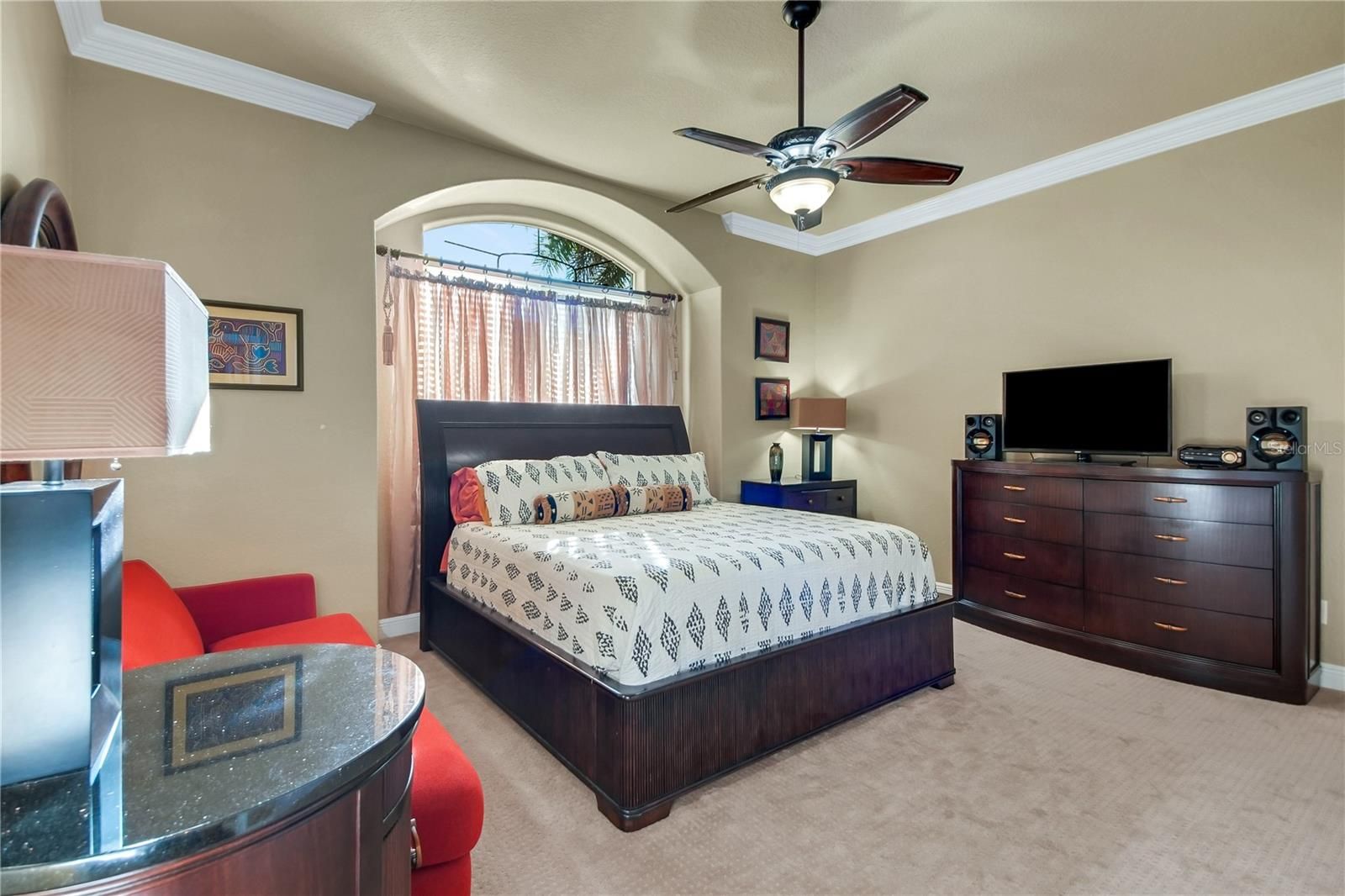 - Built-in Features, Ceiling Fan(s), Crown Molding, Eat-in Kitchen, High Ceilings, Living/Dining Room, Open Floorplan, Solid-Wood Cabinets, Split Bedrooms, Stone Counters, Tray Ceiling(s), Walk-In Closet(s)
