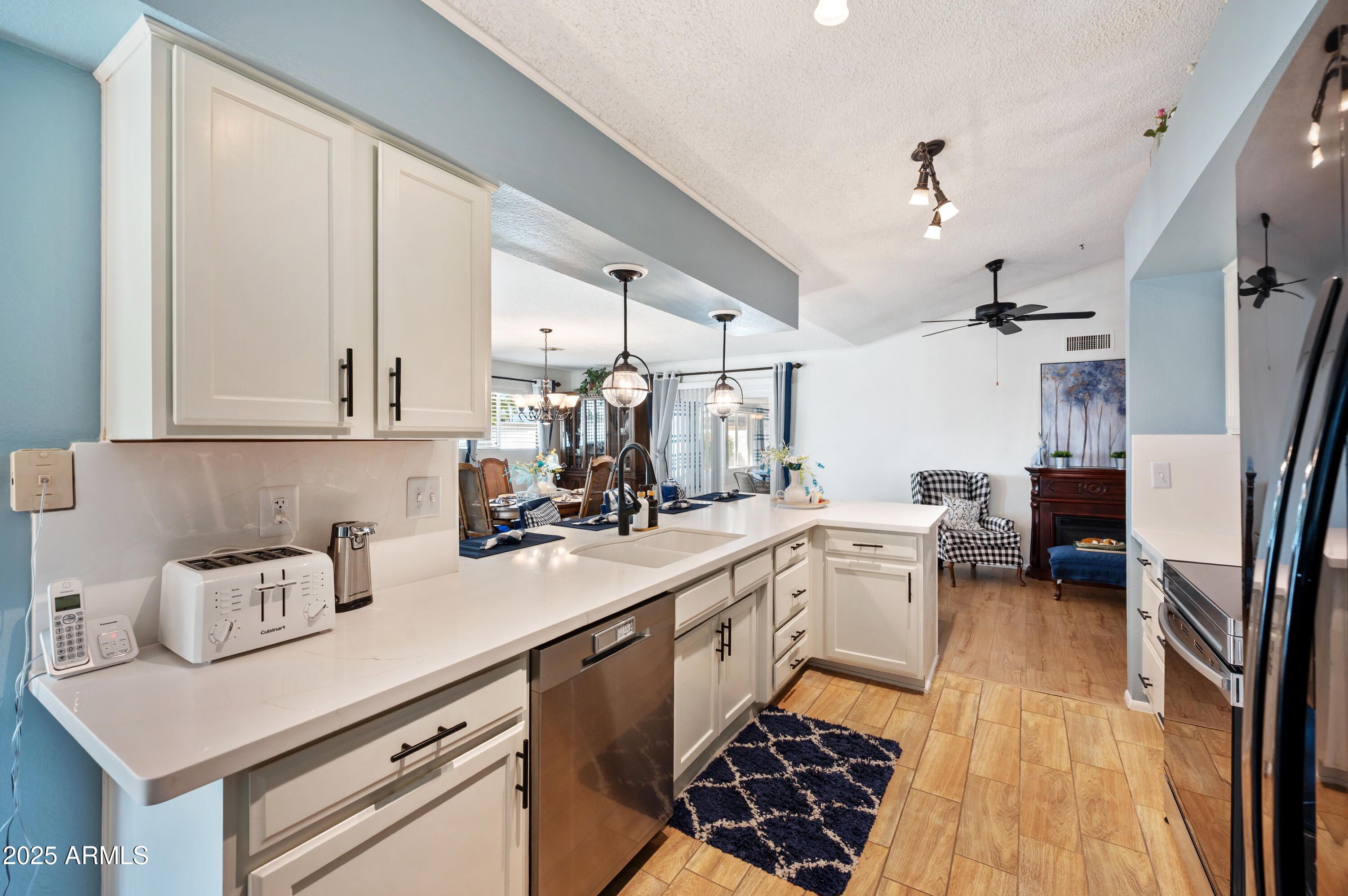 Beautifully updated Bridgeford model in Sun City West! Step inside this bright and inviting home featuring a vaulted ceiling in the spacious Arizona room—perfect for relaxing or entertaining. The meticulously upgraded kitchen showcases sleek quartz countertops, freshly painted cabinets (2023), and plenty of storage for all your culinary needs. Enjoy peace of mind with new windows throughout, an updated HVAC system, new paint inside and outside, and stylish new flooring. Also, the refrigerator, washer and dryer are included. The large backyard offers endless possibilities, while the Arizona room provides year-round comfort. Sun City West is known for—golf, fitness, clubs, and a vibrant social scene. This home truly blends modern comfort with the best of active adult living