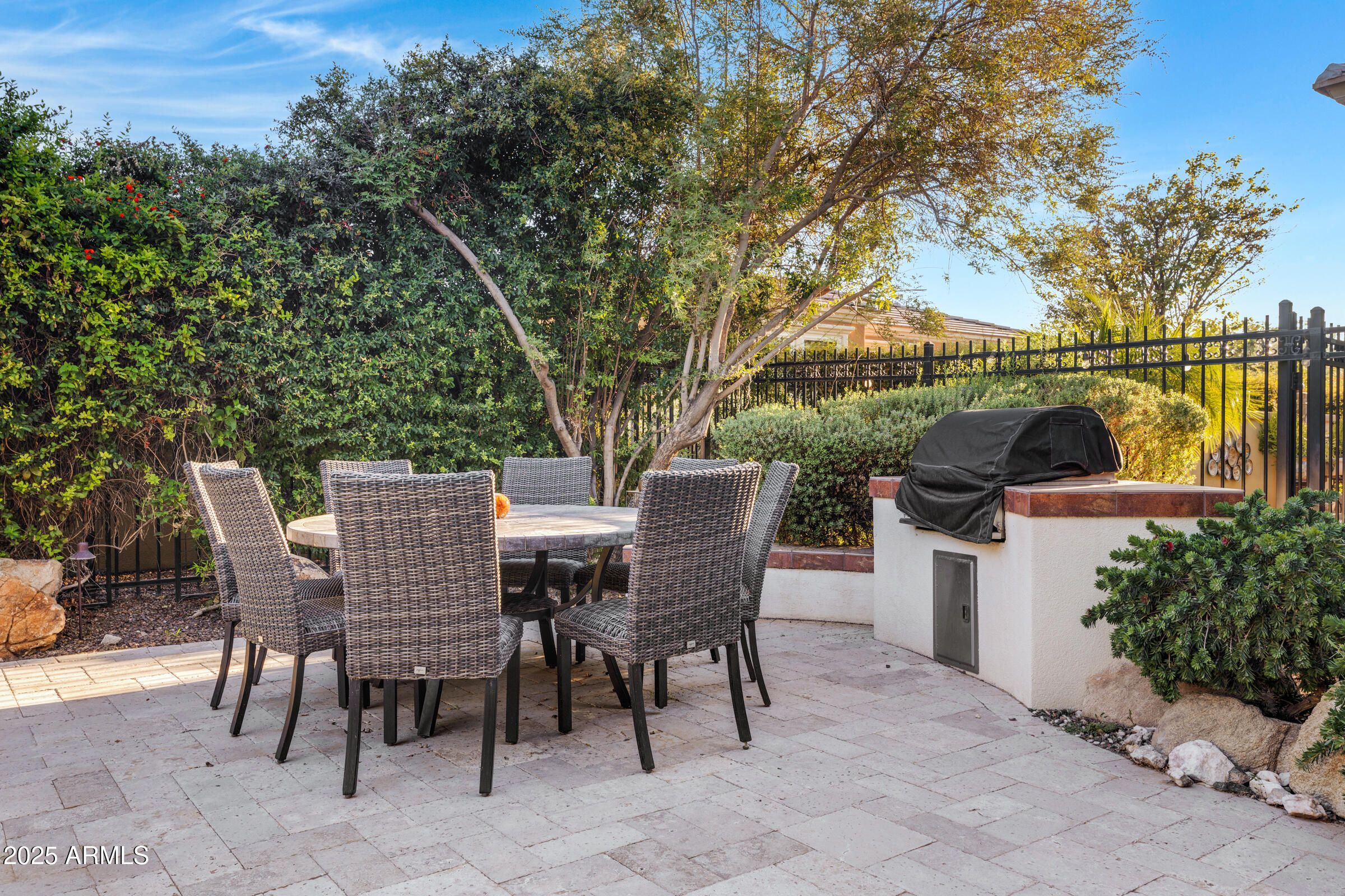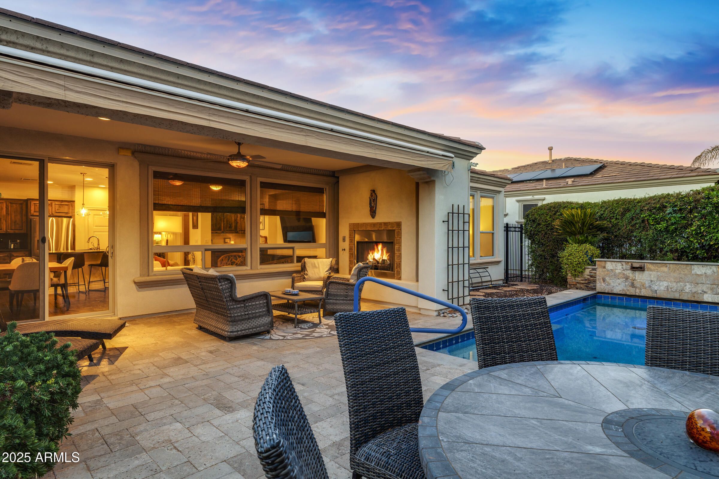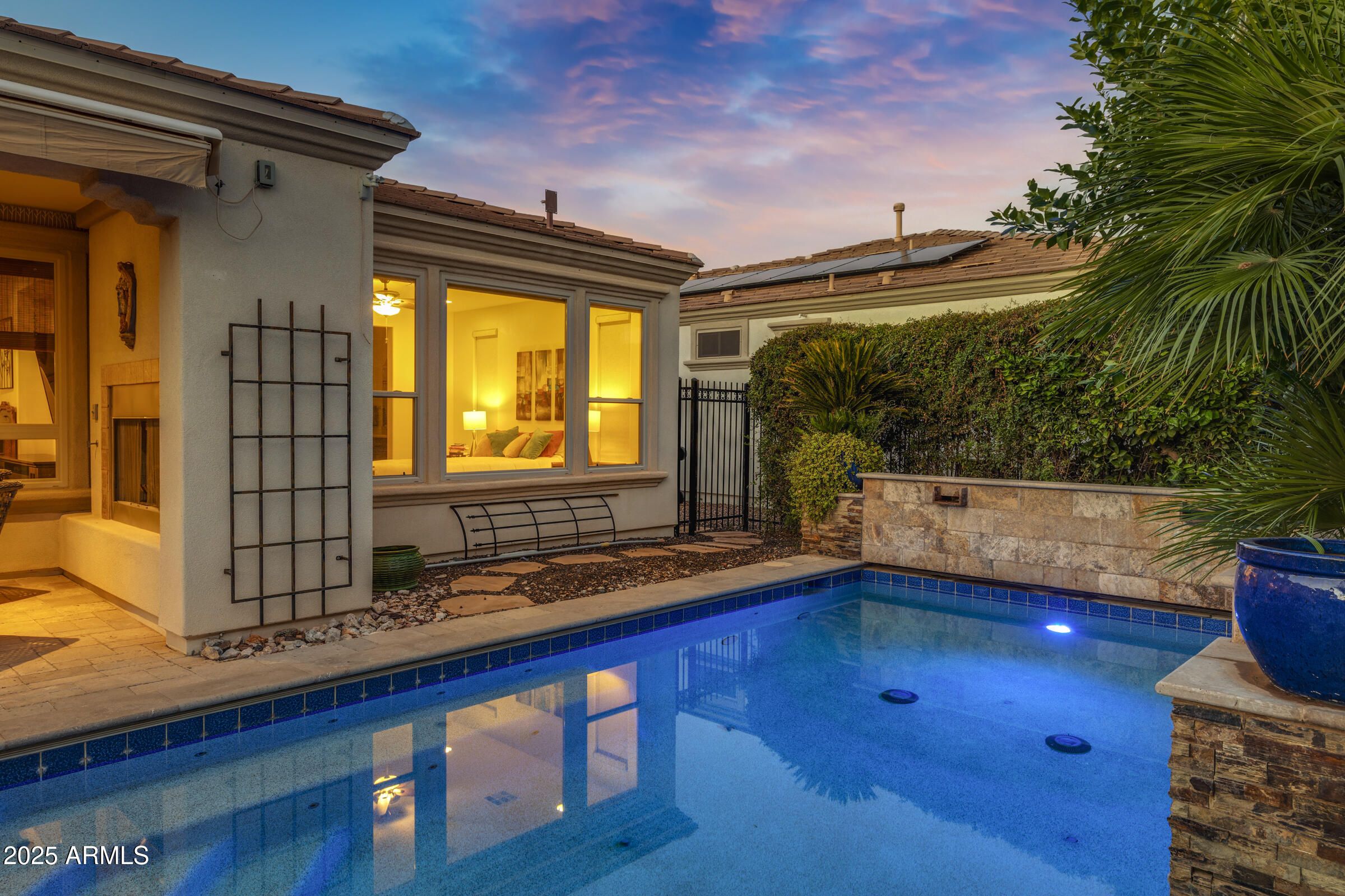 Experience luxury resort-style living in this immaculate St.Tropez 2BR/2BA home featuring owned solar panels for exceptionally low utility bills! The private, professionally landscaped Italian-inspired backyard is an entertainer's paradise with a stunning pool featuring waterfall ,bench seating w/spa jets, elegant travertine decking, built-in BBQ station, and cozy gas fireplace. Inside, discover exceptional upgrades throughout: rich hardwood floors, premium granite countertops, stainless steel appliances, beautiful upgraded alder cabinetry, and spa-like bathrooms with custom tile work. Located in Arizona's premier Encanterra Country Club offering championship golf, pools, restaurants, art classes, pickleball courts, and vibrant social activities for the ultimate active lifestyle.