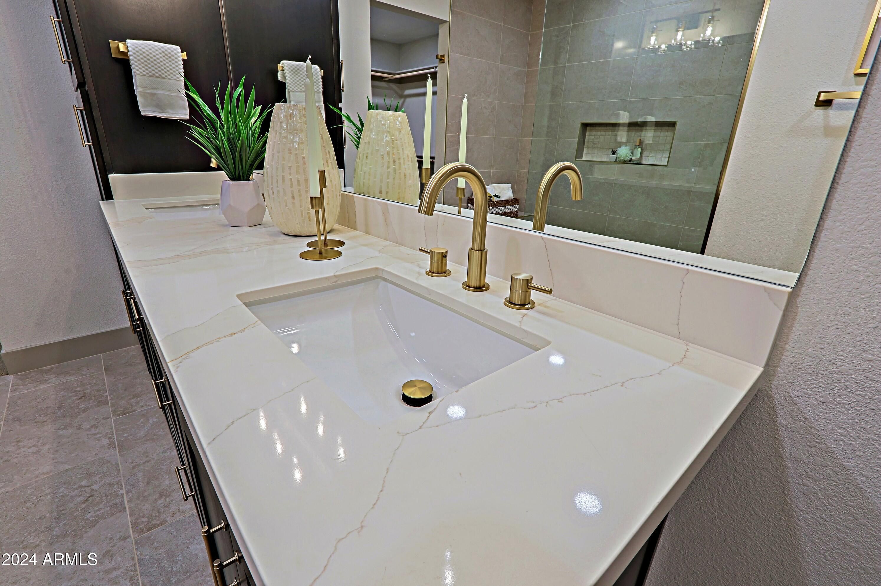 Enjoy retirement in its best! Desirable golf community Sun City West. Completely renovated and ready to move-in. Open floor plan with formal dining room, spacious kitchen with kitchen island and breakfast bar open to great room. Highly upgraded with tile flooring t/o, custom Shaker cabinets, Quartz countertops, stainless steel appliances including fridge and wine fridge, kitchen tile back splash, kitchen island, pendent lights, fireplace in great room. New light and plumbing fixtures, new interior and exterior paint, garage epoxy flooring. Two suites with private baths, plus den/office, and powder room. Master suites offers double sinks and walk-in closet, private toilet room. New roof, new WH, dual pane windows. Private backyard with mature vegetation, S/N exposure. Home warranty