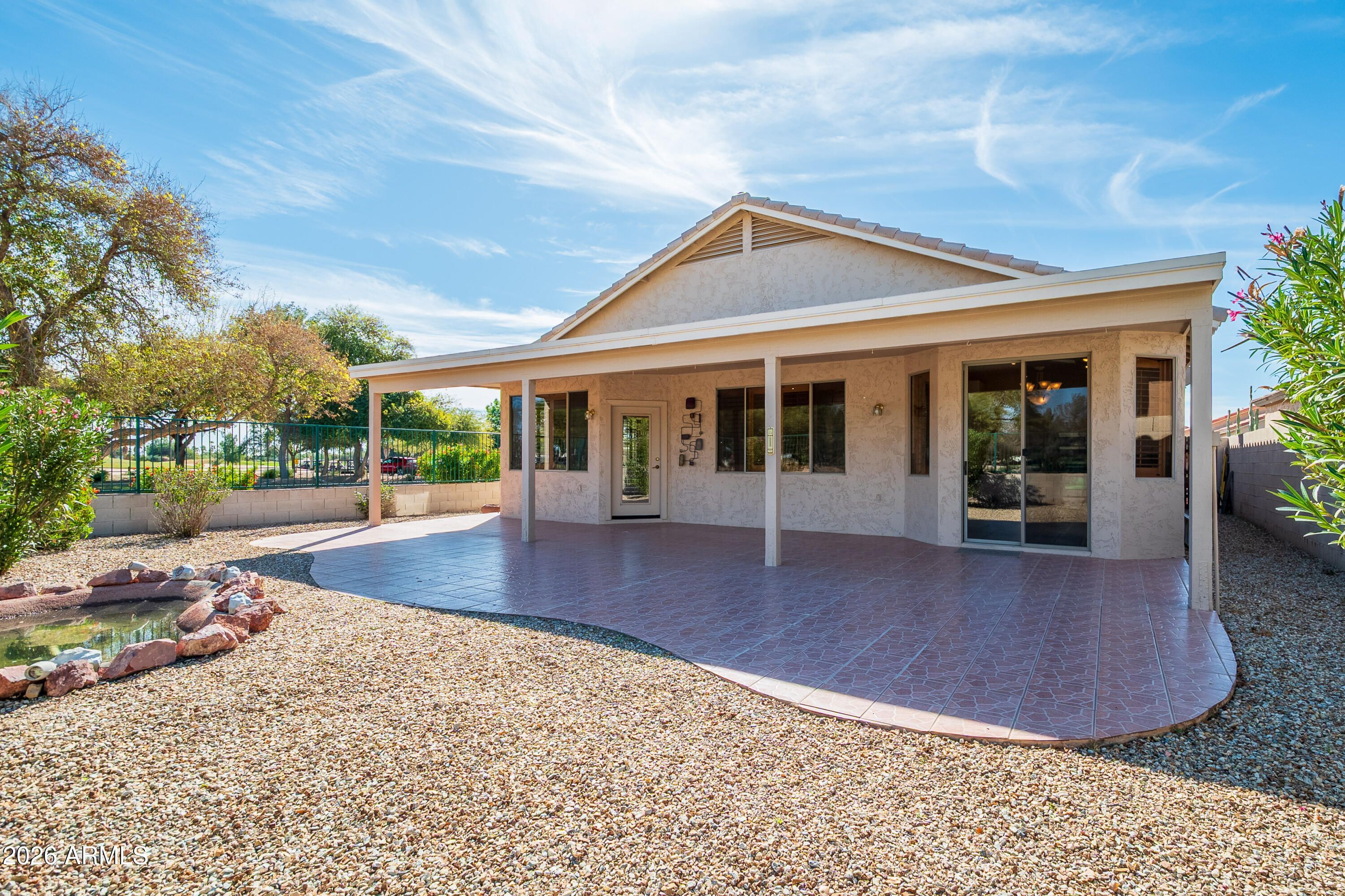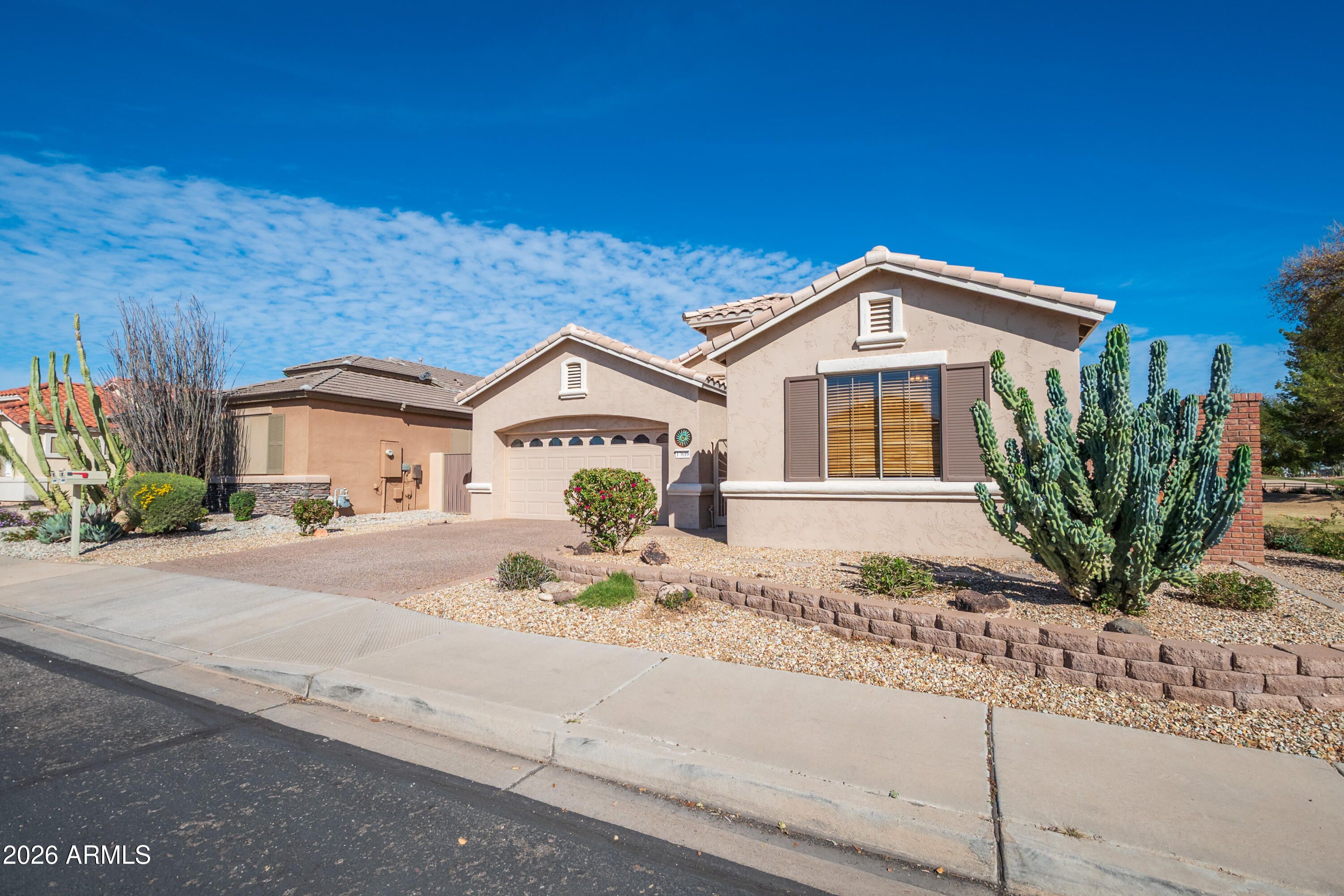 Amazing View! This charming 1,555 sq ft Saguaro model sits on a desirable north/south-facing greenbelt lot with beautiful golf course views. The open great room floor plan features two private split bedrooms and a versatile double-door den, perfect as an office or guest space. The island kitchen offers light wood cabinetry, stainless steel appliances, pantry, and breakfast bar. The spacious primary suite includes patio access, dual sinks, step-in shower, and walk-in closet. Relax or entertain under the extended covered patio while enjoying peaceful greenbelt views and the soothing sound of the waterfall. Upgraded HVAC system in 2017 adds comfort and efficiency. Don't let this one get away!