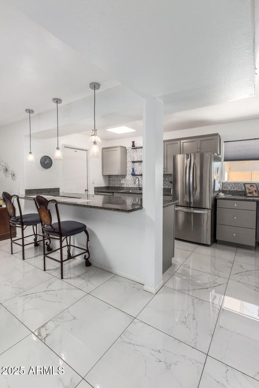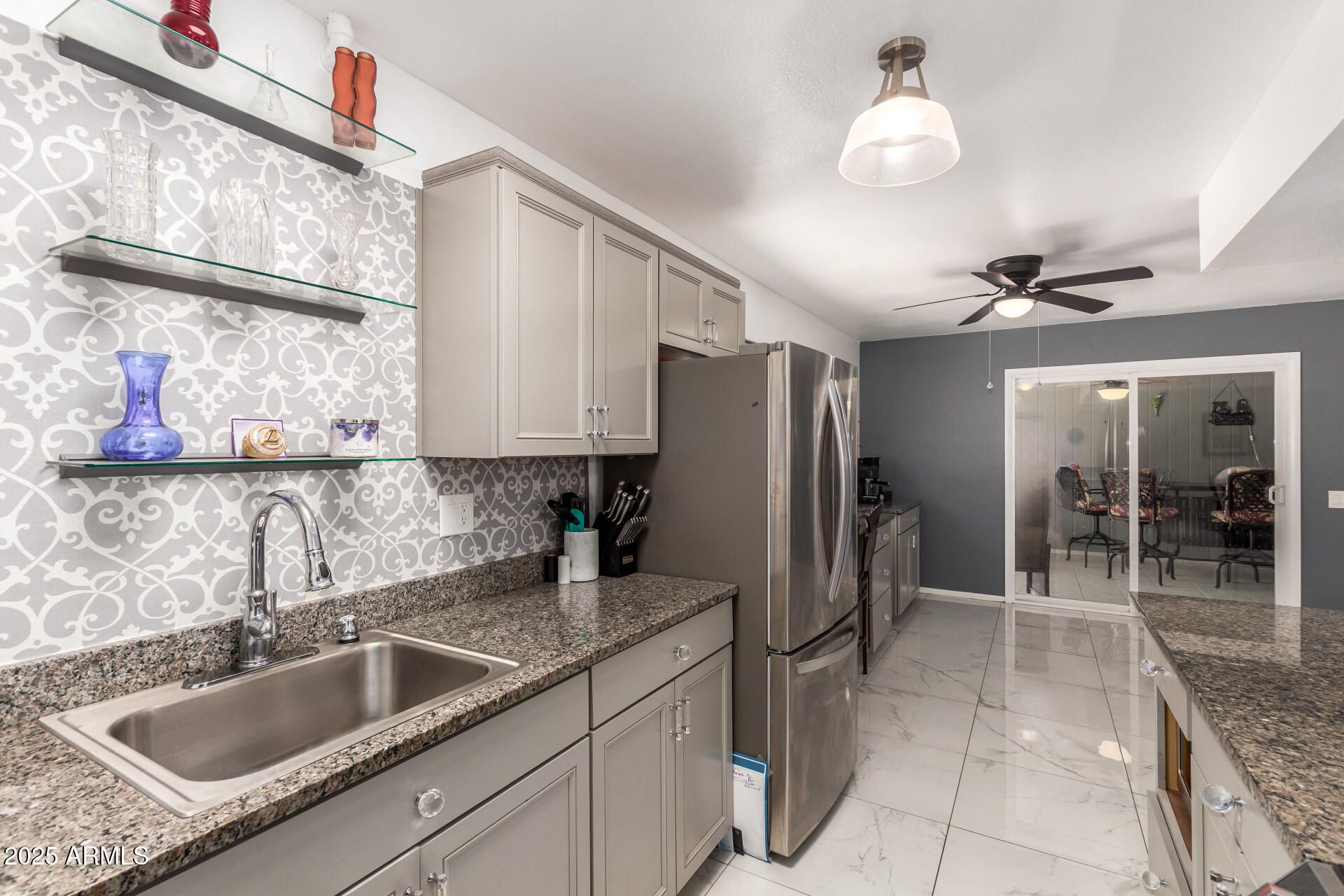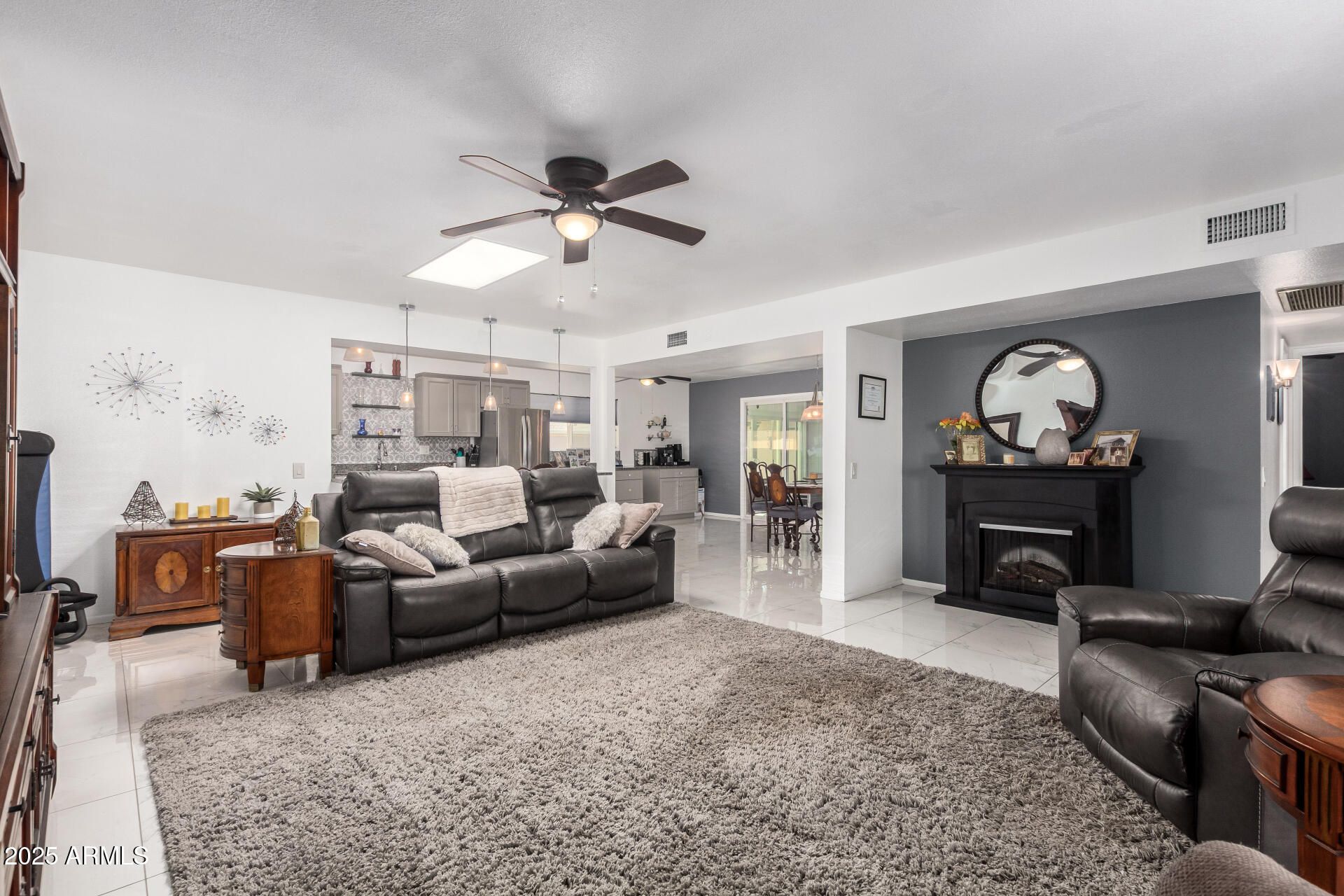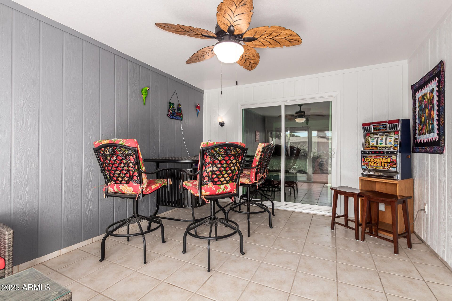 Gorgeous Fully Remodeled Sun City Phase 3 Condo! Welcome to this stunning 2-bedroom, 2-bathroom home — beautifully remodeled and being sold fully furnished. Just bring your personal items and start enjoying the good life! Step inside to find elegant 24x24 tile flooring throughout, a modern kitchen featuring new cabinetry, stainless steel appliances, granite countertops, and a spacious island with pendant lighting — perfect for entertaining.Both bathrooms have been tastefully updated with new vanities, lighting, and mirrors. Major updates include: A/C (2020), Washer & Dryer (2022), and a complete remodel in 2021. Enjoy the expansive Arizona room that opens to a large, private back patio — ideal for relaxing or hosting guests.Both bedrooms feature walk-in closets, and you'll appreciat the new lighting, fans, door hardware, and fixtures throughout. The 1.5-car garage offers room for both your vehicle and golf cart.