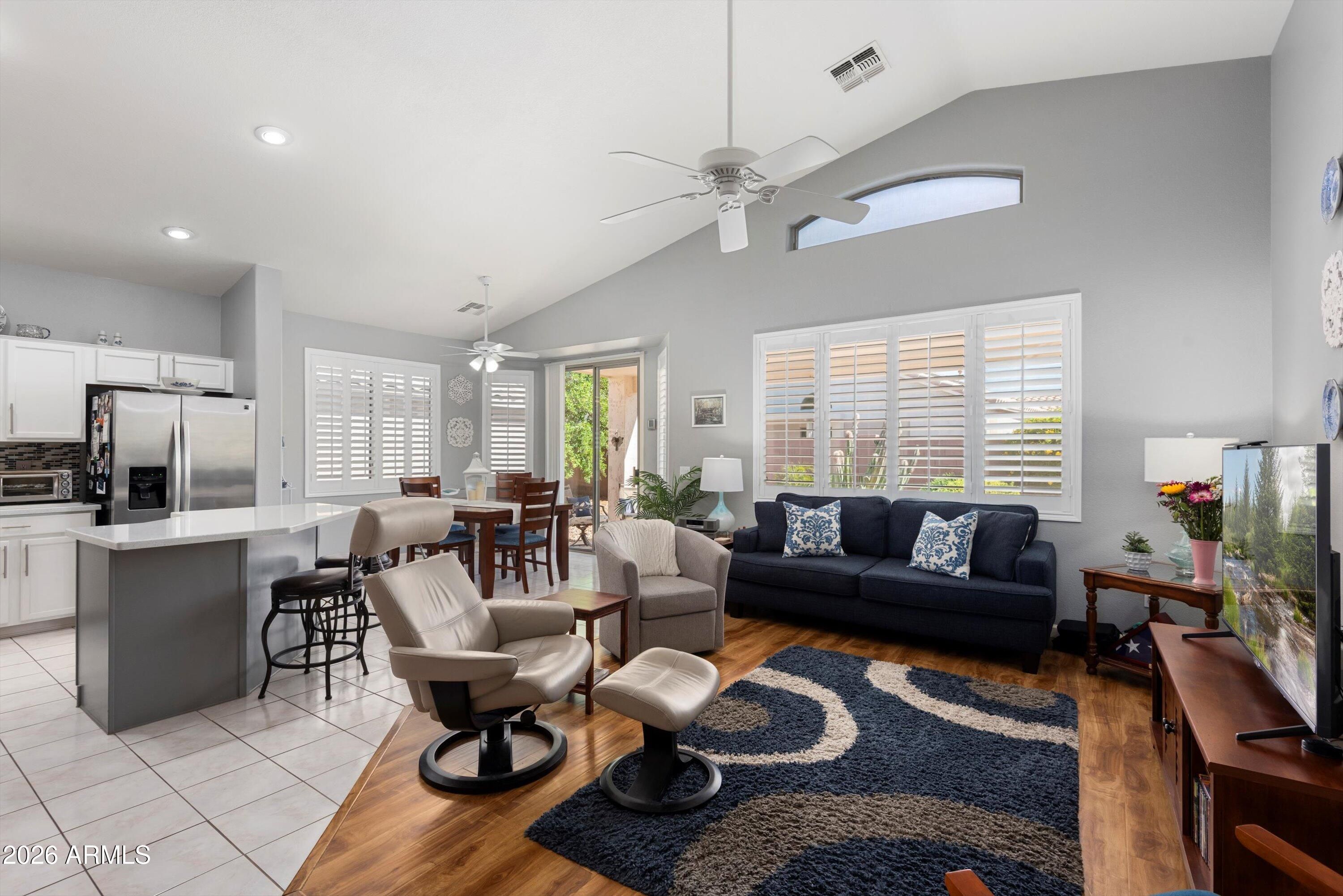 Pride of ownership shows in this professionally updated home! Lovingly maintained by original owner, the home offers a soothing color palate thruout. Enter to an open greatrm combo living, dining & kitchen. Beautiful kitchen features Corian type quartz look counters, white cabinets, updated faucet, tile backsplash, SS appls. Primary bedrm provides a private oasis, w/split Guest bedrm at front. Work from home? Den or office provides a sep workspace or extra guest rm w/double door entry! Features inc plantation shutters in living & dining rms, neutral tile or rich wood-look laminate thruout-no carpet! Backyard offers covered patio paver area for outdoor dining, mature plants & trees. AZT is a 55+ guard-gated resort with the active adult amenities you desire, but with a small town feel!