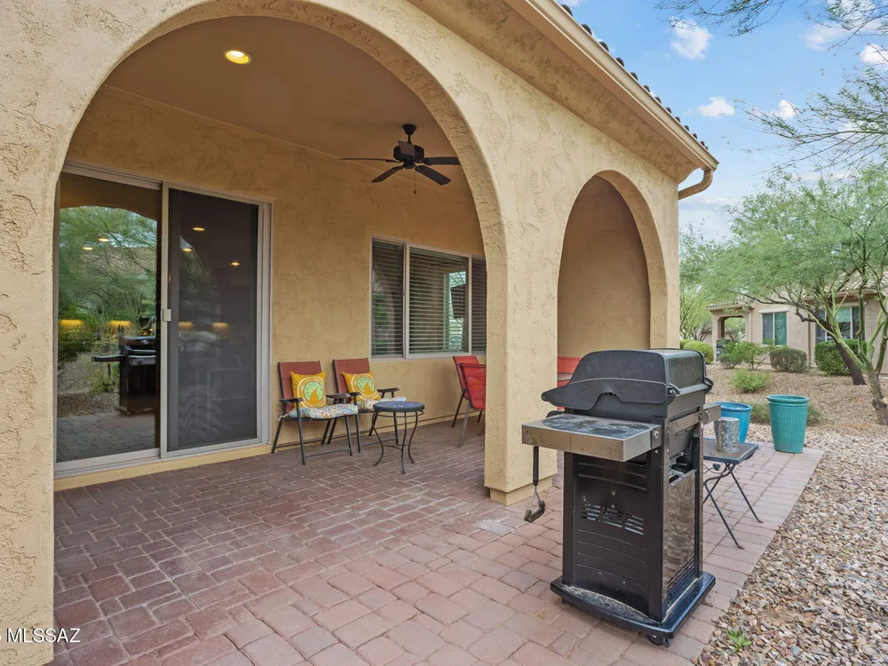 End-unit Villa with extra space on the side and the back. Ceramic tile throughout, no carpet. The kitchen offers granite counters, pull-out shelves, and SS appliances including a Bosch dishwasher and double-oven range. Refrigerator, washer, and dryer included! Closet organizers in master closet. The garage has an epoxy floor, Closet Trends cabinets, soft water system, plus a recirculated on the water heater for instant hot water. Exterior maintained by HOA. Check out the new Caynon Club clubhouse with indoor pool.