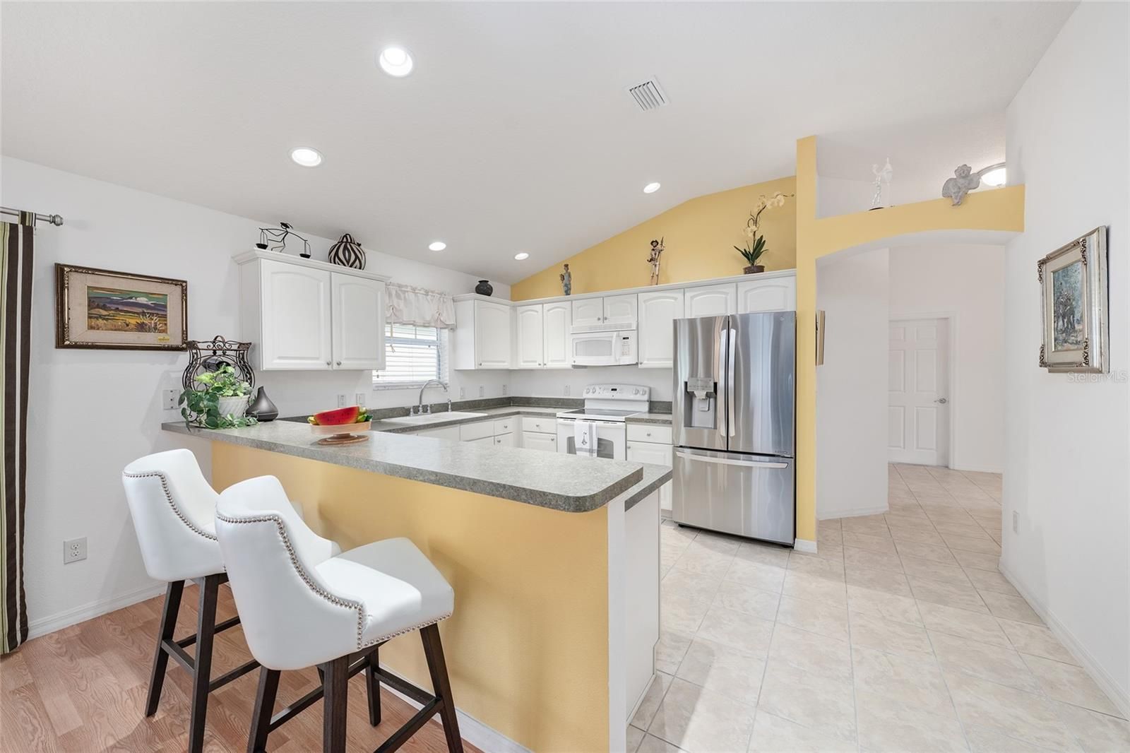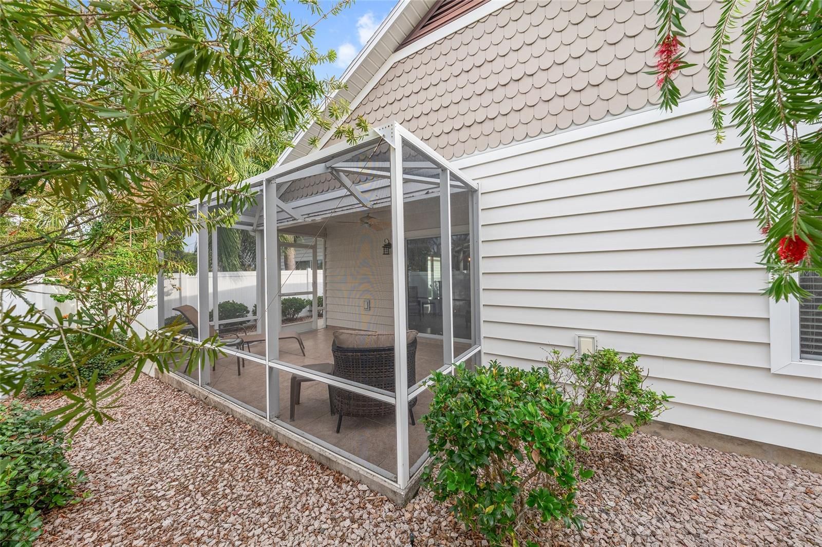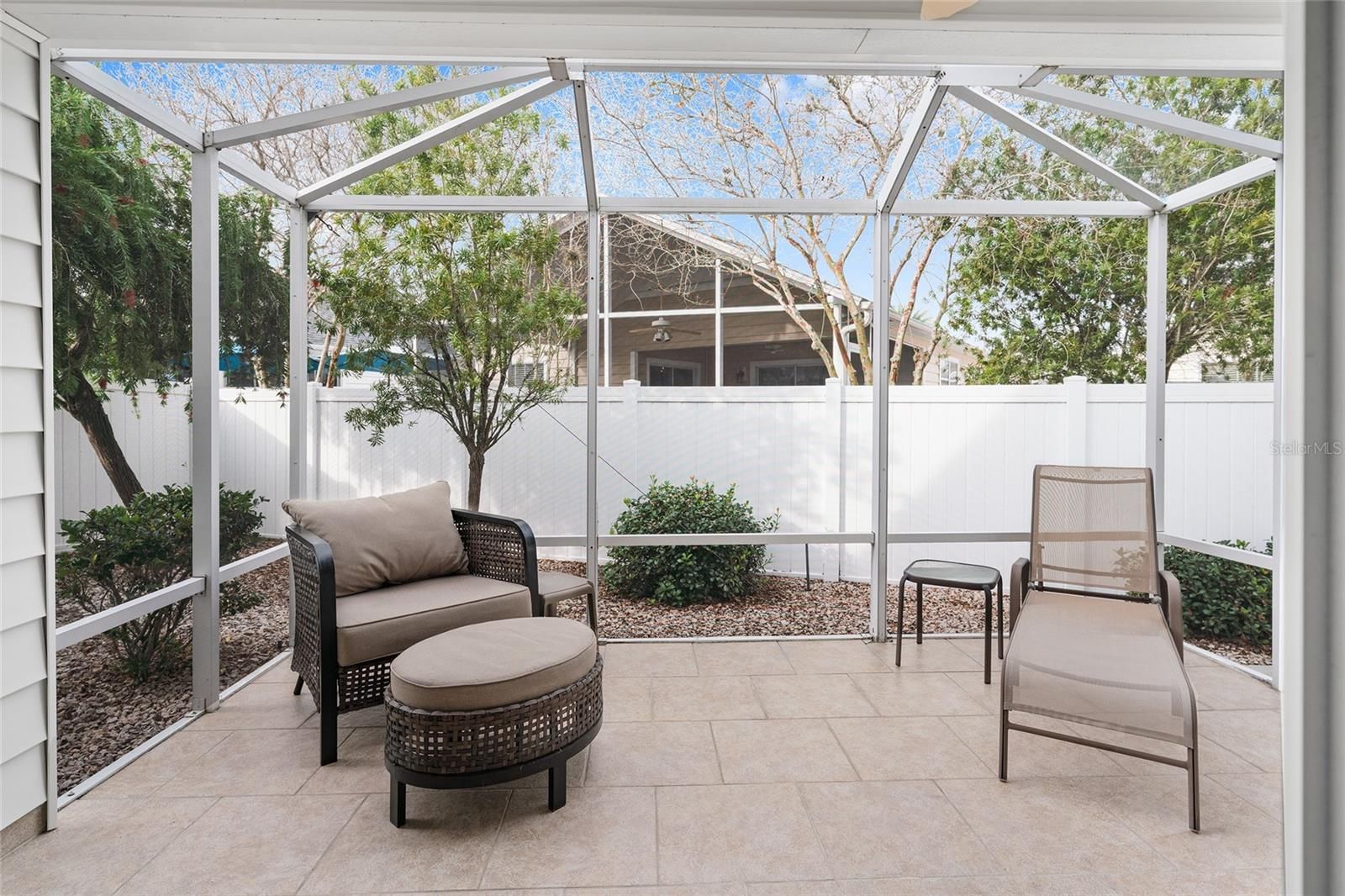 Experience refined Florida living in this TURNKEY, FURNISHED, immaculately maintained courtyard villa nestled in the highly sought-after VILLAGE OF PENNECAMP. This prime location is situated between SUMTER LANDING and BROWNWOOD PADDOCK SQUARE- a golf cart ride away from shopping, dining, and entertainment. Designed for both comfort and style, this OPEN-CONCEPT floor plan seamlessly connects the living room and dining area to the SPACIOUS KITCHEN which features abundant WHITE CABINETRY with PULLOUTS and a convenient BREAKFAST BAR – ideal for everyday living and entertaining. This 3-bedroom, 2-bath residence features soaring VOLUME CEILINGS and a BRIGHT, OPEN LAYOUT with NO CARPETING throughout. Laminate flooring and ceramic tile add a modern, cohesive feel. Recent upgrades—including a 2023 ROOF, HOT WATER HEATER 2026, and 2019 HVAC—provide lasting peace of mind. Step outside to your FULLY FENCED, PRIVATE PATIO WITH BIRDCAGE—an inviting retreat ideal for morning coffee, evening relaxation, or hosting guests. This home is less than a 10 minute GOLF CART RIDE to 9 EXECUTIVE GOLF COURSES AND 2 CHAMPIONSHIP GOLF COURSES. With resort-style pools, recreation centers, tennis, pickleball, country clubs, dining, and shopping-- an exceptional lifestyle in one of The Villages’ most desirable locations awaits you! A 2015 YAMAHA GOLF CART with under 3,000 MILES is included. Garage can accommodate one car, a golf cart, and has storage cabinet.