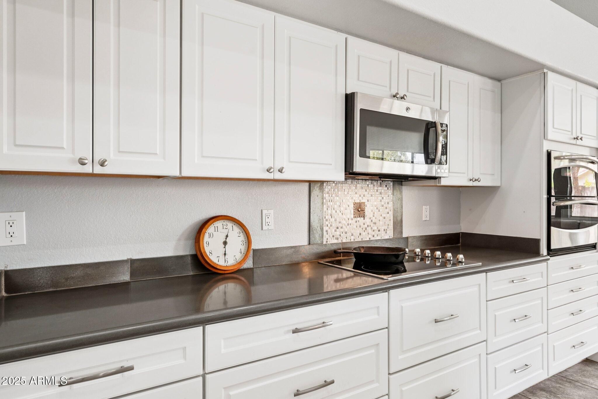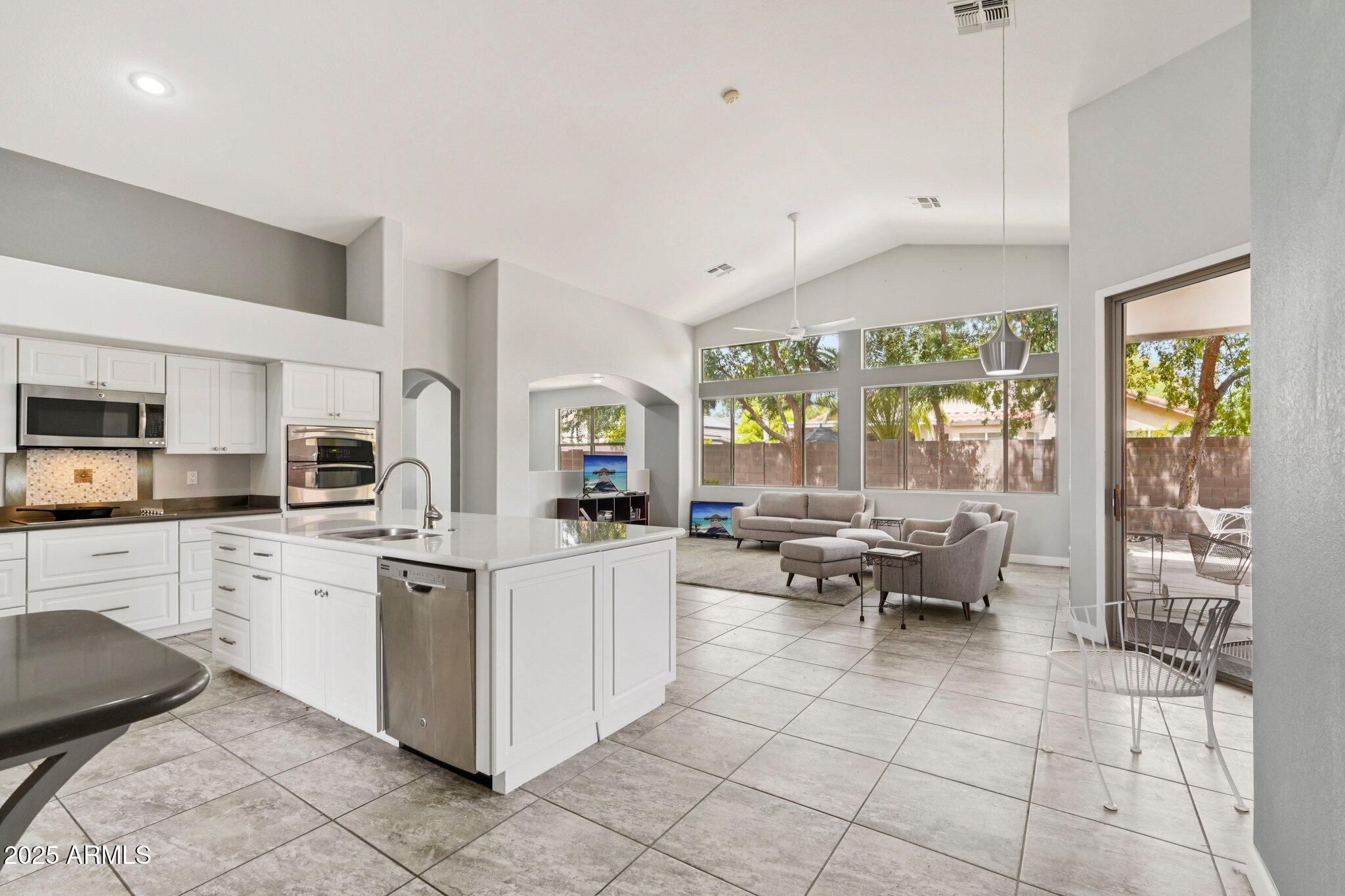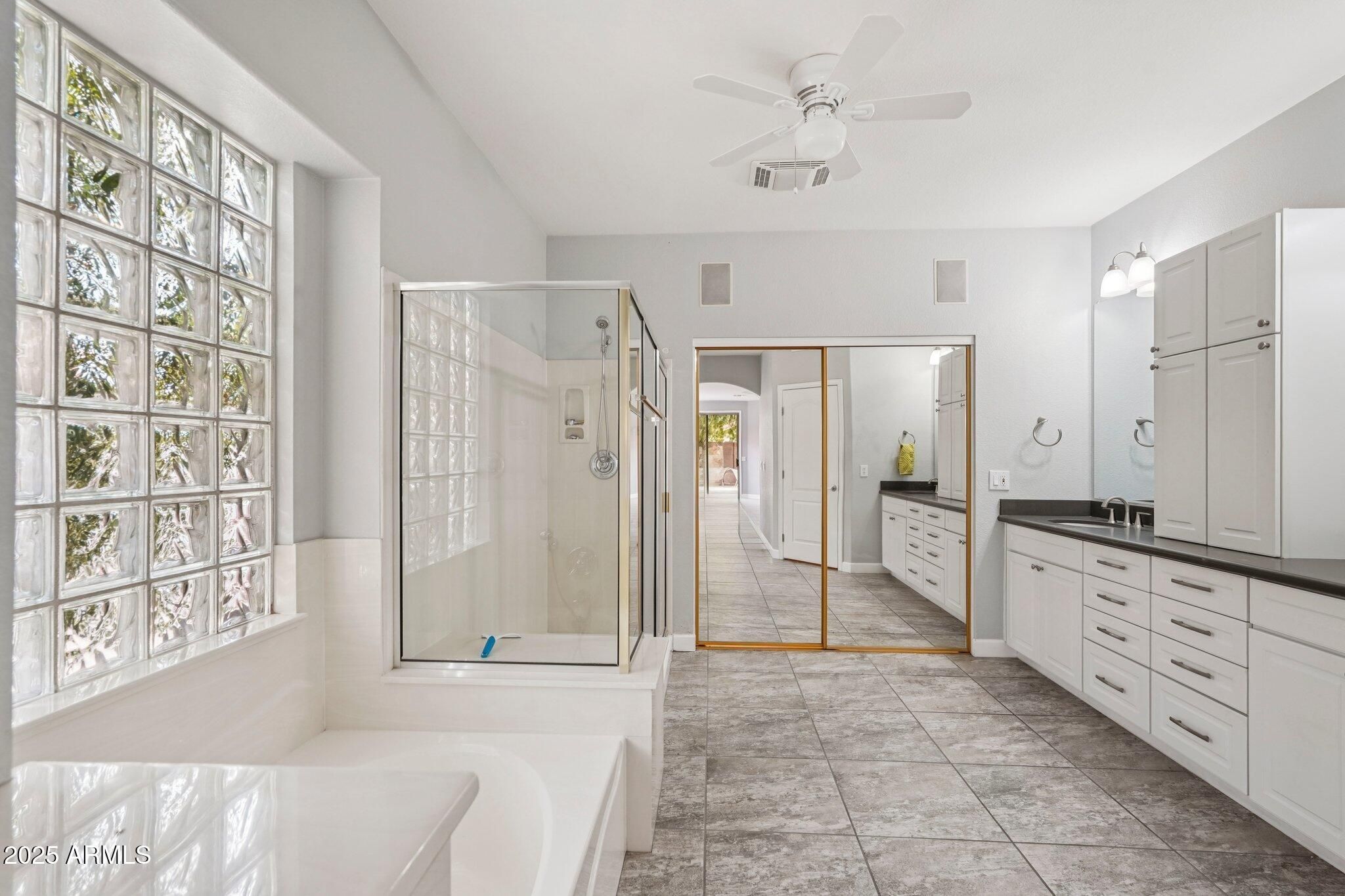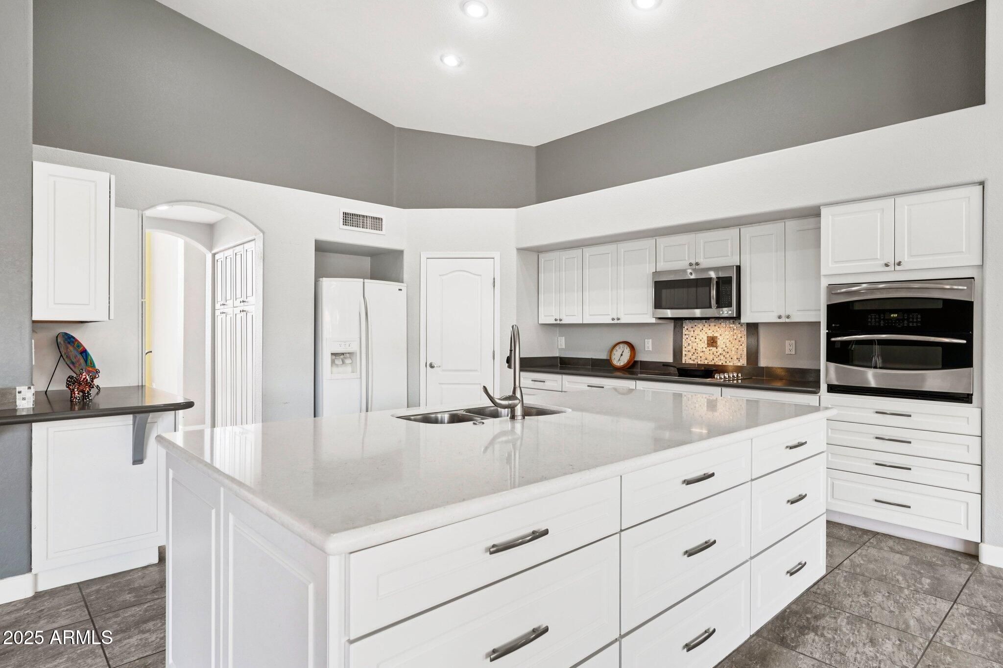 Unique home in Active 55+ Adult gated community of Arizona Traditions, Surprise, AZ. Two tone stone look porcelain floor tile throughout, soaring ceilings, one of a kind kitchen, 4 x 8 island, all large drawer bases!!! 35 drawers to be exact. Quartz counter top, new in 2023, stainless appliances. Double Oven, electric cook top, microwave, dishwasher Huge master suite with spa bathroom, separate tub and shower, 8ft vanity space with ample storage. Double, walk in, closet in master bedroom and a wall of windows to spacious back yard. Extended patio, artificial turf and pavers in rear and side yards. Loads of sun light and breeze through the mature trees which provides perfect north south exposure. Garage is extended for your golf cart.