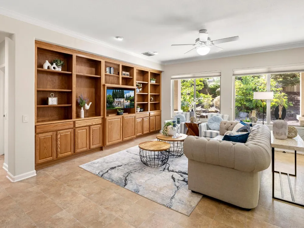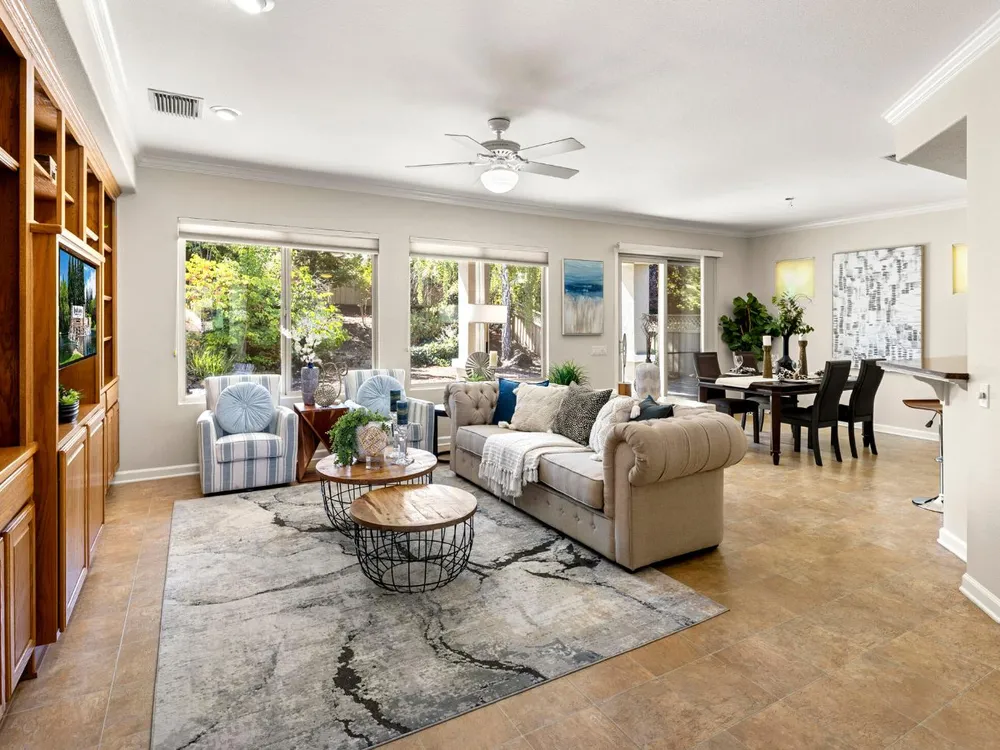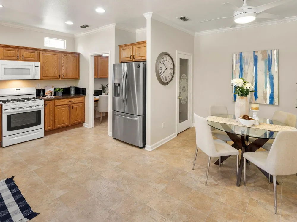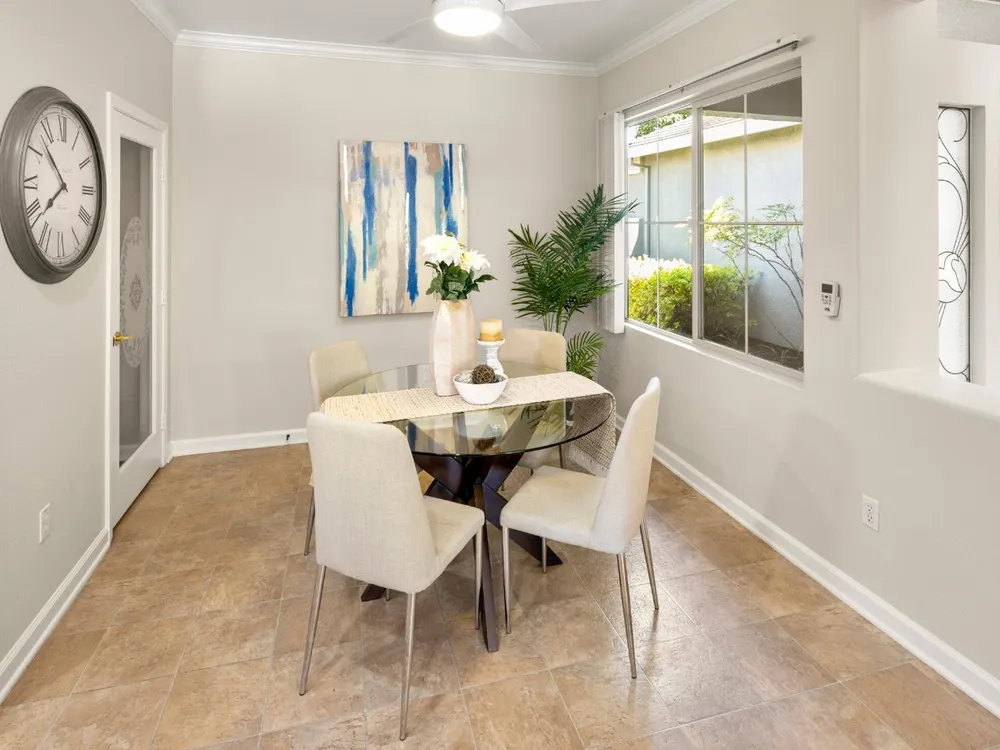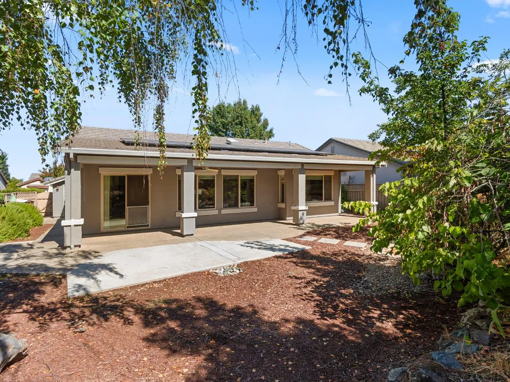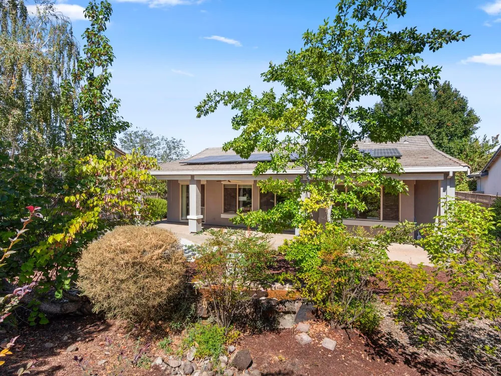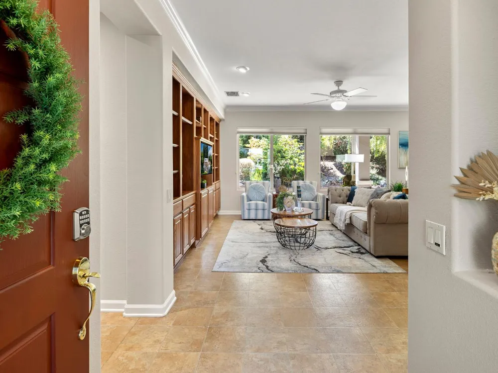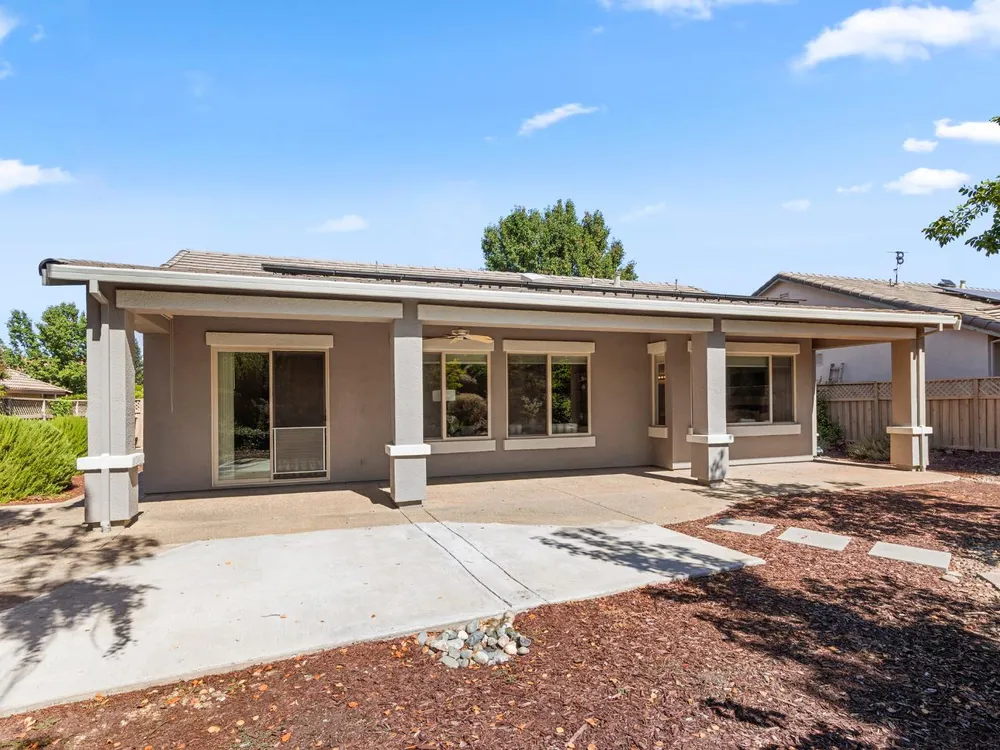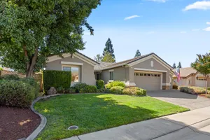 Close to the Orchard Creek Lodge and move-in ready is this 1571 sf Quail Cove plan. Architectural features include the Primary Bedroom Bay Window, the extra 1/2 car garage and Radiant Barrier Sheathing in the attic for energy efficiency! The plumbing is not original (no Kitec) and the Heating/Ventilation/Air Conditioning has been replaced. There is a leased solar which has substantially reduced the seller's PGE bills each month. This plan has it's signature 2 bedroom footprint without a den but with a 13x13 dimension at the second bedroom allowing for quite the flexibility! Also, there is a nice pantry, office, collaborative space off the kitchen where the laundry has been relocated into the garage. Visitors love the large great room with lots of light and the wall of windows framing the full back patio directing your eye out to the tranquil rear gardens and water feature! The vinyl flooring makes for easy maintenance and is consistent through the home except the bedrooms. The rear garden sprinkler system has been recently tuned up and fresh bark front and back! Pride of ownership throughout.